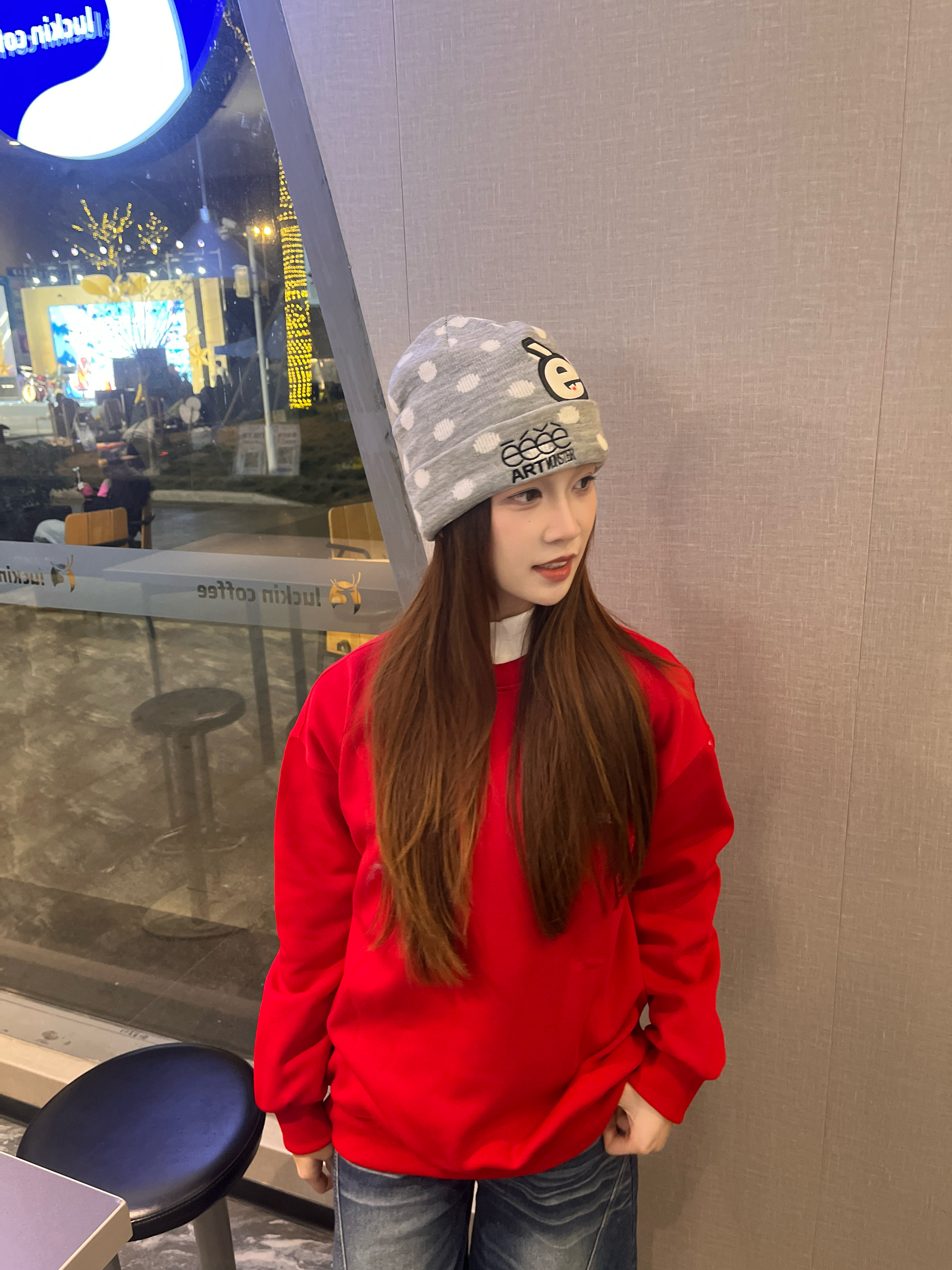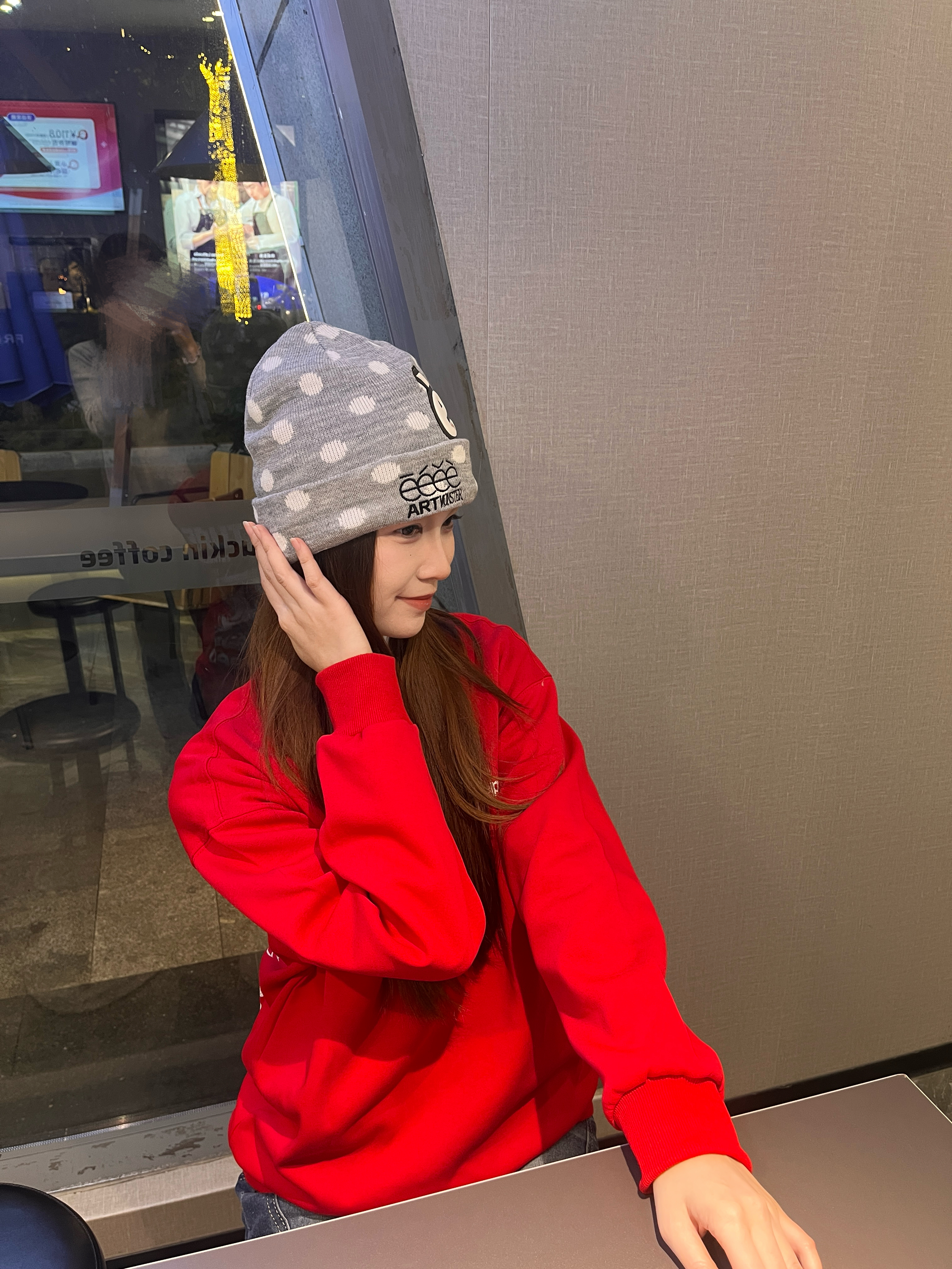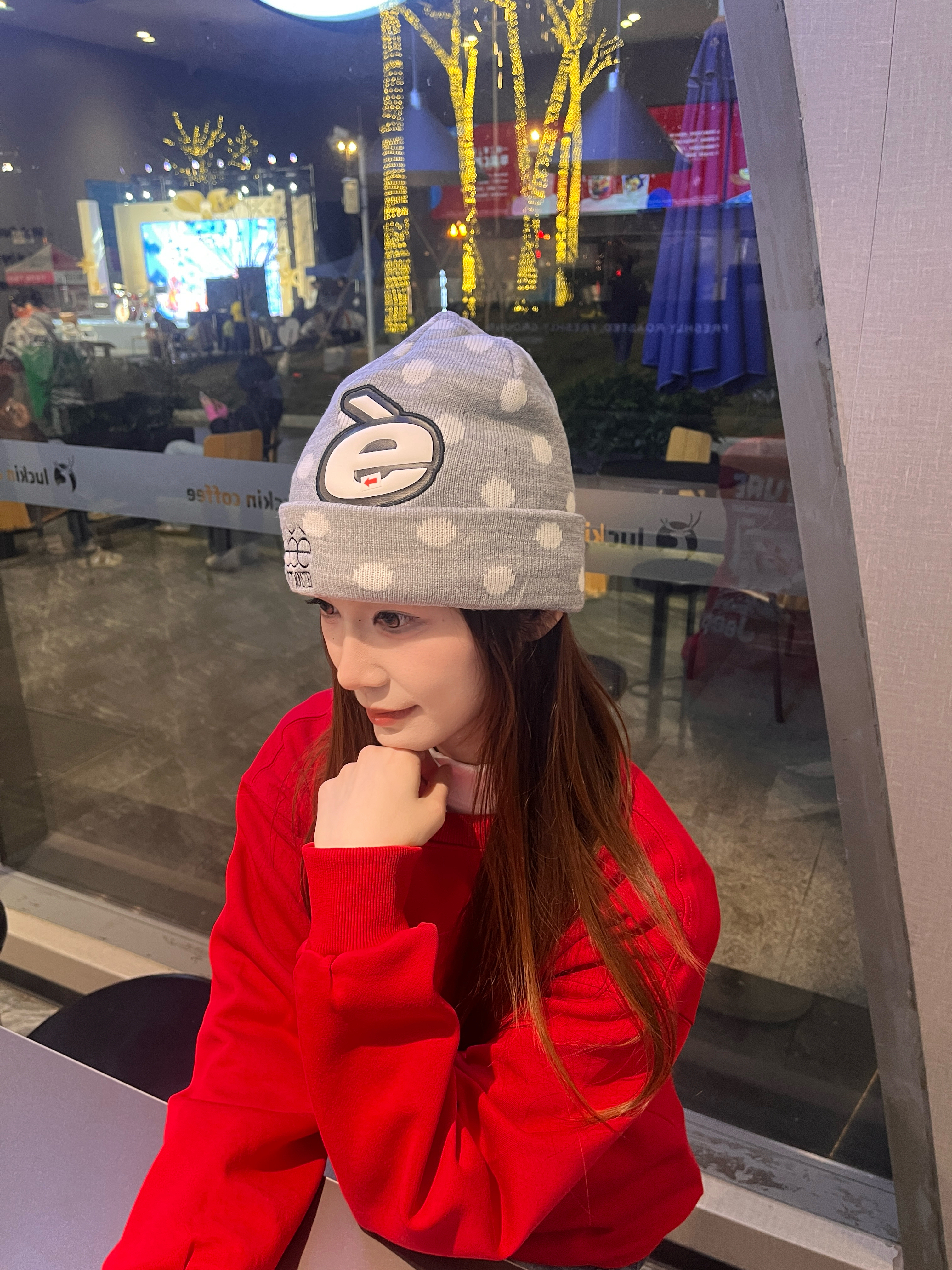 挖到宝了!这顶带e标的灰色波点针织帽也太可爱了吧,软乎乎的贴头又保暖,冬日穿搭的点睛之笔就是它~