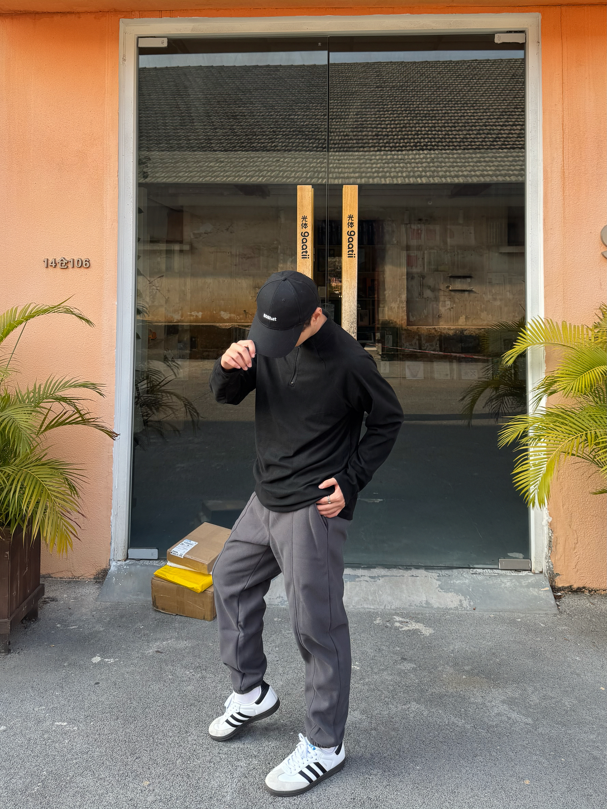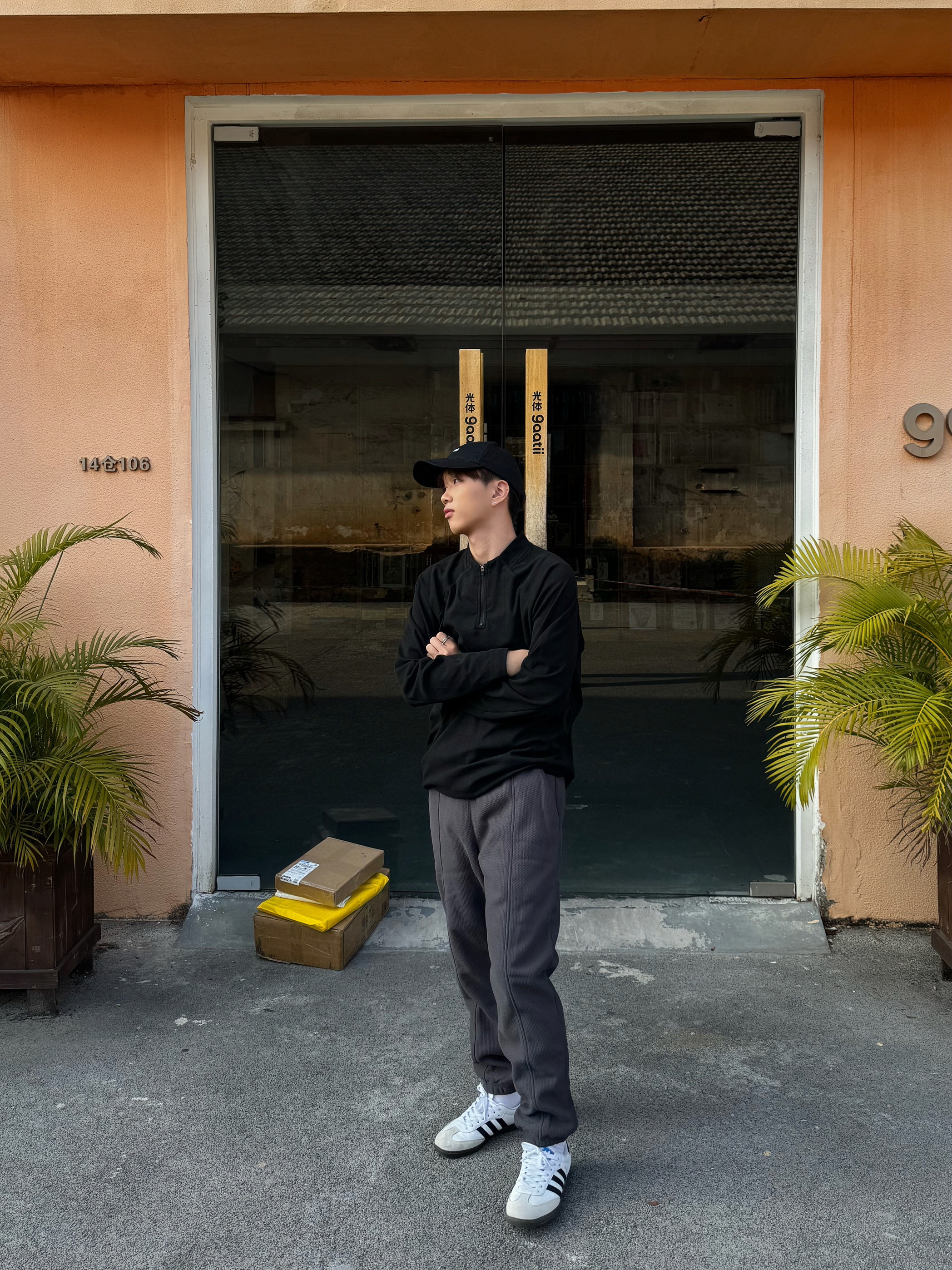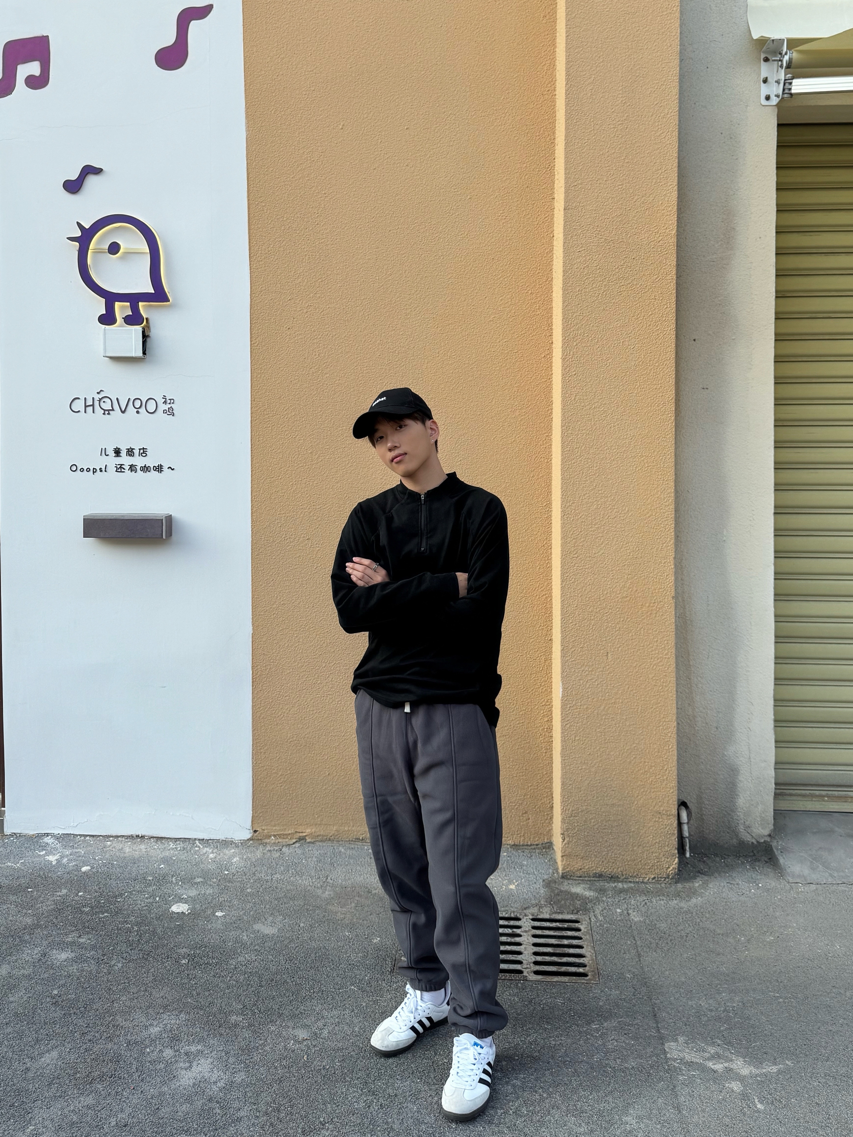 黑灰系穿搭永远是我的舒适区,黑色半拉链上衣搭配深灰休闲裤,松弛又不失利落感。踩一双经典白鞋做点缀,再戴顶黑帽压一压造型,不用费心思的搭配,却能把街头慵懒感拉满,日常出门这么穿,自在又出片~