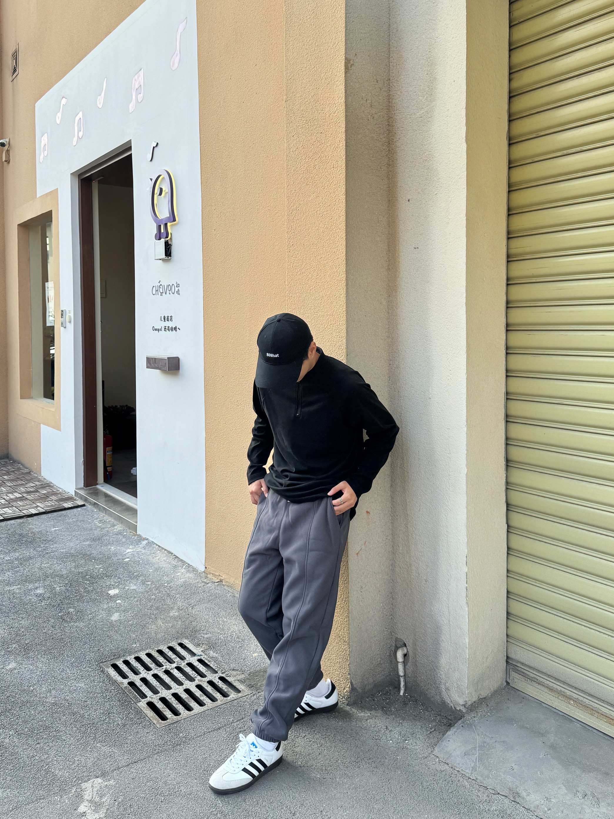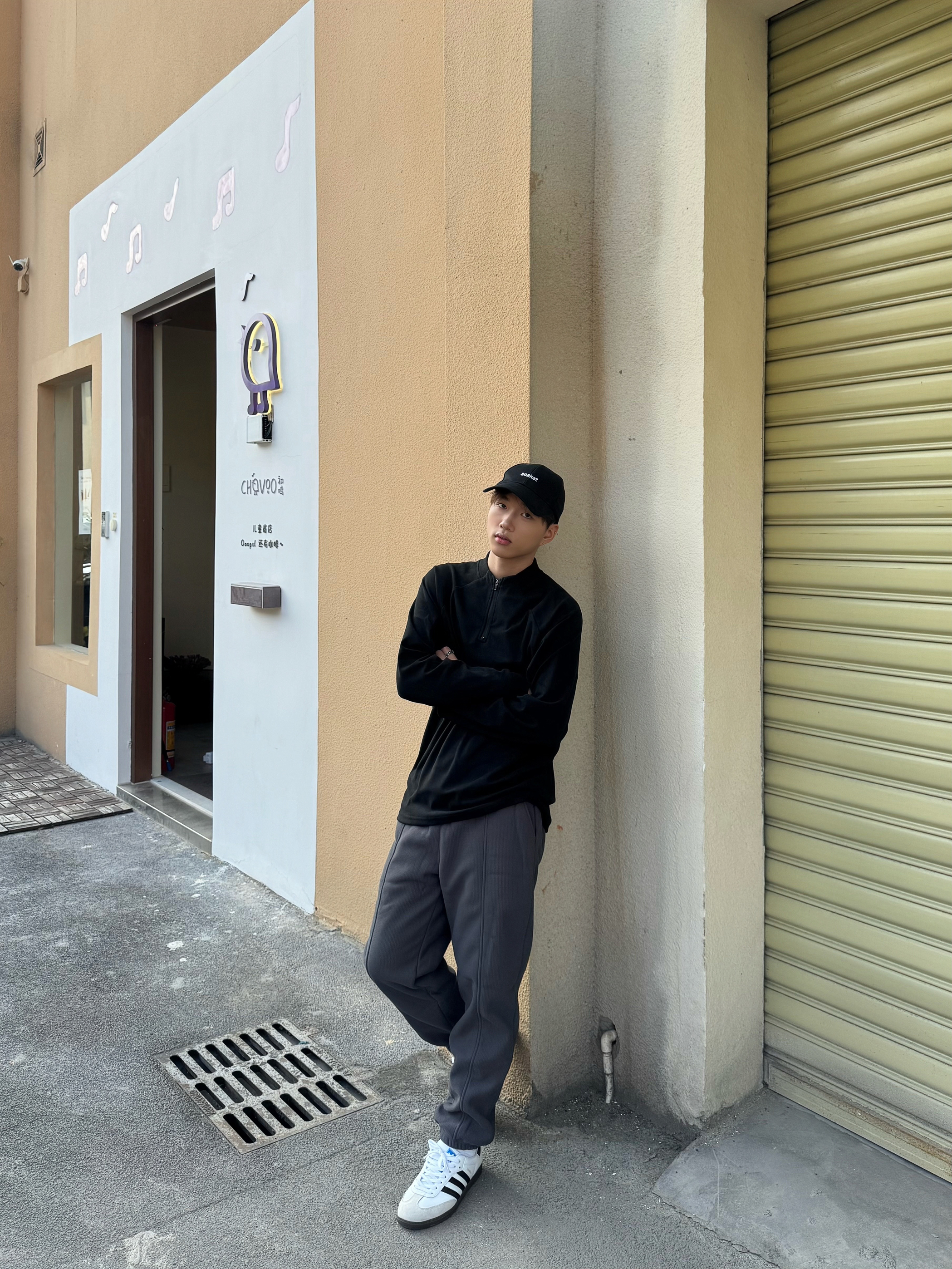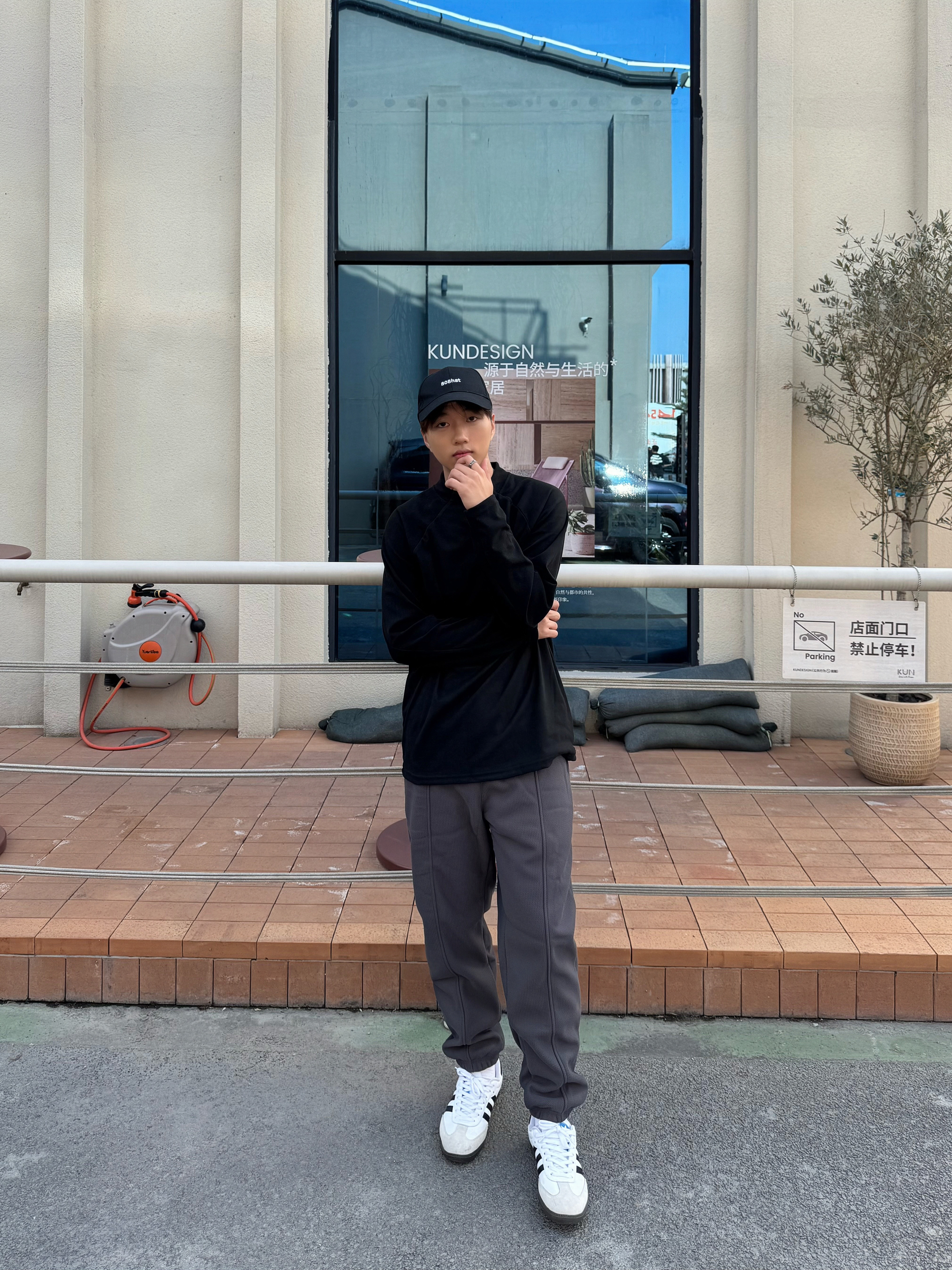 黑灰系穿搭永远是我的舒适区,黑色半拉链上衣搭配深灰休闲裤,松弛又不失利落感。踩一双经典白鞋做点缀,再戴顶黑帽压一压造型,不用费心思的搭配,却能把街头慵懒感拉满,日常出门这么穿,自在又出片~