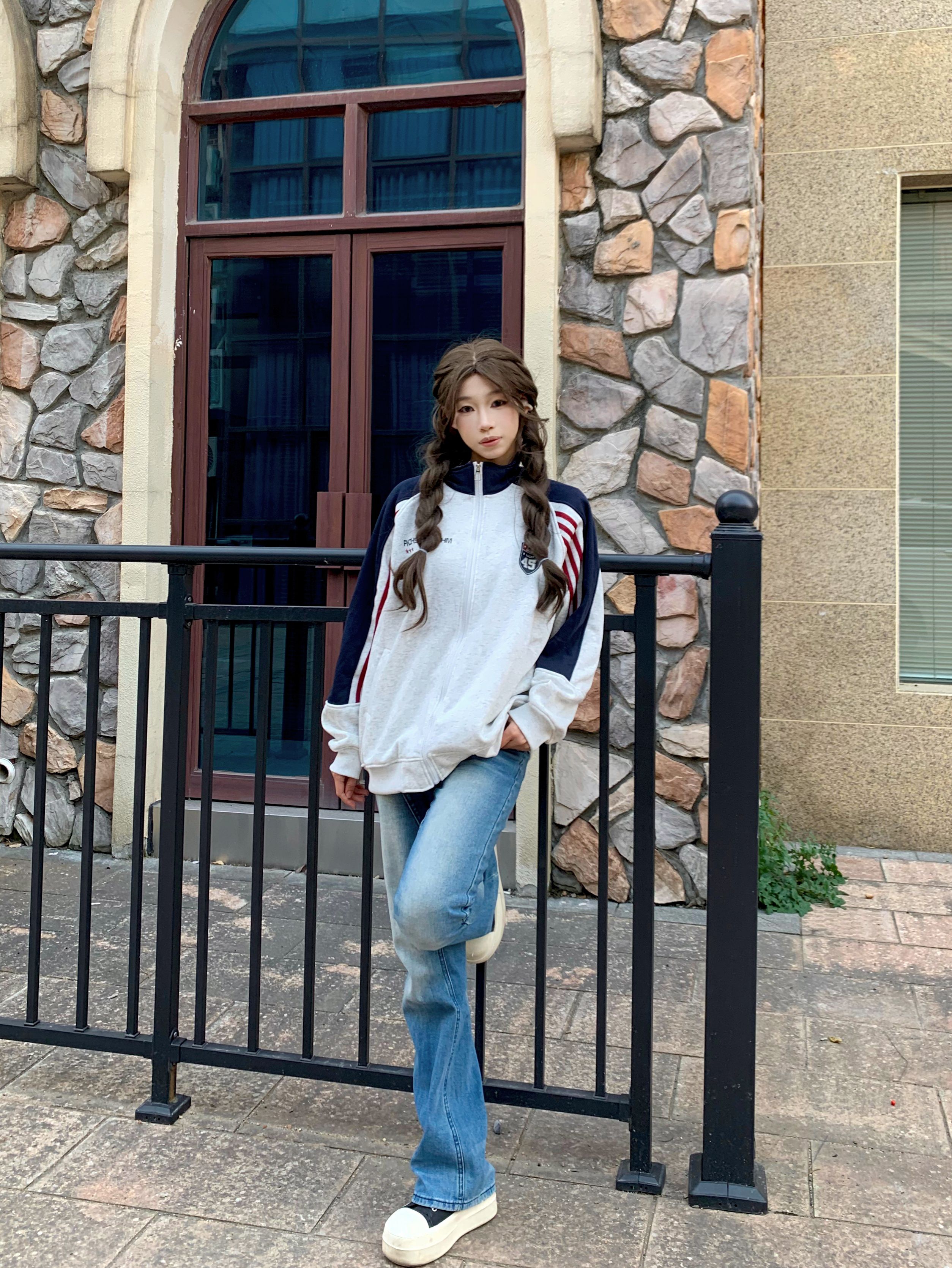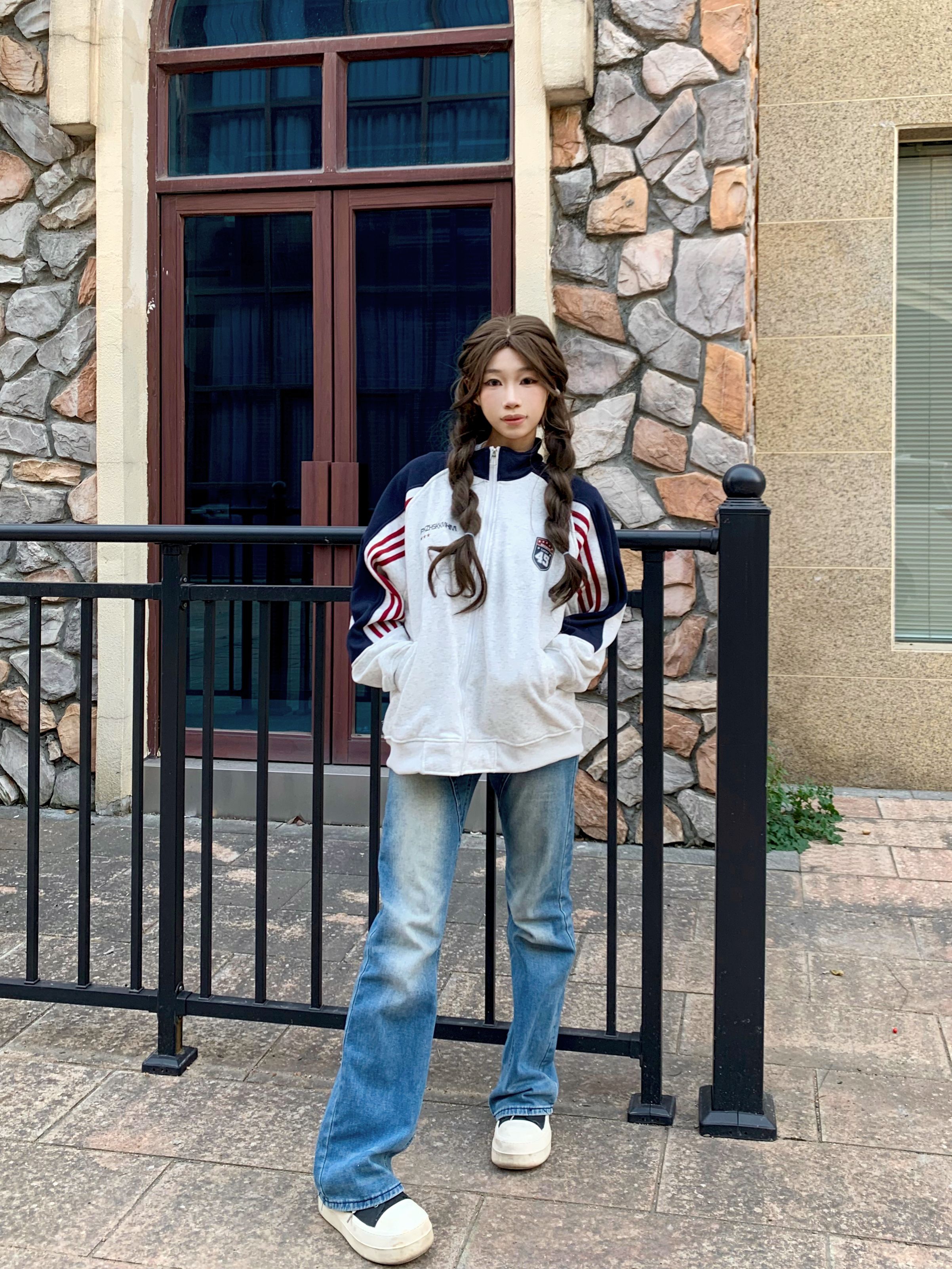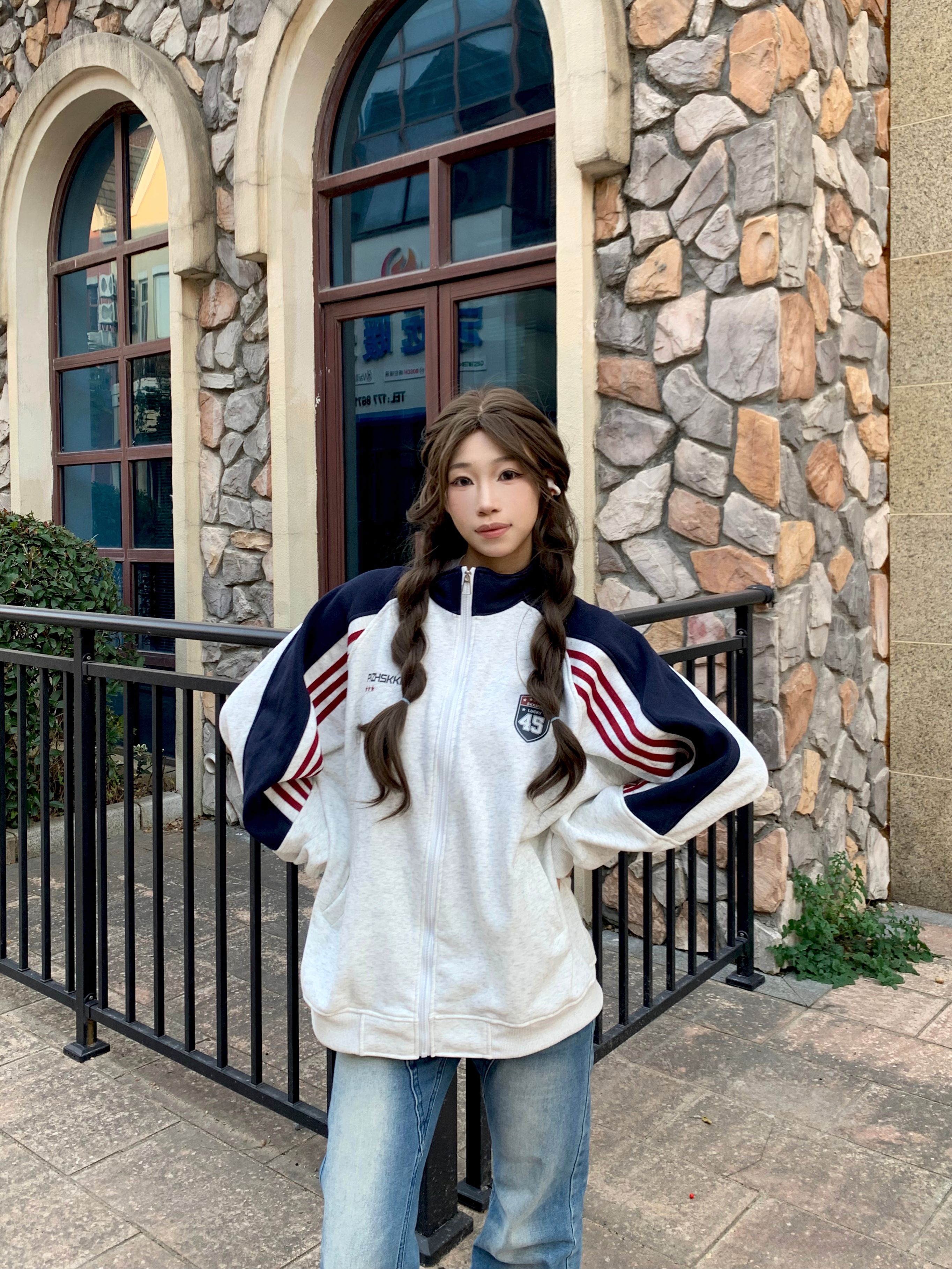 - 🔹撞色拼接设计超有少年感,手臂处的红白条纹是点睛之笔,美式复古那味儿一下就出来了~ - 立领拉链款太戳我了!拉到顶是甜酷辣妹,拉开半拉链搭个白T恤,慵懒氛围感直接拉满❤️💙 - 面料是那种软软的毛圈棉,贴身穿都不扎皮肤,宽松的oversize版型把肉肉全藏住,120斤穿都显瘦😜 - 我身高160cm,穿M码长度到胯部,搭配直筒牛仔裤+厚底鞋,比例瞬间被拉长,小个子也能驾驭~ -...