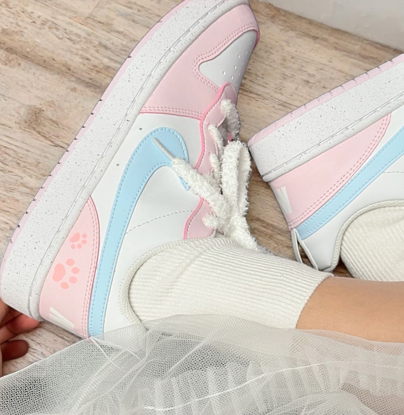 鞋身的樱花粉调调粉乎乎的,乖甜感直接拉满,黄皮上脚也超显白~最戳我的是鞋侧的喵爪印花,软萌又可爱,少女心直接爆棚!而且还带了两幅鞋带,粉蓝撞色鞋带搭夏日碎花裙超清新,纯粉鞋带配牛仔裤又很元气,能根据穿搭和季节换着搭,解锁N种风格~ 我平时穿37码,选正码上脚刚合适,鞋头的空间很宽松,不会挤脚,鞋底的弹性也够日常逛街,舒适度完全在线。粉蓝配色加上萌萌的喵爪设计,真的让人拒绝不了! 你们觉得这...