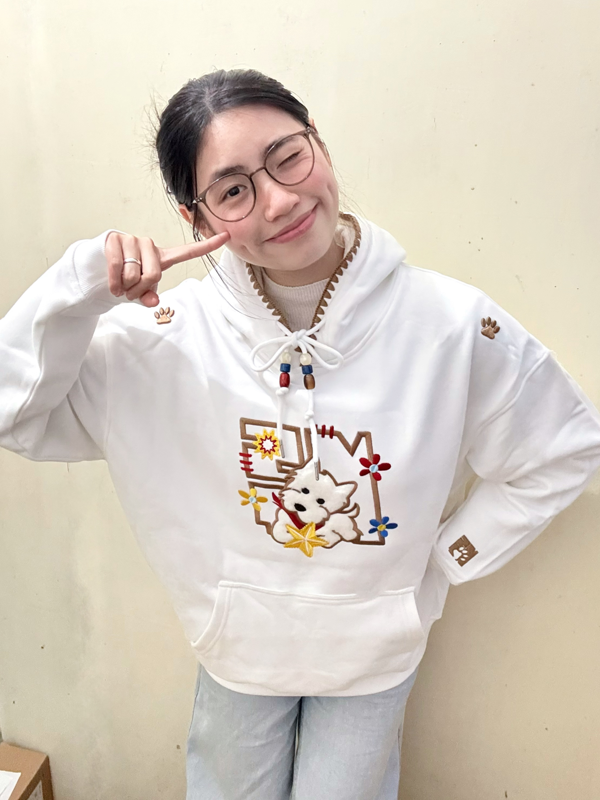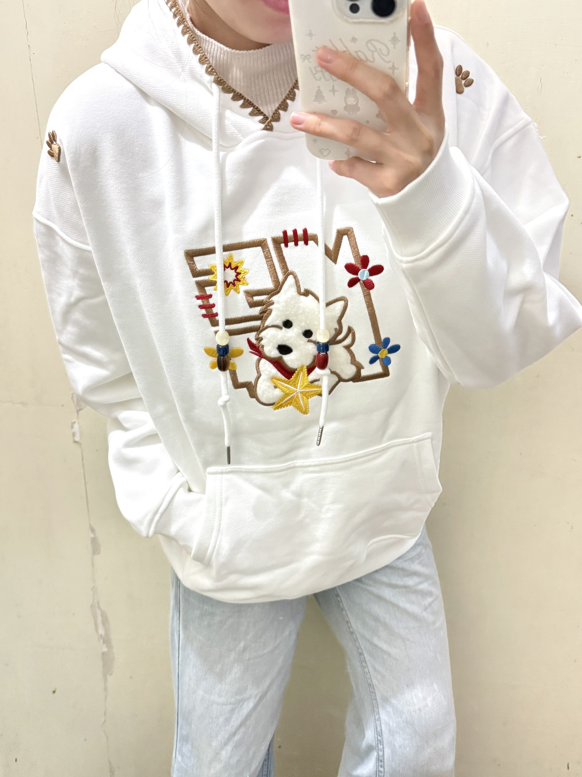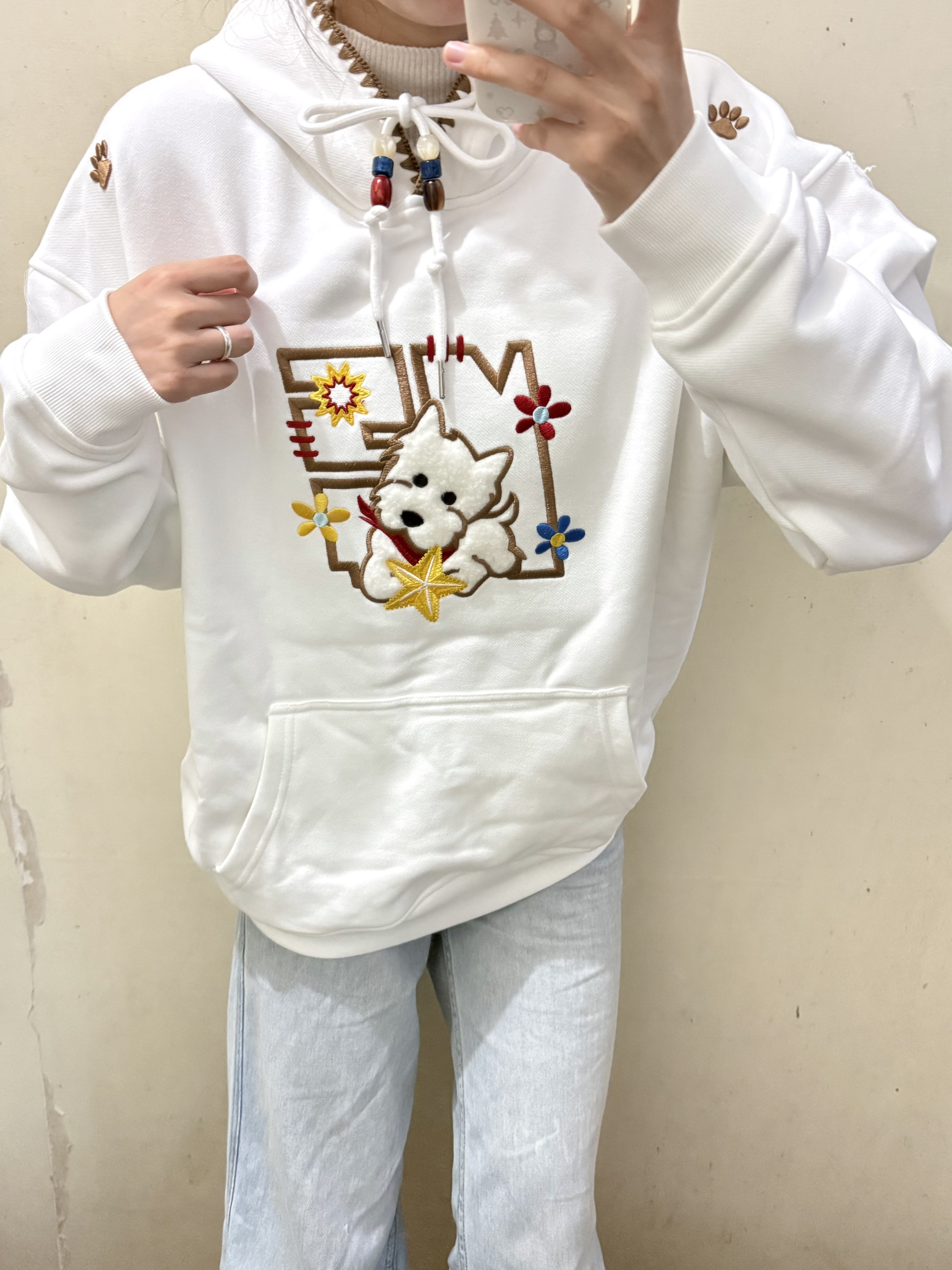 166 102穿的是M码 内里是加绒的 胸前做了一个西高地的刺绣 我太喜欢了 袖口还有一个经典logo小标 可以搭配牛仔裤穿哦~