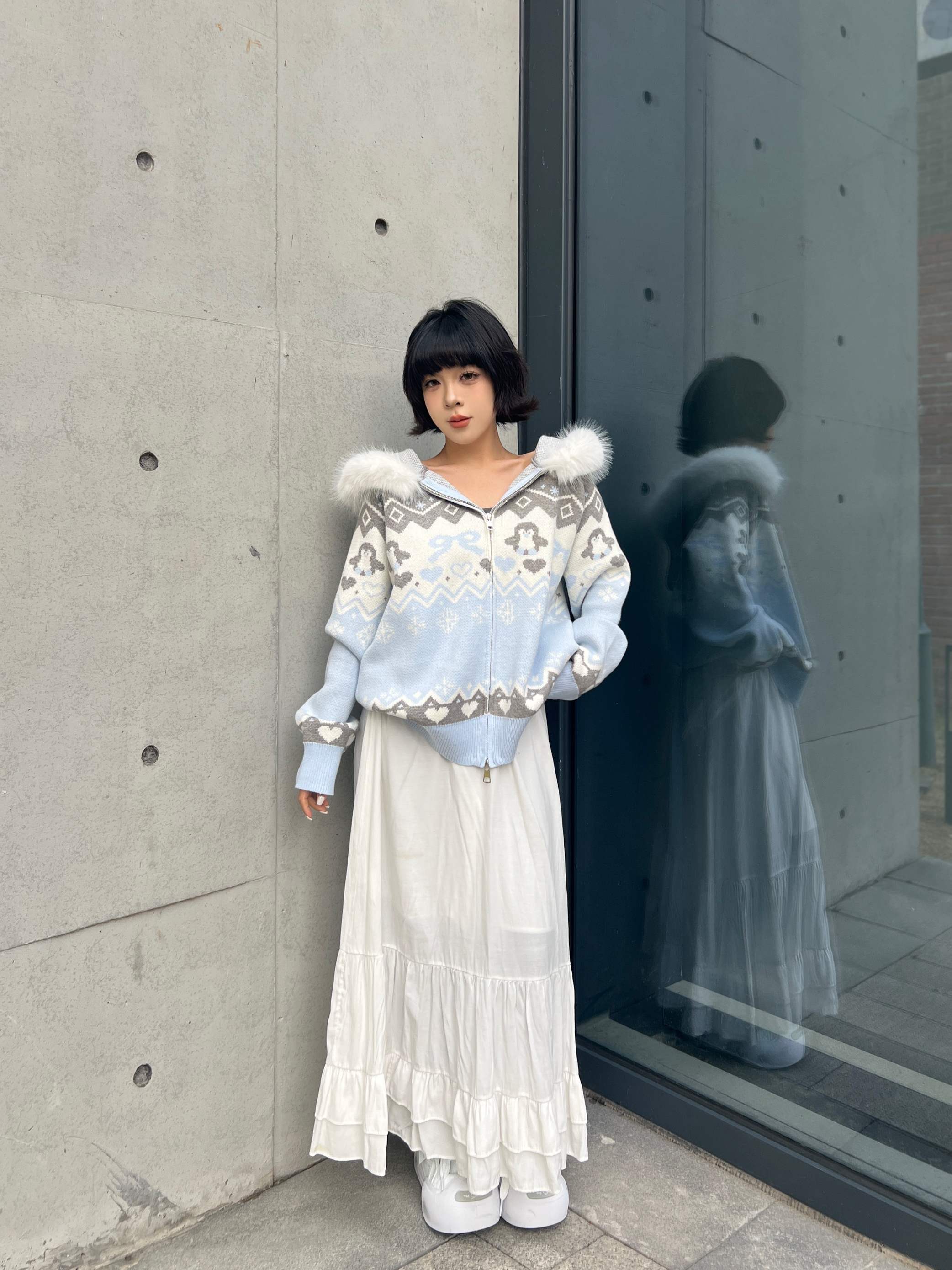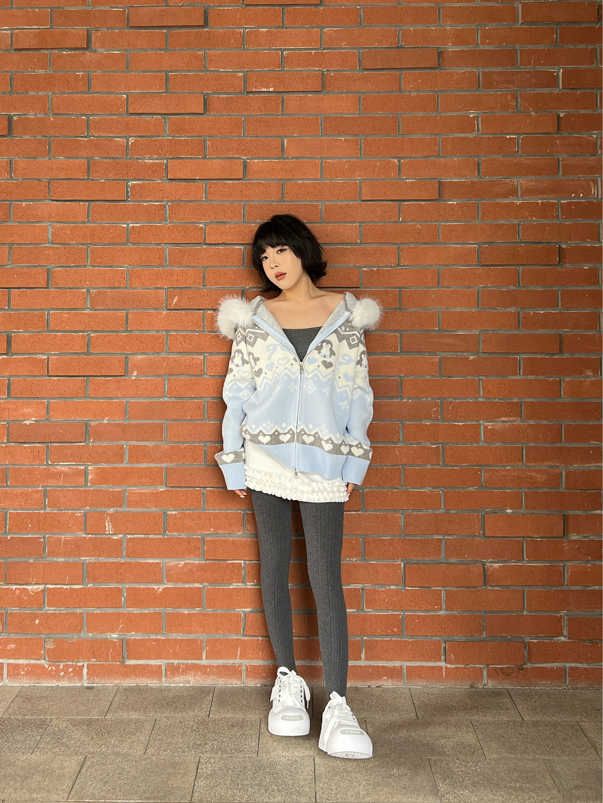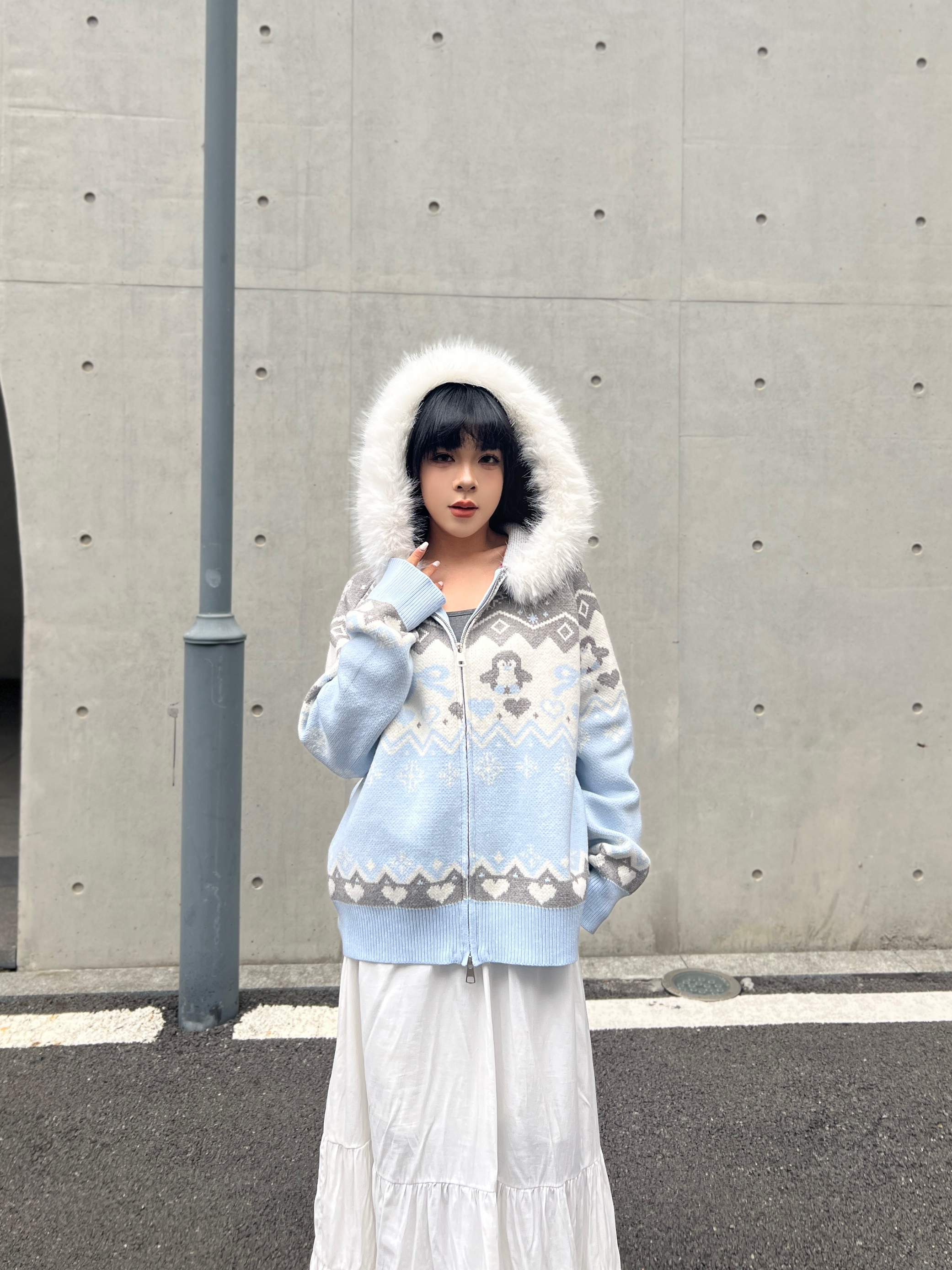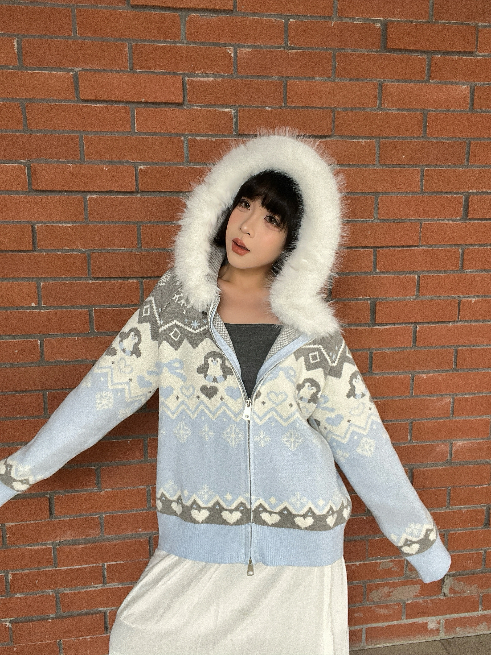一到秋冬就很爱穿费尔岛毛衣~浅蓝色的也很出乎我的意外,上身就很温柔减龄❄️感觉也很适合下雪的时候穿! 贴身穿很亲肤,帽子上的毛也很软~几何提花图案又带点复古腔调,随便搭条裙子就很出片,秋冬氛围感直接拉满✨ 这种慵懒又精致的穿搭,约会、日常通勤都很合适,怕冷的姐妹里面搭件保暖服,层次感和保暖度都有了~