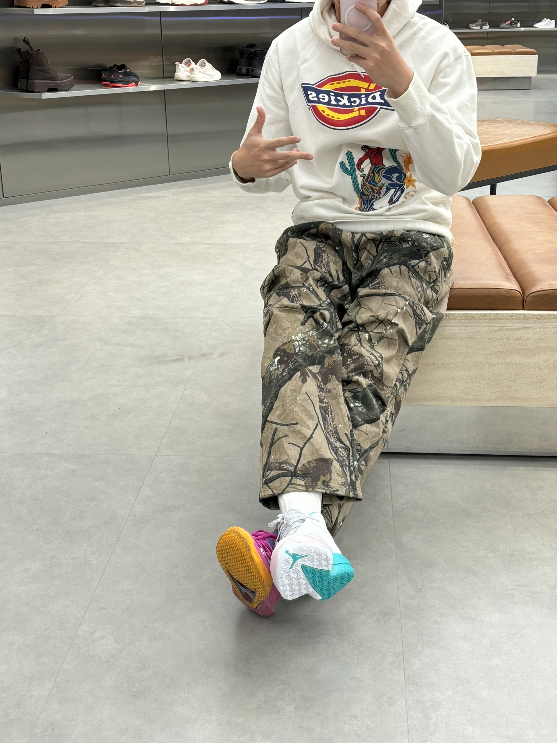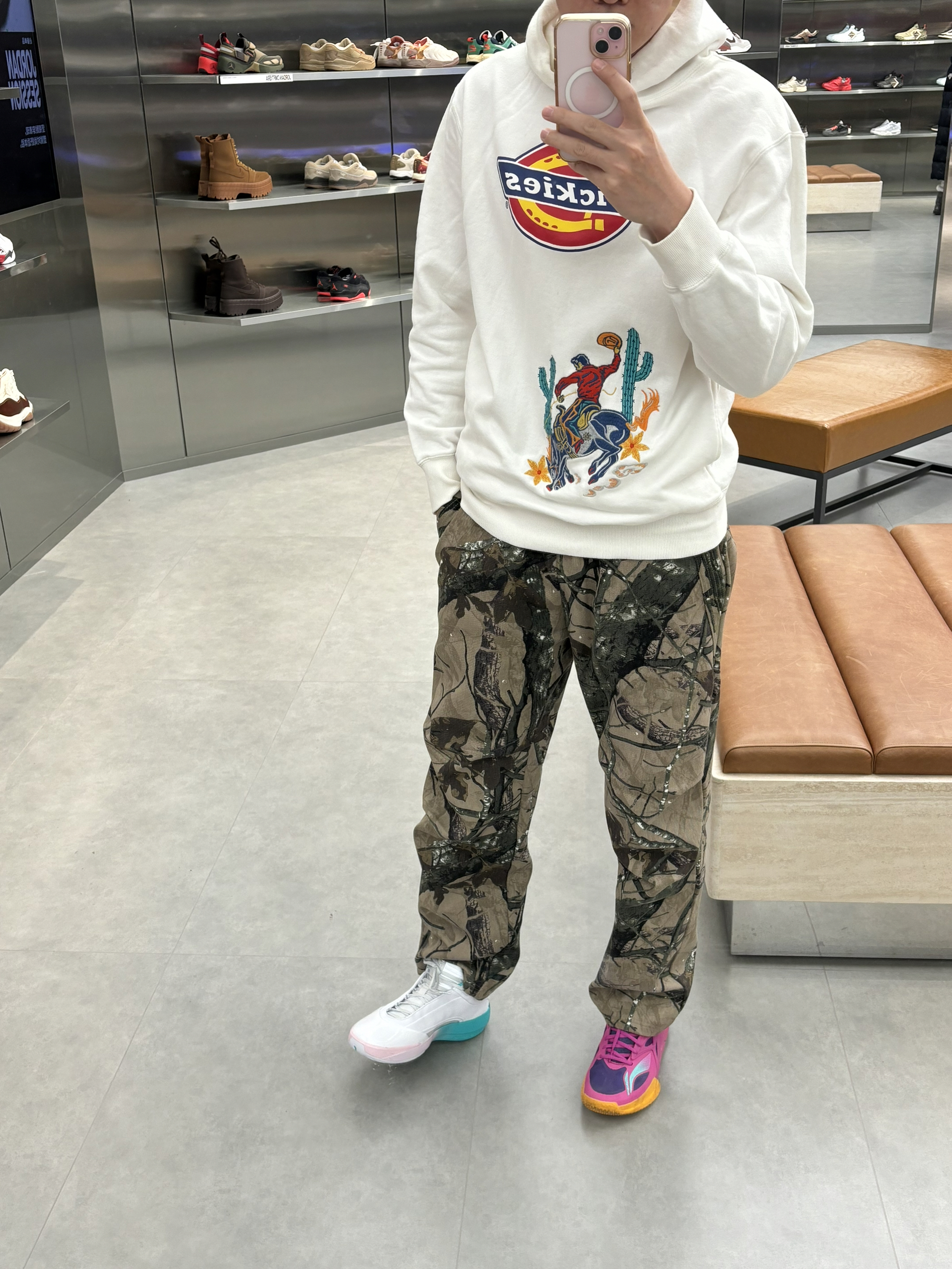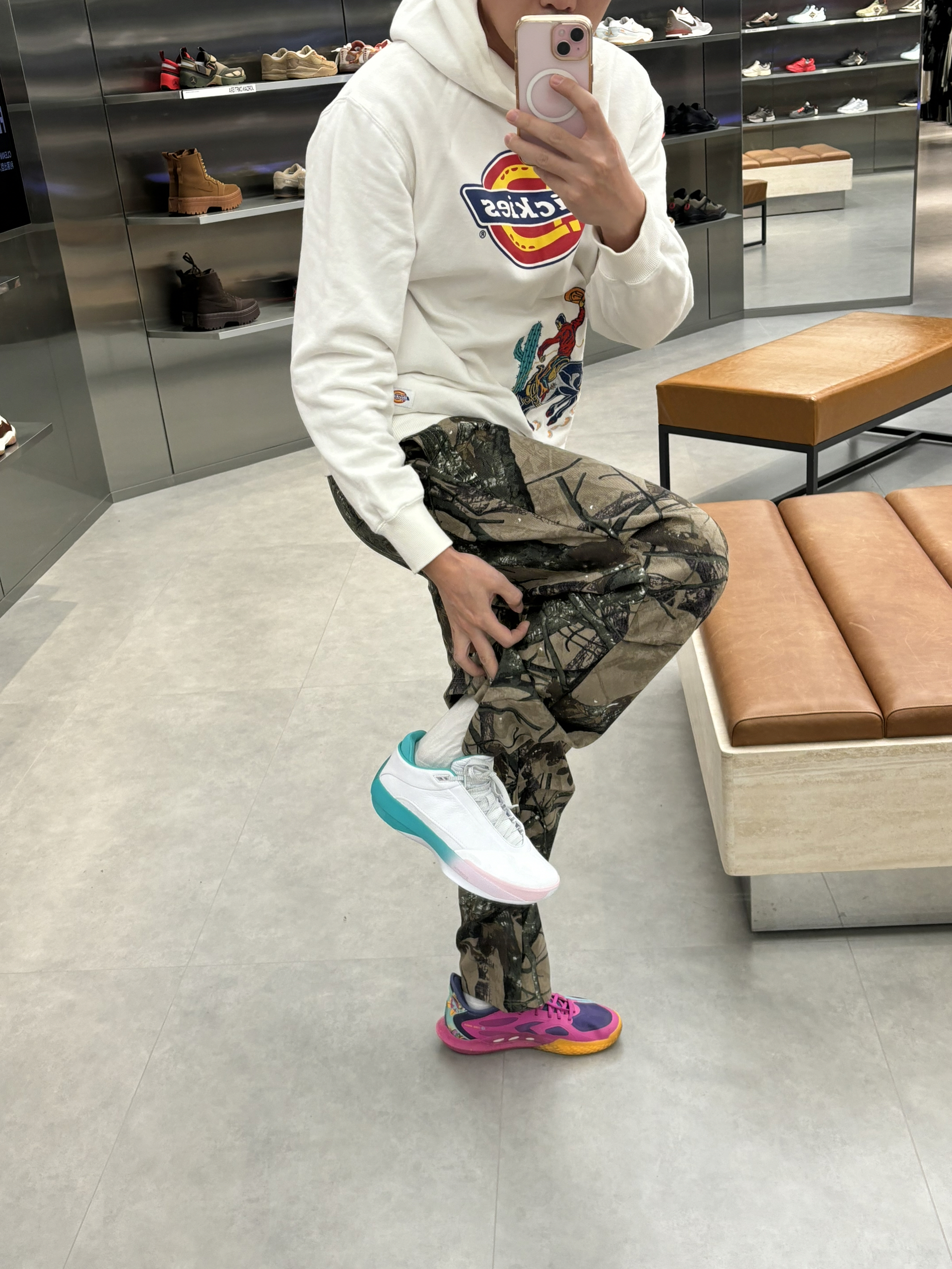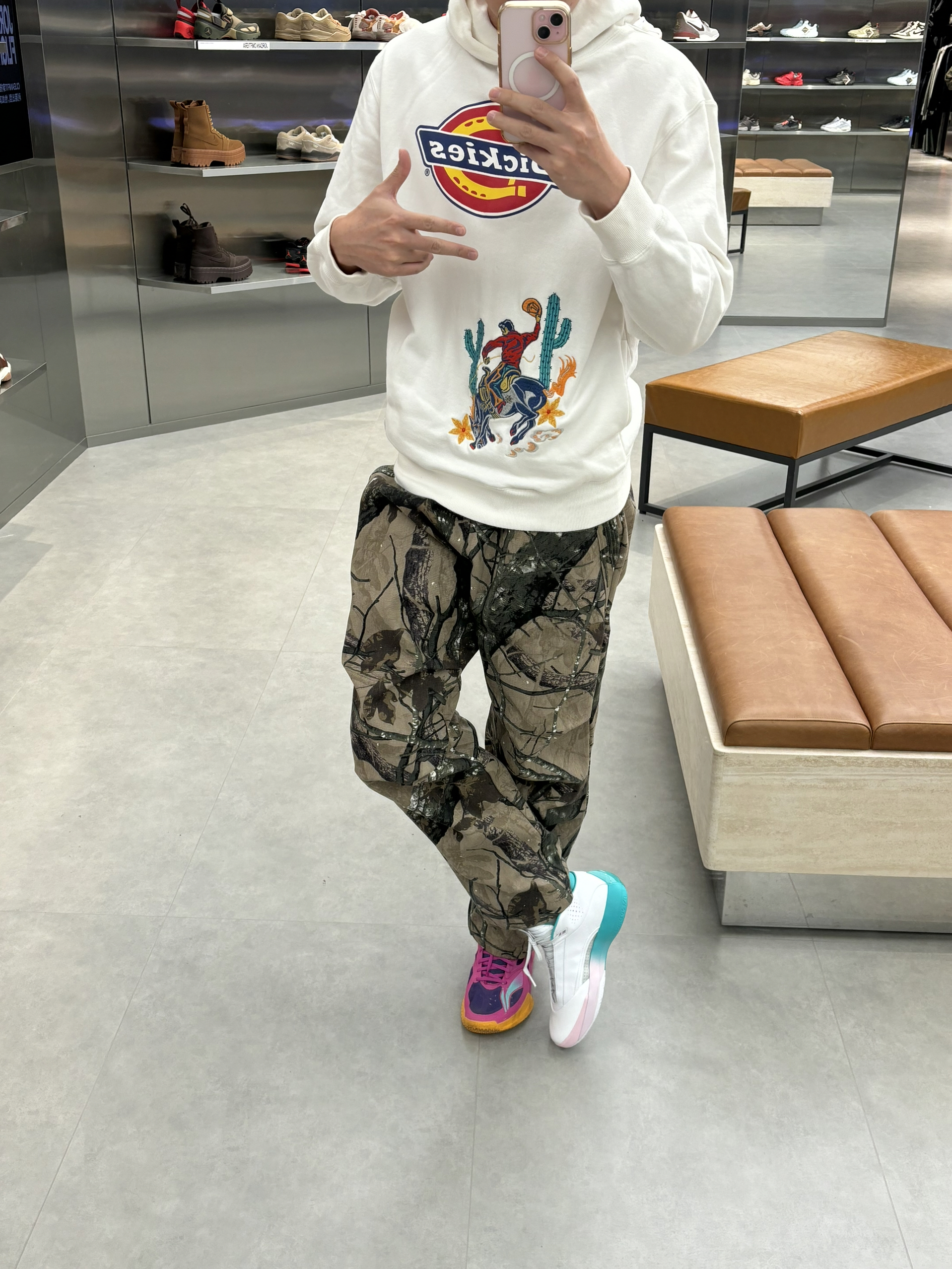 我的基础款不无聊 我的上班通勤就穿这一套了 很基础的卫衣也是马年的西部牛仔风 搭配不基础的迷彩直筒裤 后跟保暖还很硬汉的感觉 有层次感还很户外的味道啊 aj40郭艾伦首尾呼应,这一套舒服又不无聊