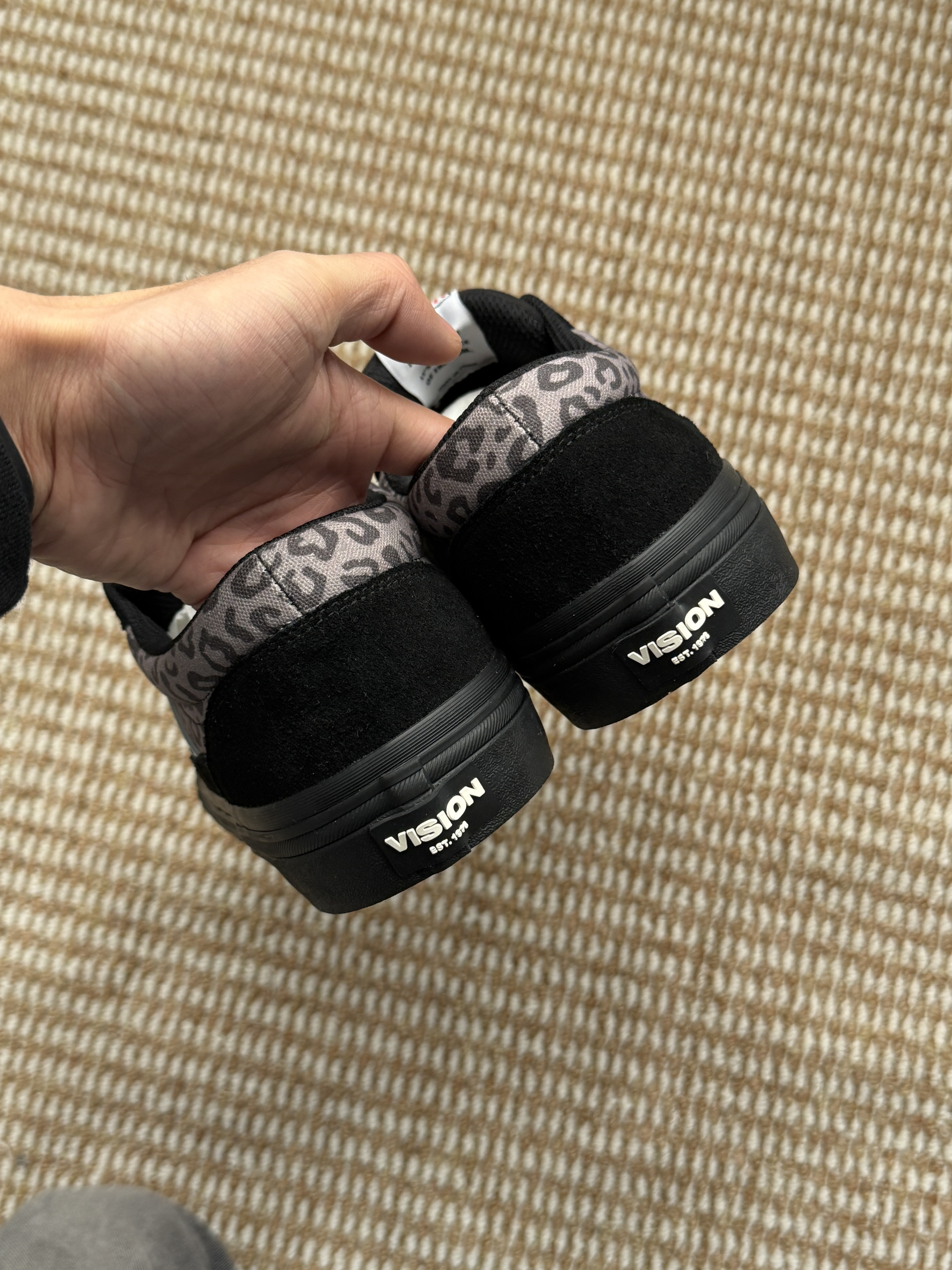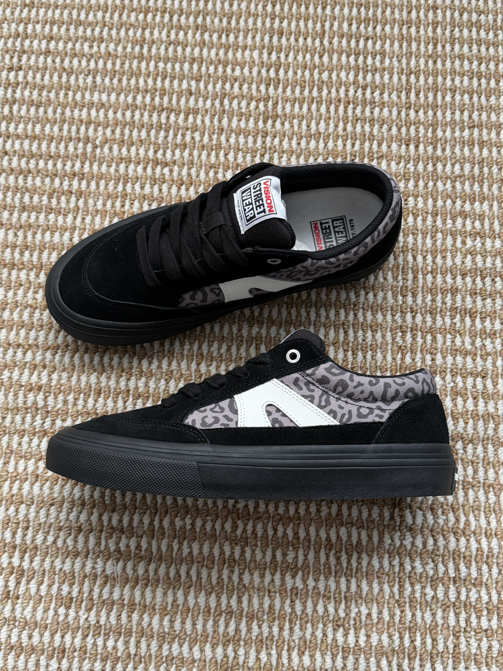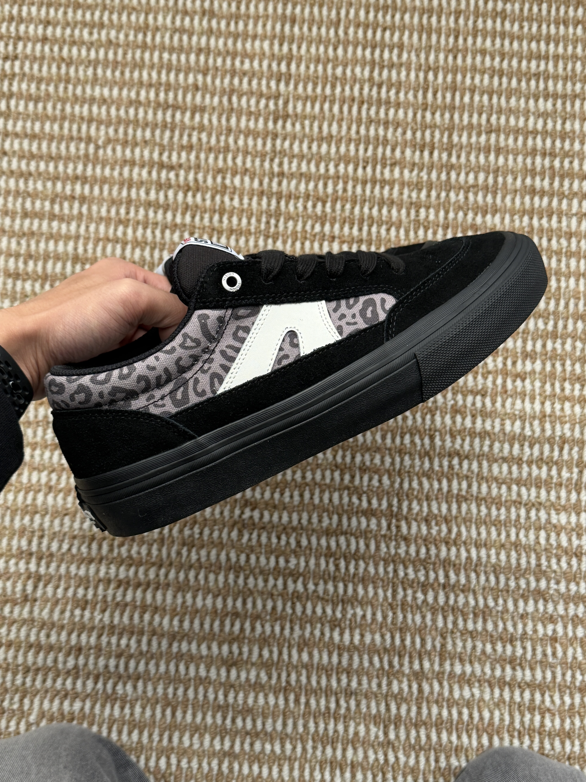 刚入手的Vision豹纹板鞋,黑灰豹纹拼接也太有街头感了!翻毛皮的材质摸起来质感超棒,上脚软软的,搭工装裤、牛仔裤都超合适~