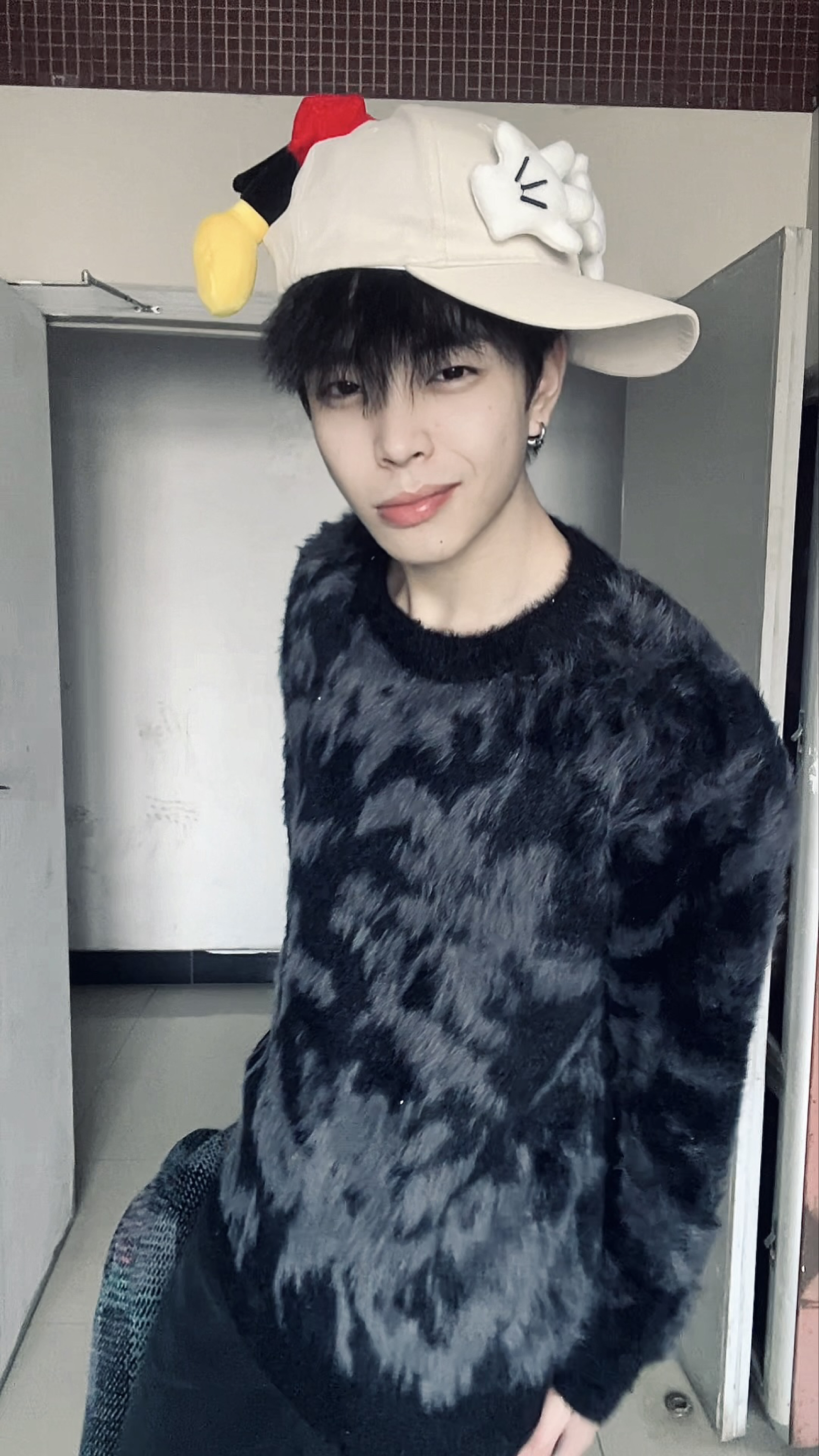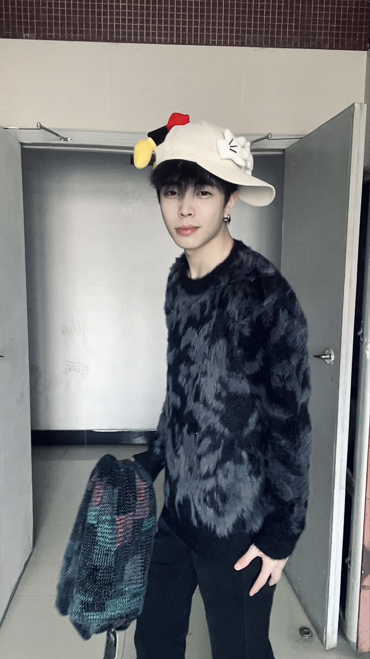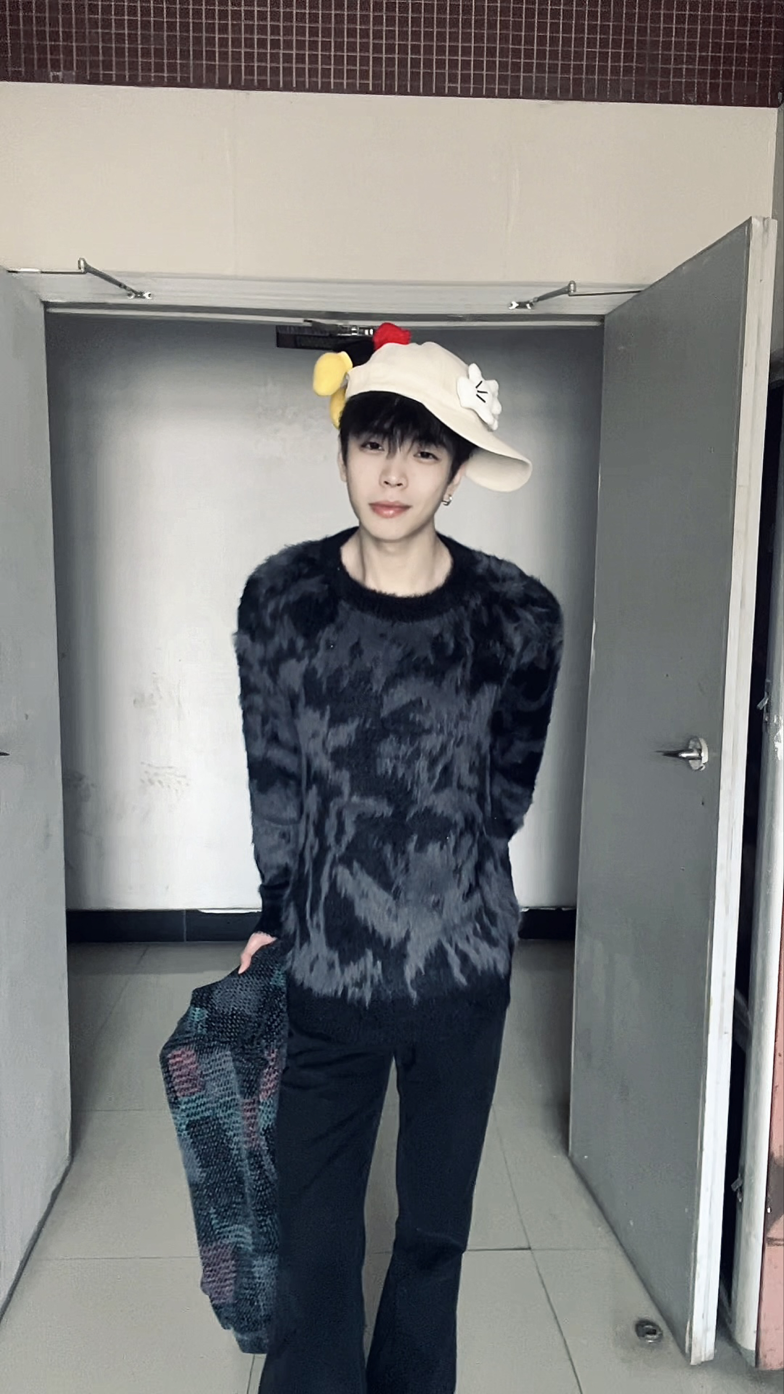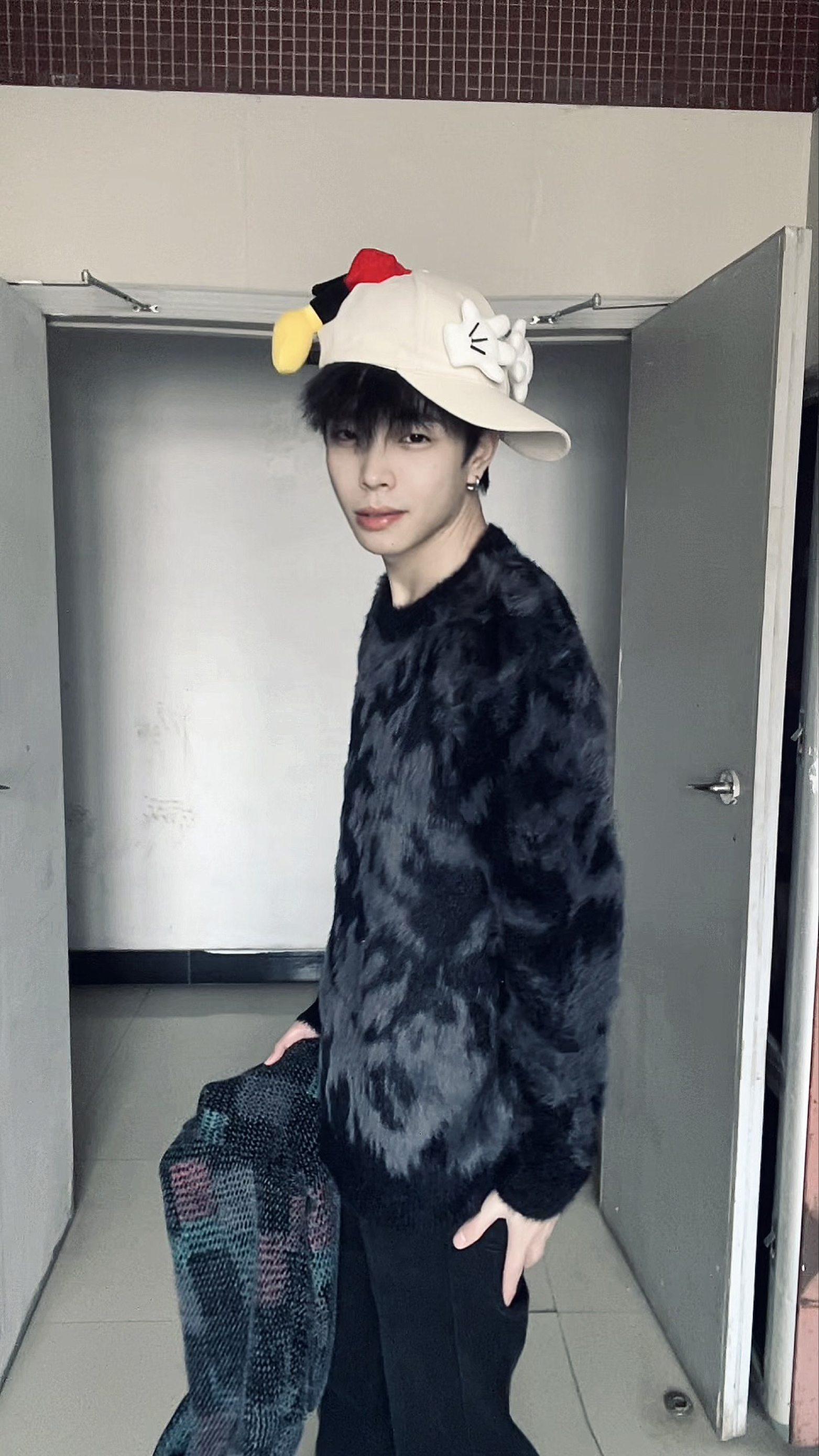 这套穿搭把“温暖与个性”揉得恰到好处。黑色毛绒纹理毛衣是绝对的主角,软糯的毛绒面料摸起来超舒服,贴身穿也毫无扎肤感,自带的纹理让纯黑造型不会显得单调,还添了几分慵懒的贵气感,宽松的版型对身材包容度拉满,藏肉又自在。搭配的黑色微喇裤延续了简约的调性,利落的线条中和了毛衣的蓬松感,让整体造型不会显得臃肿,上下同色的搭配还悄悄拉长了身形比例。 最出彩的是那顶带卡通装饰的帽子,俏皮的小配饰打破了全黑穿搭...