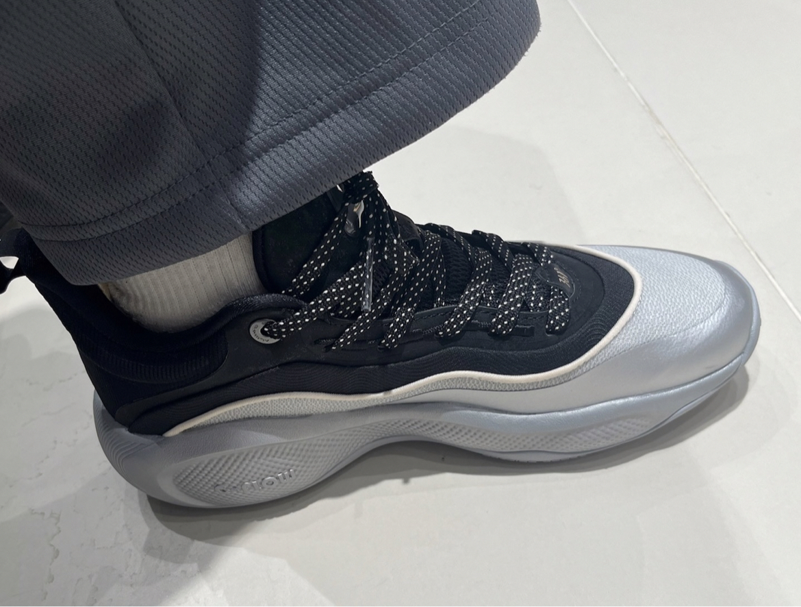 361° AG6黑银上脚初体验!颜值是真的顶,黑银配色质感拉满。鞋底做了多点受力的凸起设计,能感觉到支撑,但第一脚偏硬还有点虚位感,鞋楦偏紧,脚宽兄弟慎选,先磨合看看后续表现~