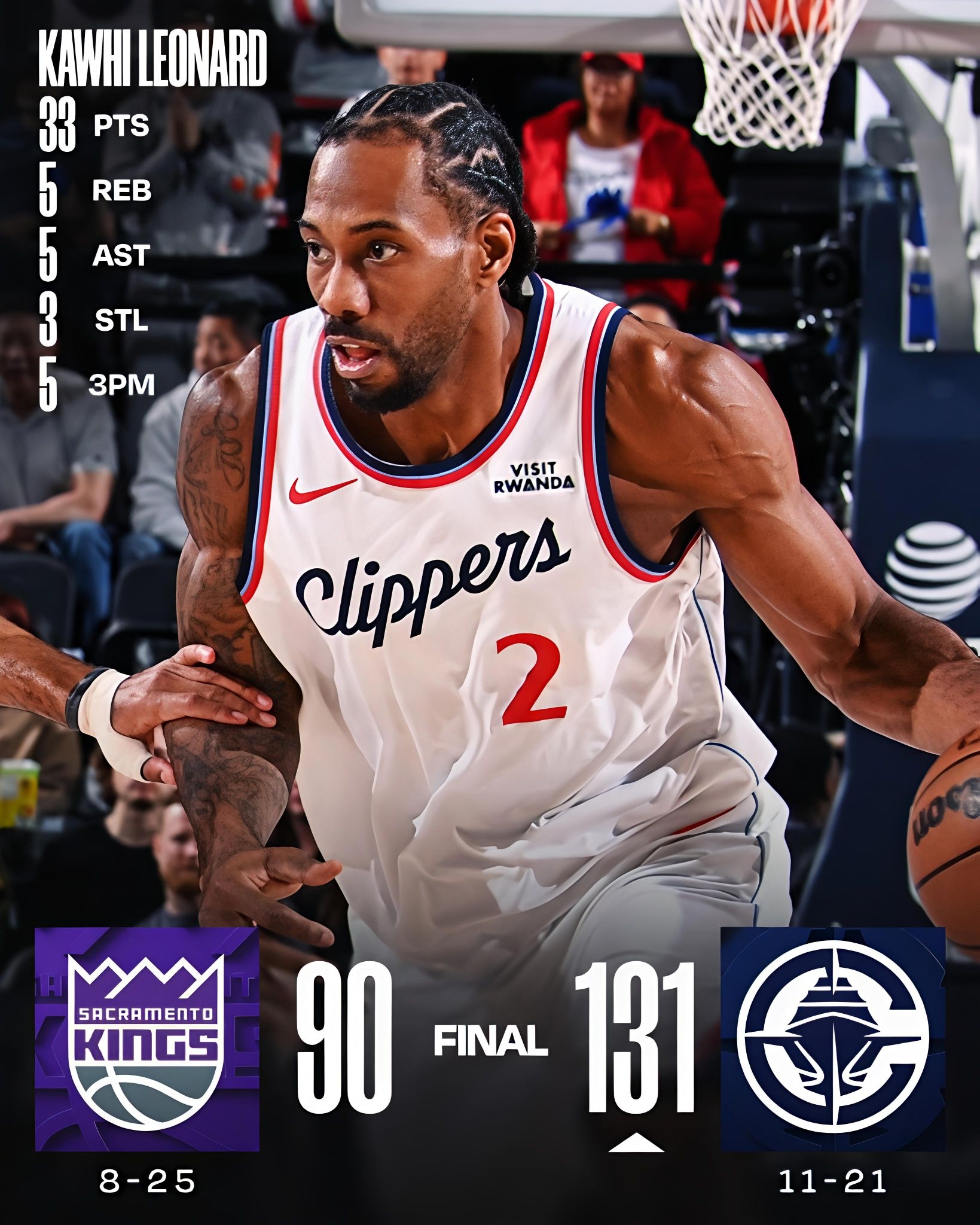 伦纳德今日(2025-12-31)数据 快船131-90大胜国王,伦纳德出战32分40秒,高效砍下33分5篮板5助攻3抢断1盖帽,仅1次失误,正负值:+31(全场最高) 投篮:19投11中(命中率57.9%)三分:9投5中(命中率55.6%)罚球:7罚6中(命中率85.7%) 亮点:上半场独揽26分,彻底打崩国王防线 上脚:NewBalance KLS