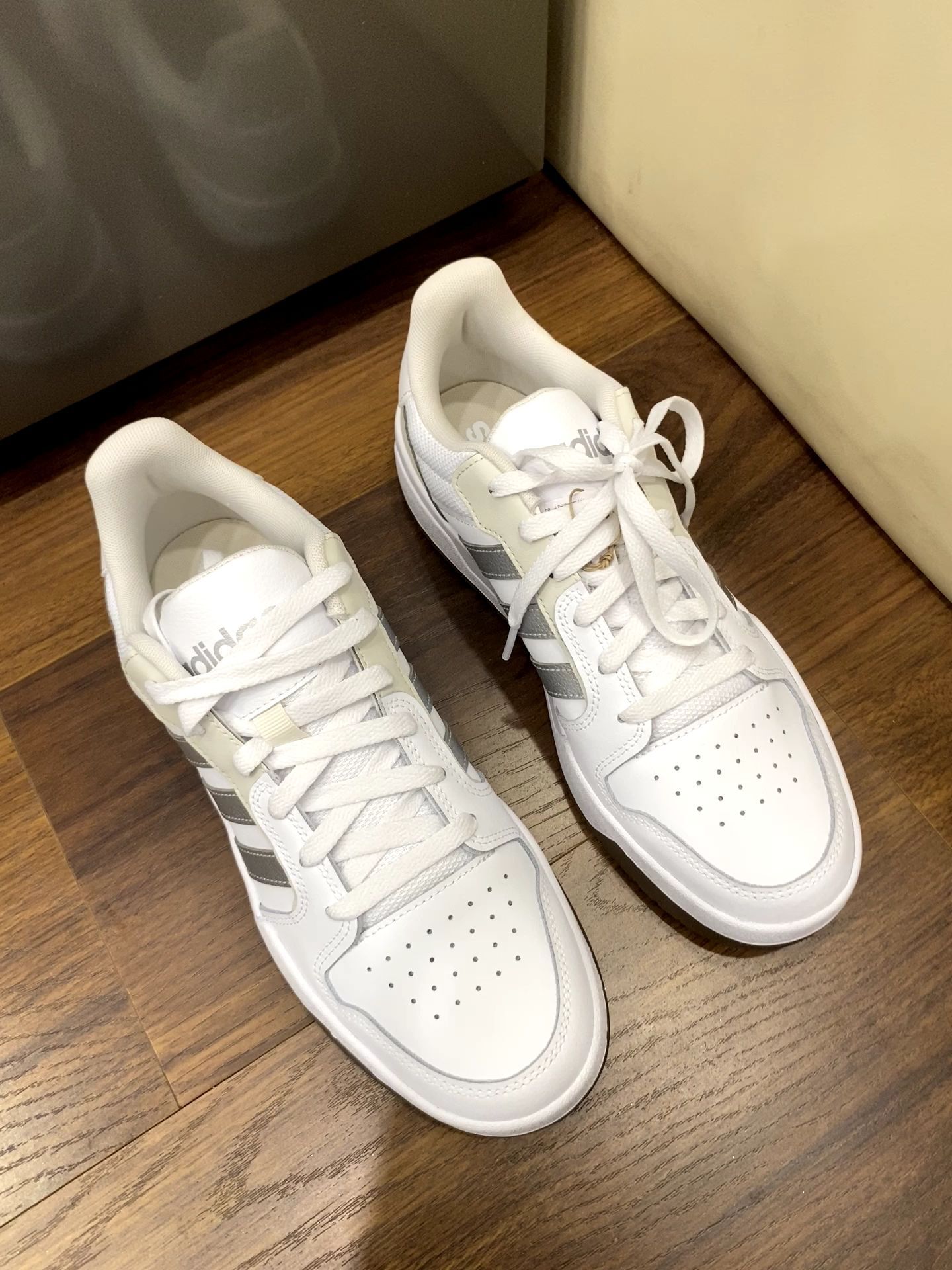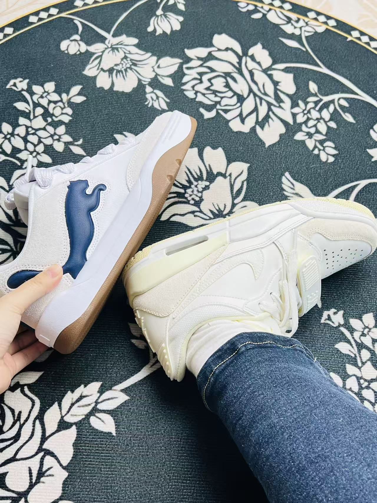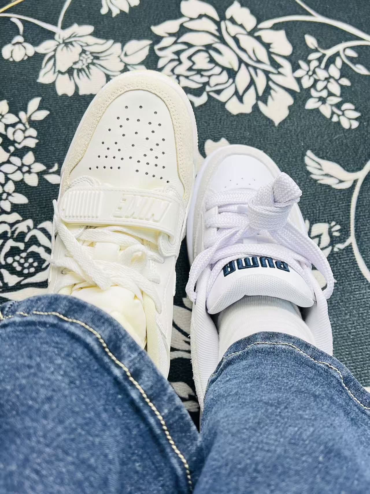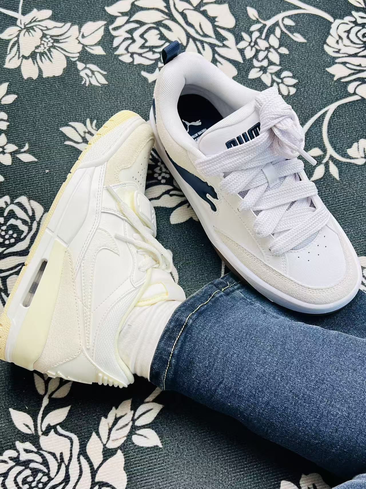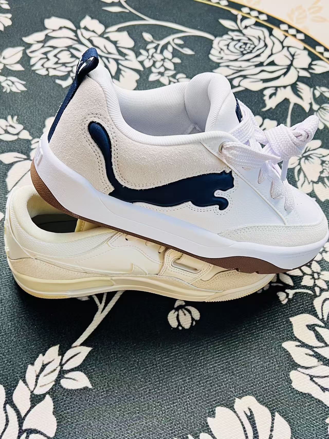 刚上脚的两双小白鞋,一只是带点复古做旧感的气垫款,一只是PUMA的低帮板鞋,说说真实穿感👇 先夸夸,气垫款脚感确实软,走路久点脚底也不怎么酸,鞋身的拼接材质摸着手感还不错,做旧的米白色也很搭牛仔裤。PUMA这双鞋型很秀气,鞋头的麂皮质感很到位,藏蓝色的logo点缀得也不突兀,日常穿脱很方便。 缺点也很实在,气垫款的鞋帮有点硬,第一次穿磨了下脚踝,得配厚袜子才行;鞋身的网布部分也容易沾灰,得...