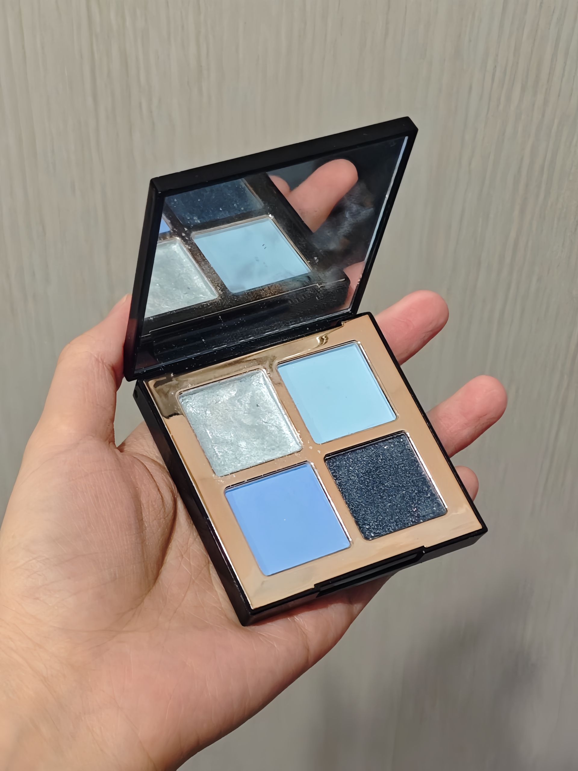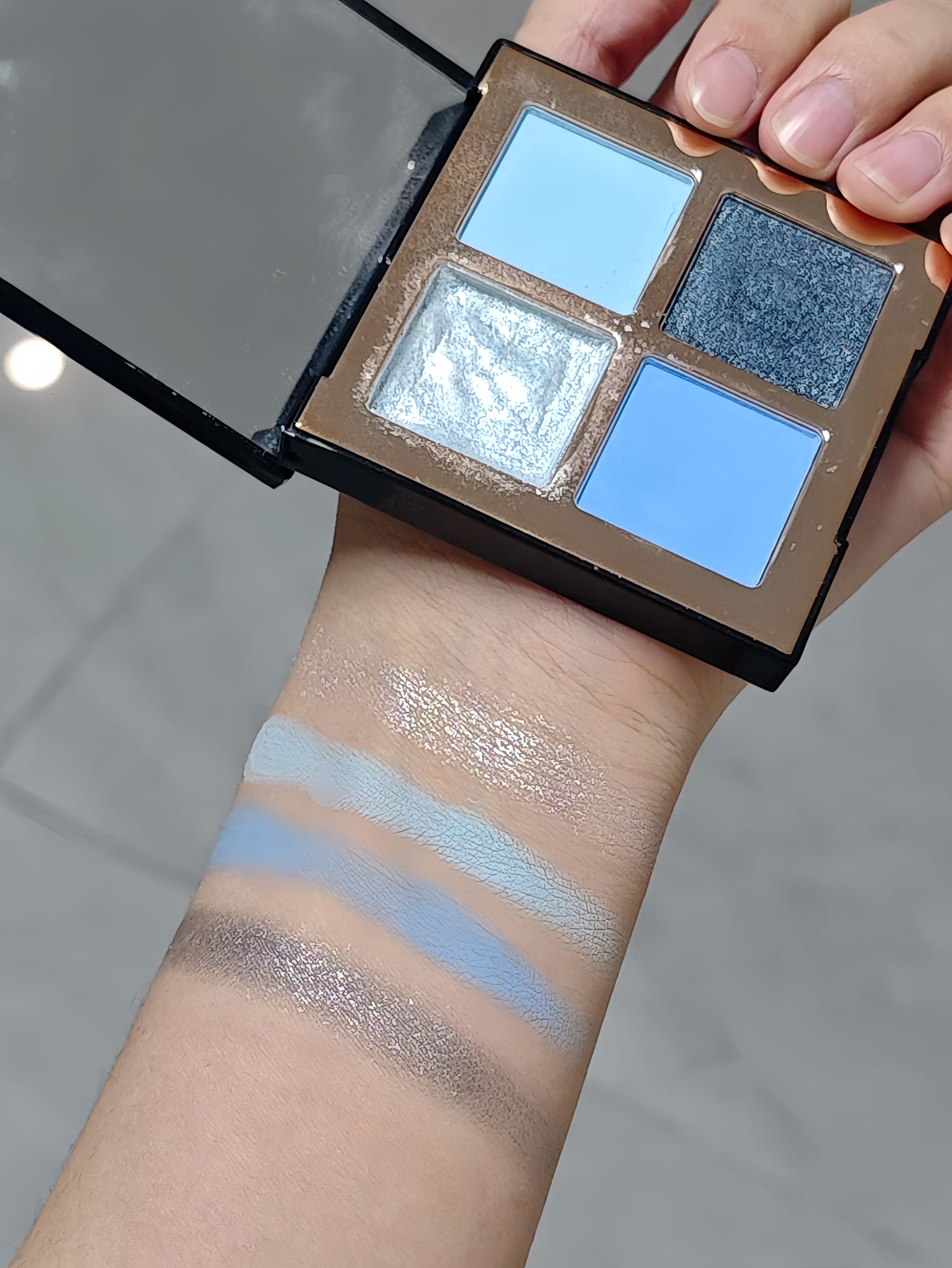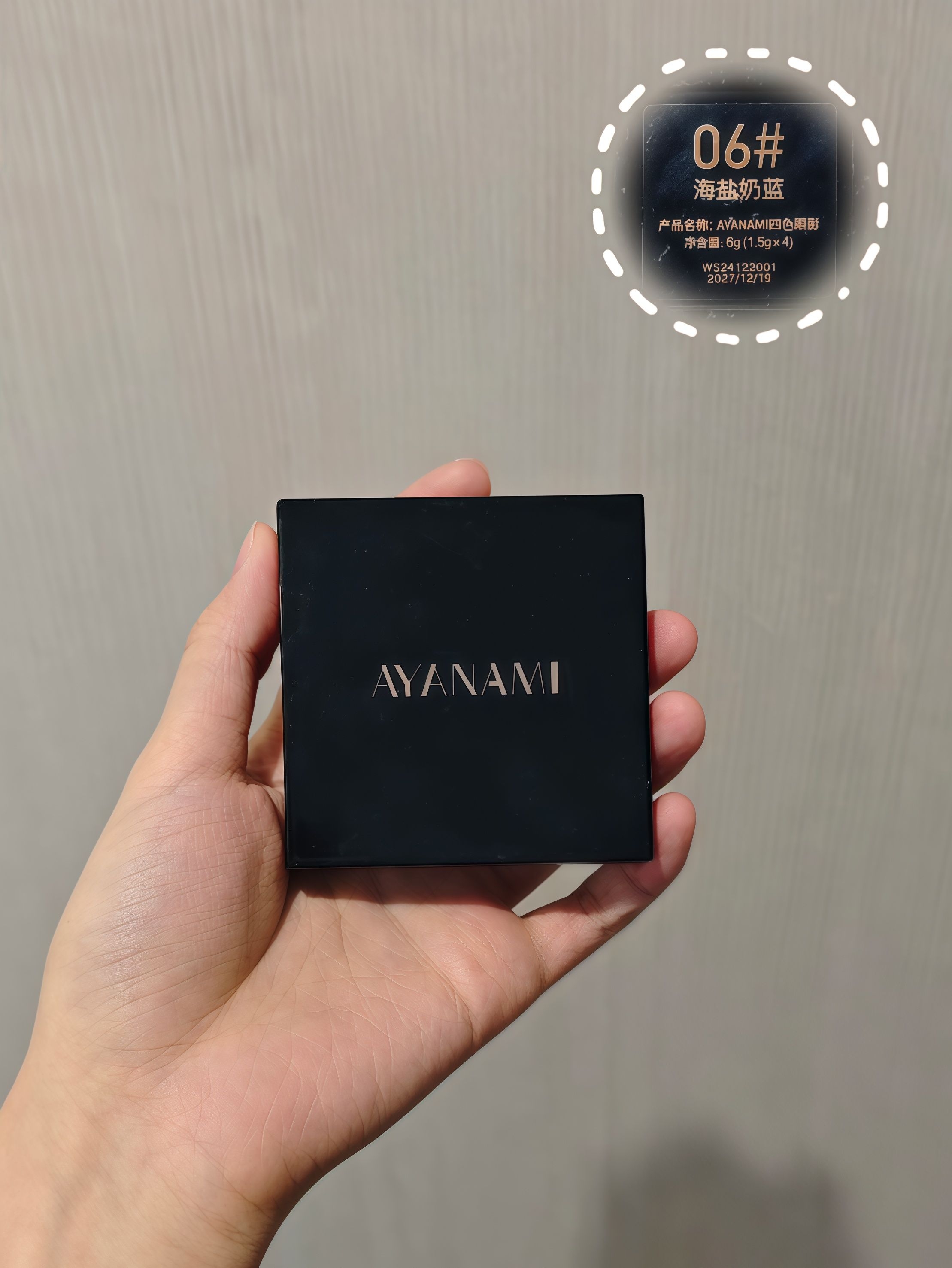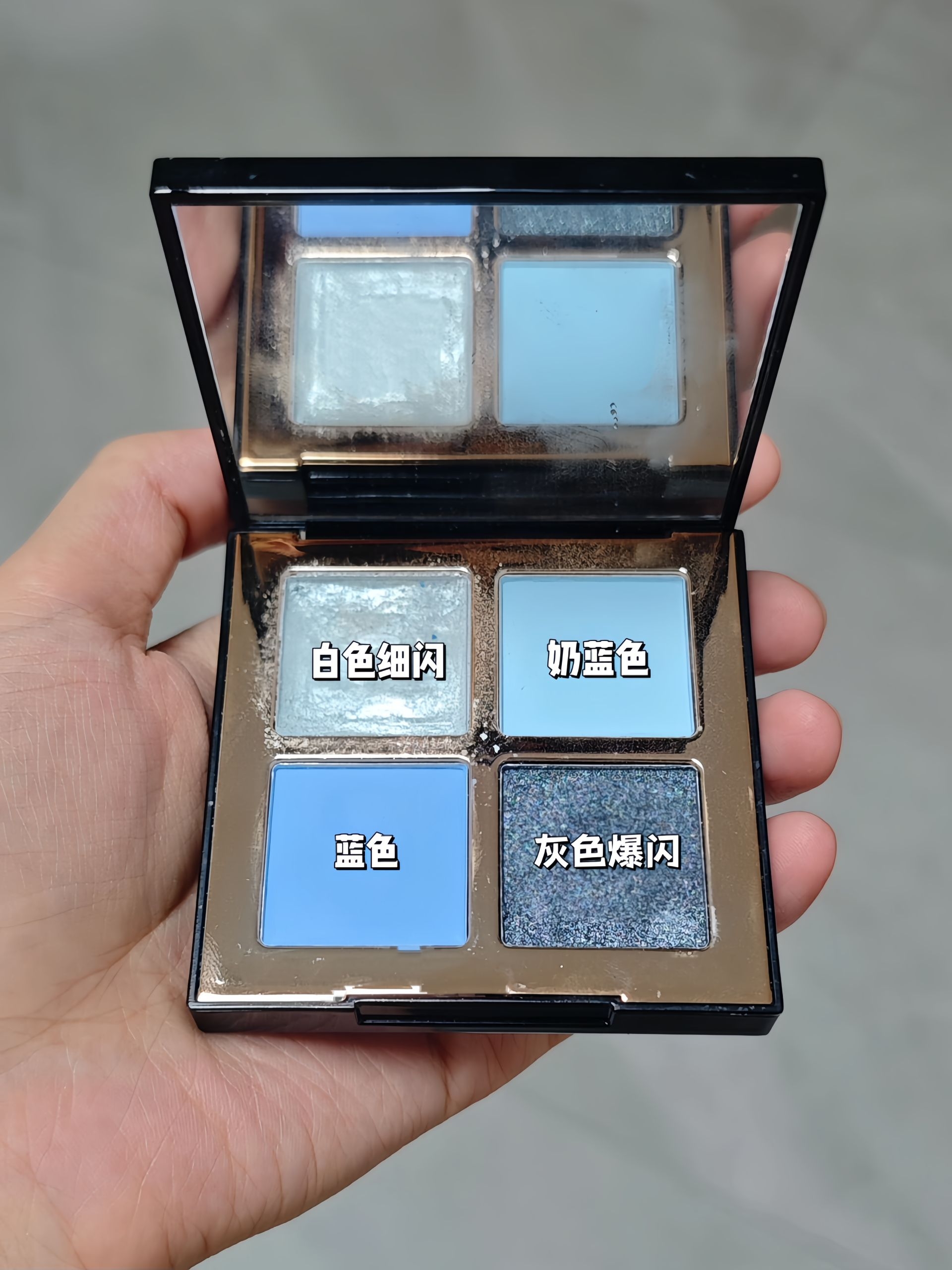 今天和大家分享AYANAMI四色眼影盘 这盘海盐奶蓝的配色真的很出彩 饱和度很高 有两颗哑光 两颗亮闪片 肿泡眼也可以用 不会显肿 晕染不用太多技巧 使用过程发现它真的不会飞粉 特别叠加清透碎闪后上眼很灵动很吸睛 很适合化音乐节妆容或者烟熏妆~ (最后一张图眼妆就是用这盘画的)
