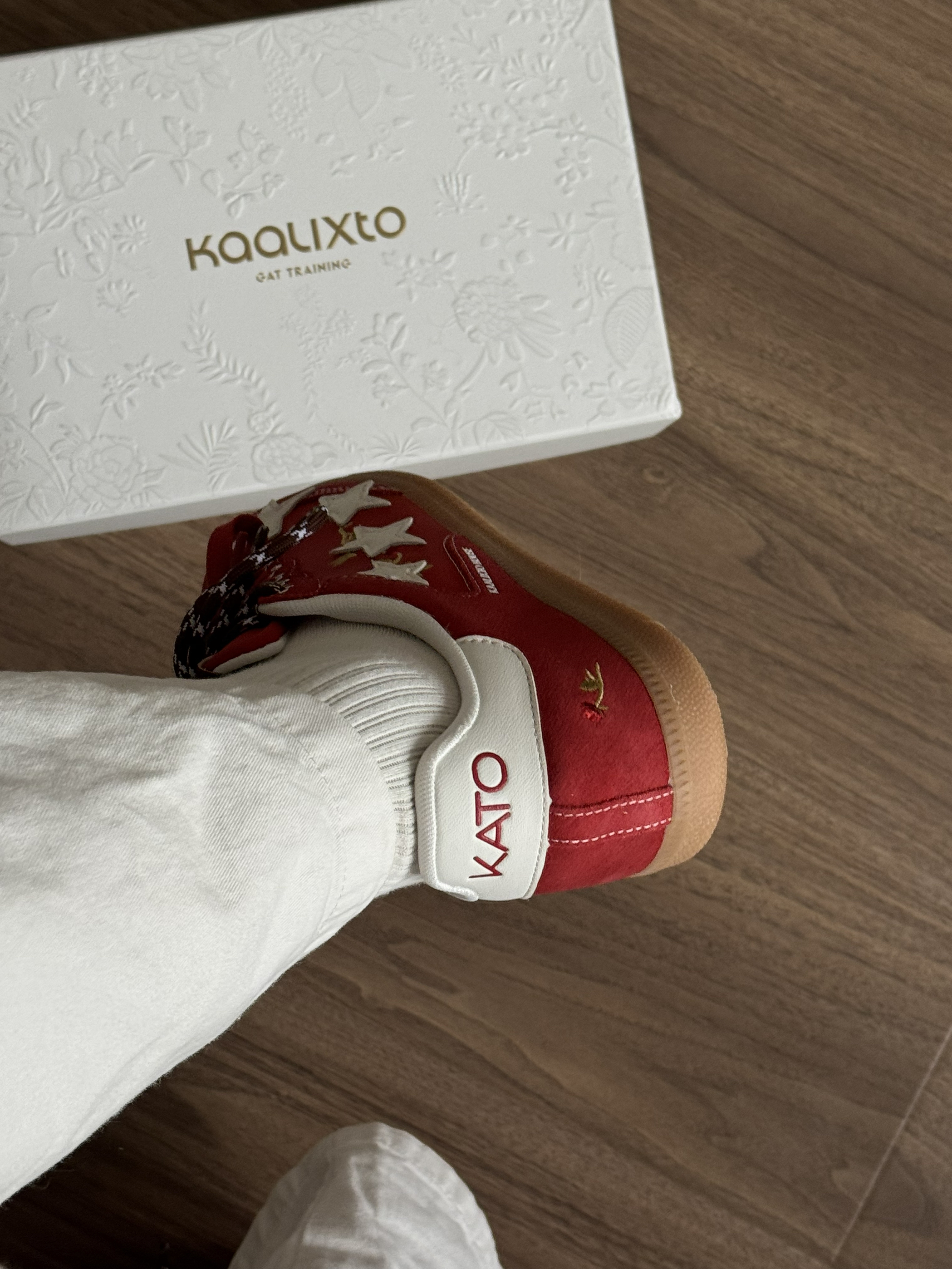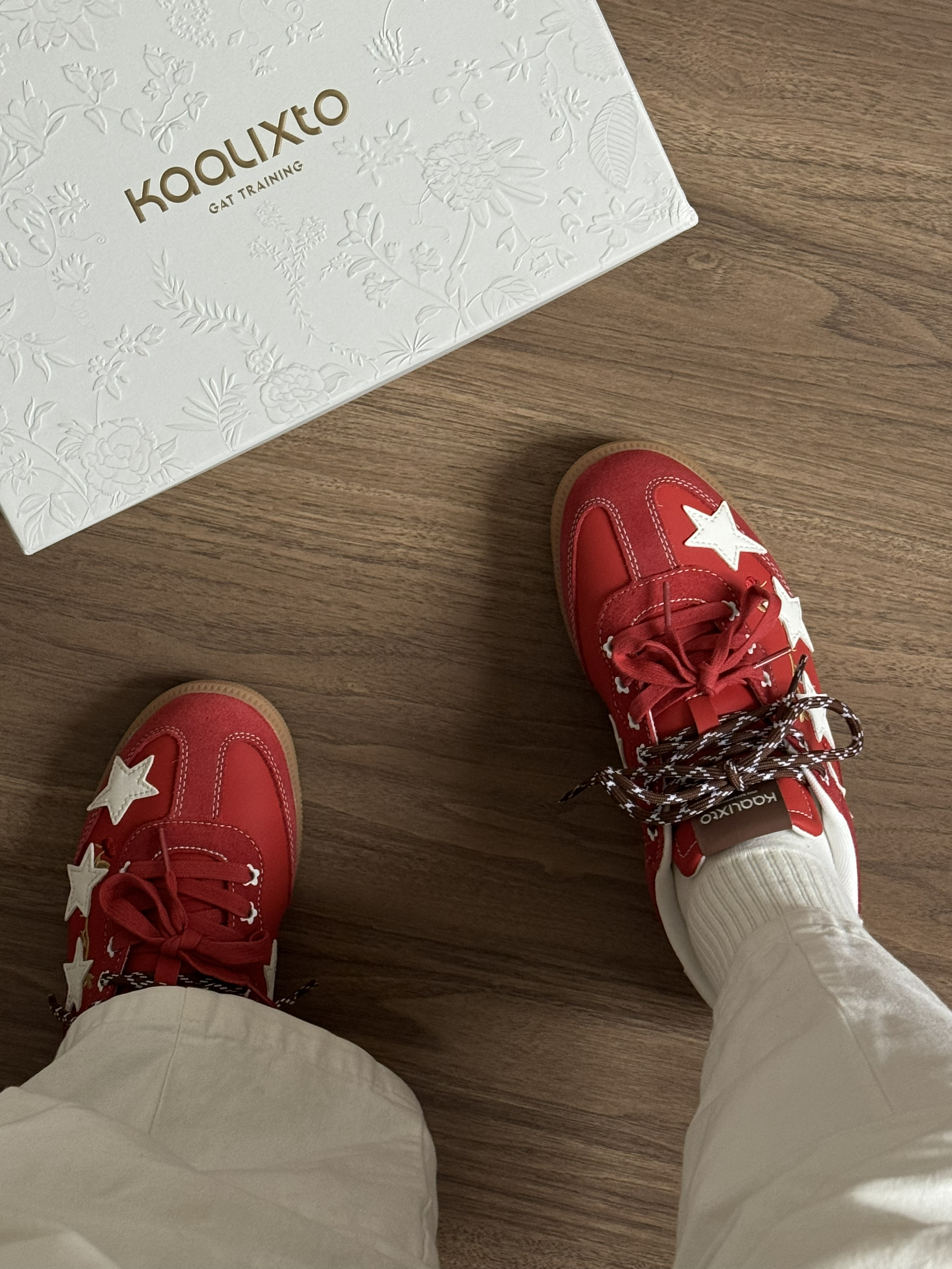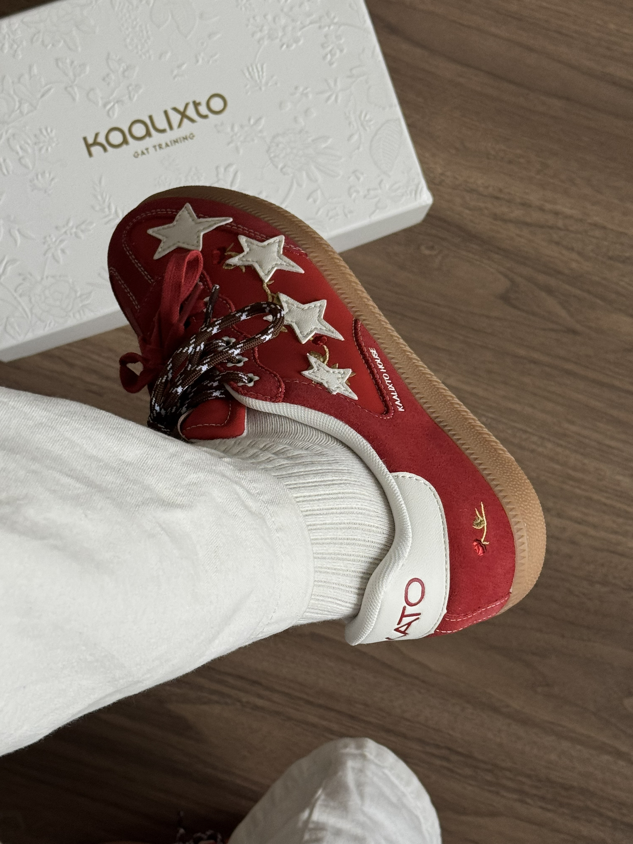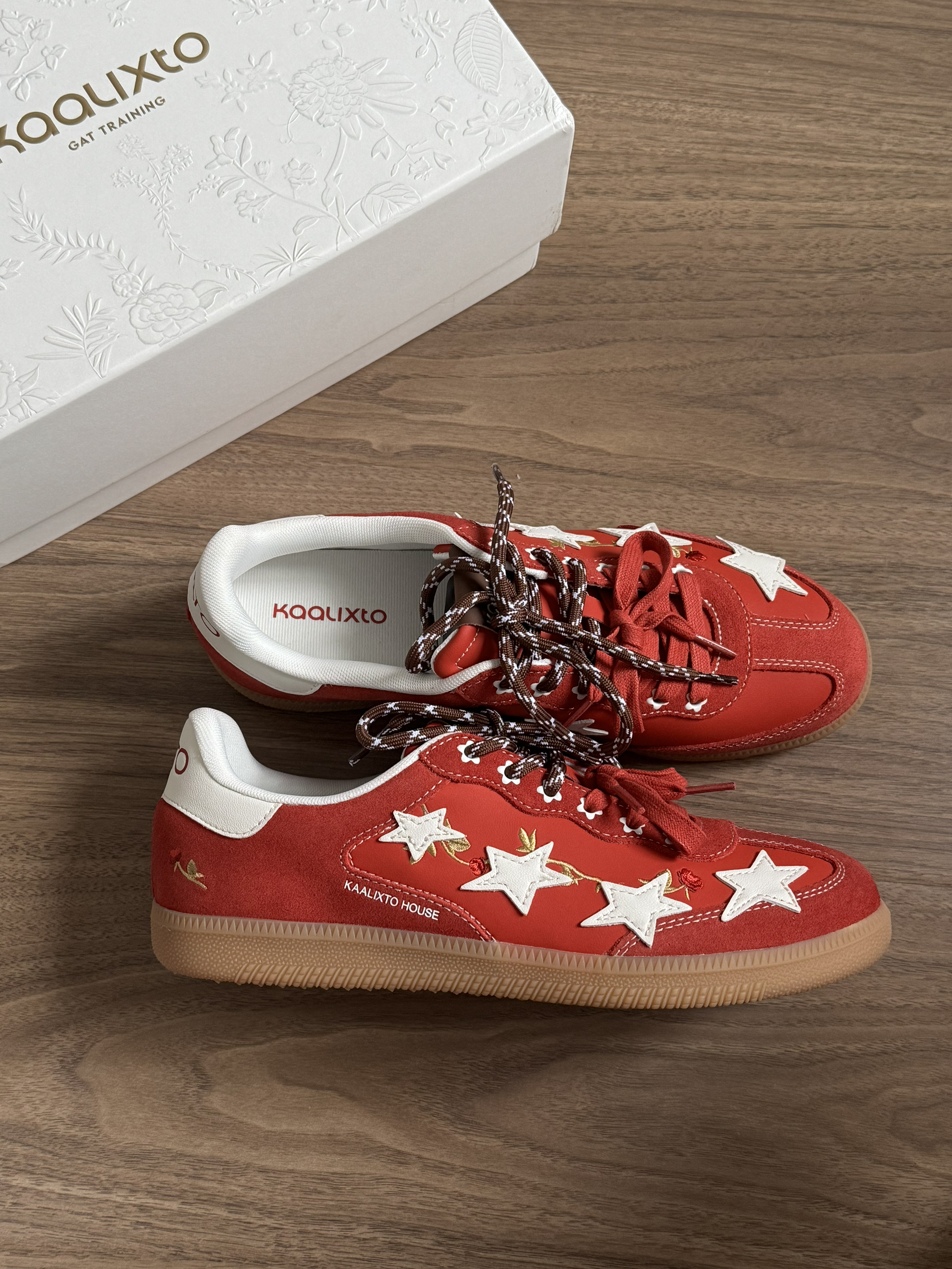 好喜欢这双的德训鞋👟 配色红红的超级好看👀 上脚很舒服~脚感很轻便~ 做工和细节都很好✨ 上面的小玫瑰刺绣设计,很高级! 直接焊jio上了~马上有钱💰