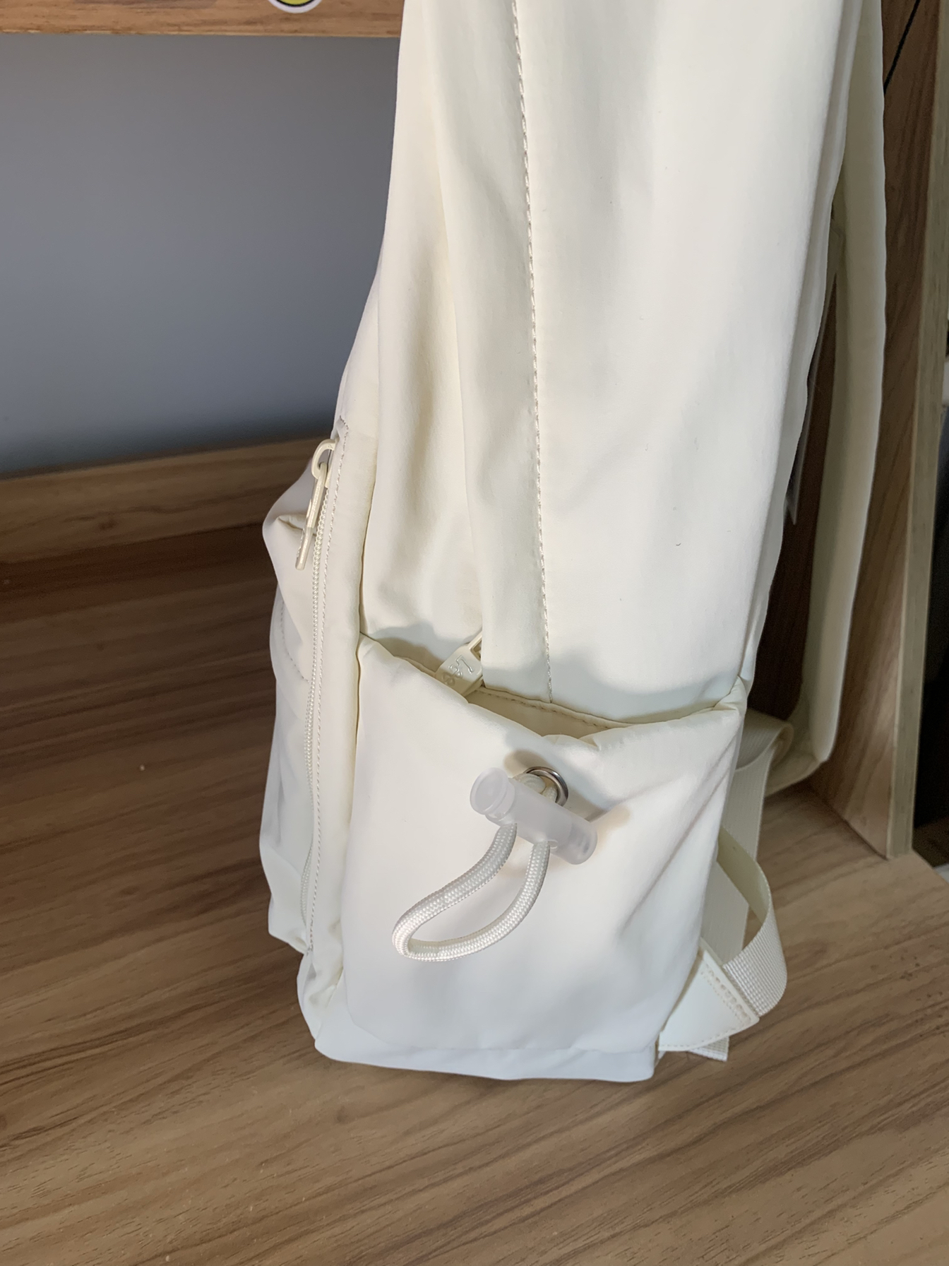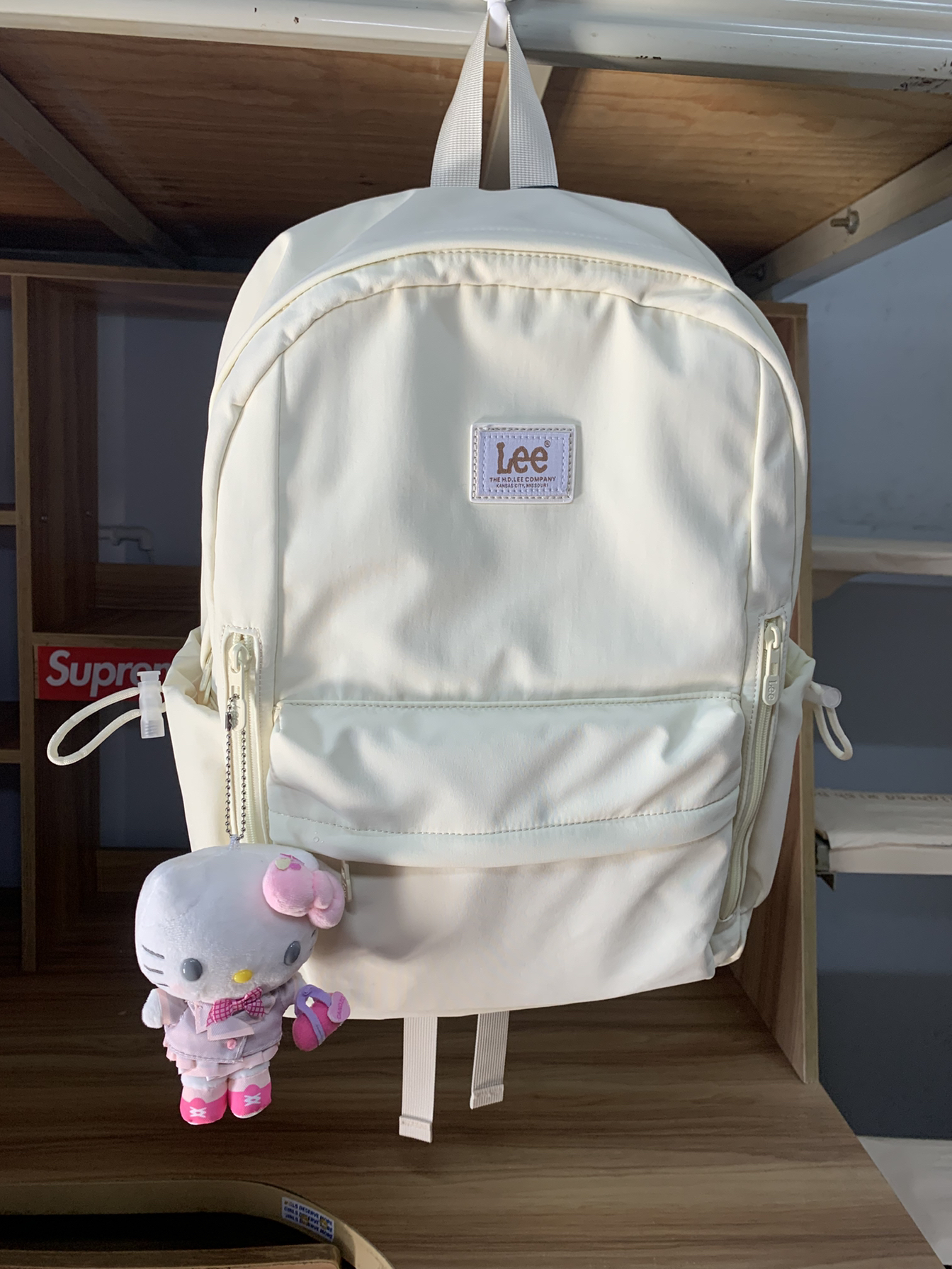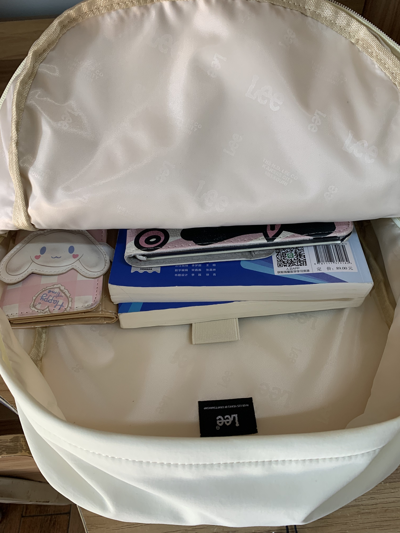 书包整体颜色是奶油白🧁的,搭配浅棕色的Lee品牌标,显得整个书包就是干干净净又温柔!😻 书包整体的容量很大,除了经典书包前边的空间,旁边还有两个侧拉链隐形空间,可以放一些小钱包和证件照,书包侧边的两个侧兜带有收缩绳,放水杯或者雨伞就不易掉。💕 书包自重很轻,肩带里有填充物背着不勒。大课本和iPad以及电脑💻都可以装下,日常通勤和上学必备,喜欢容量大的宝宝可以试试~🍥