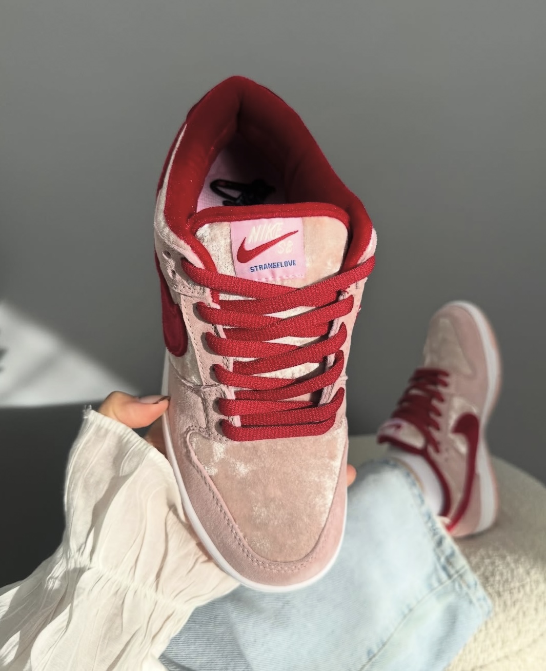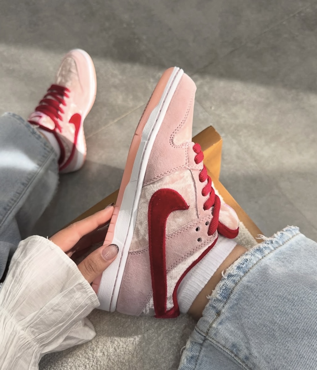 这双StrangeLove x Nike SB Dunk Low情人节限定,用浅粉翻毛皮搭配红丝绒Swoosh,鞋身的丝绒质感温柔又高级,红粉撞色把情人节的浪漫氛围拉满。后跟的骷髅爱心刺绣、鞋底的桃心果冻底,藏着满满的设计巧思,既是滑板鞋的街头感,又带着少女心的甜,上脚颜值和脚感双在线~