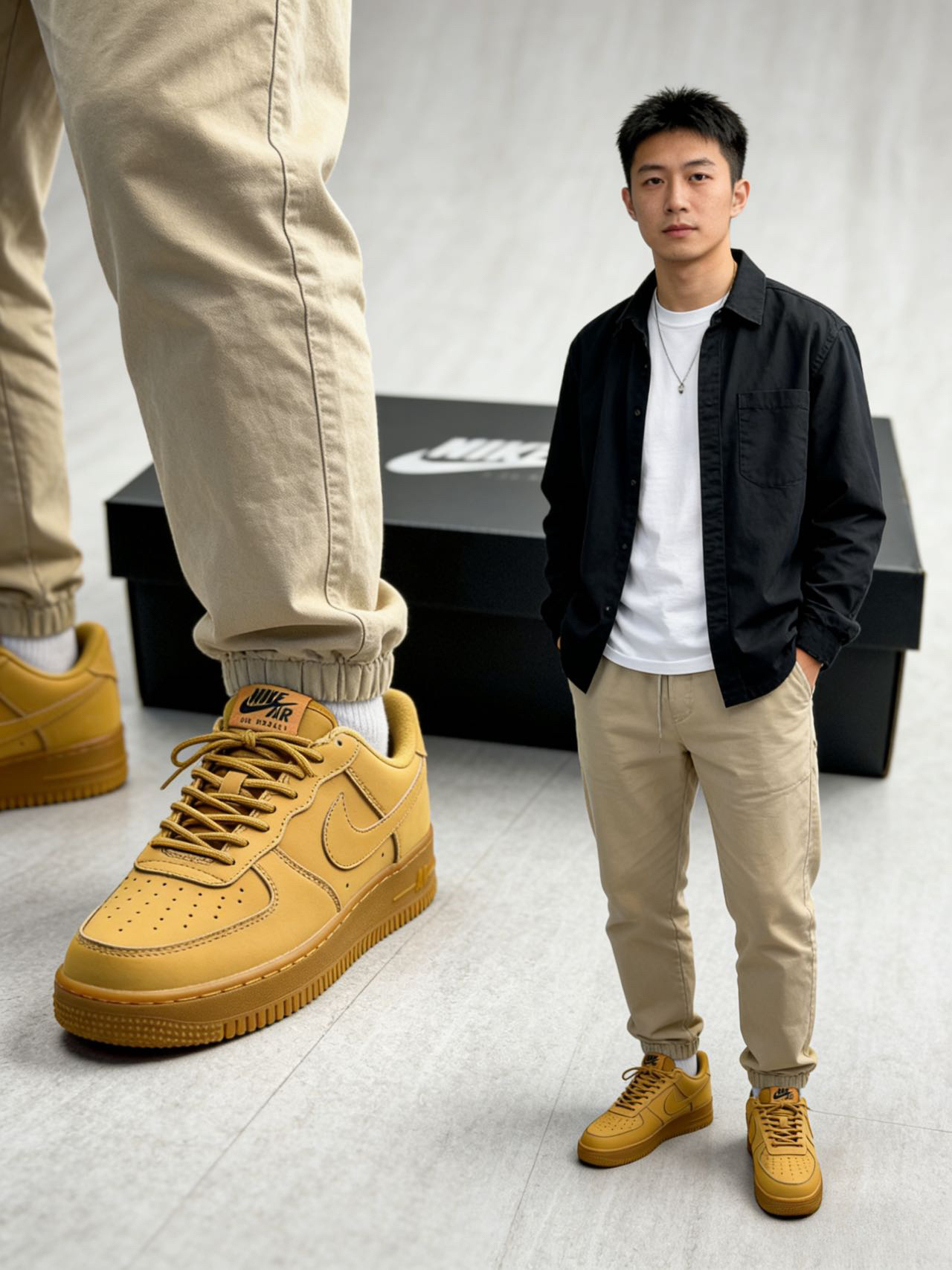 这双小麦色空军一号,真就穿不腻。贼拉好搭裤子,关键是耐脏还耐磨,穿一两年都不过时。经典款,闭眼入就完了,能打!