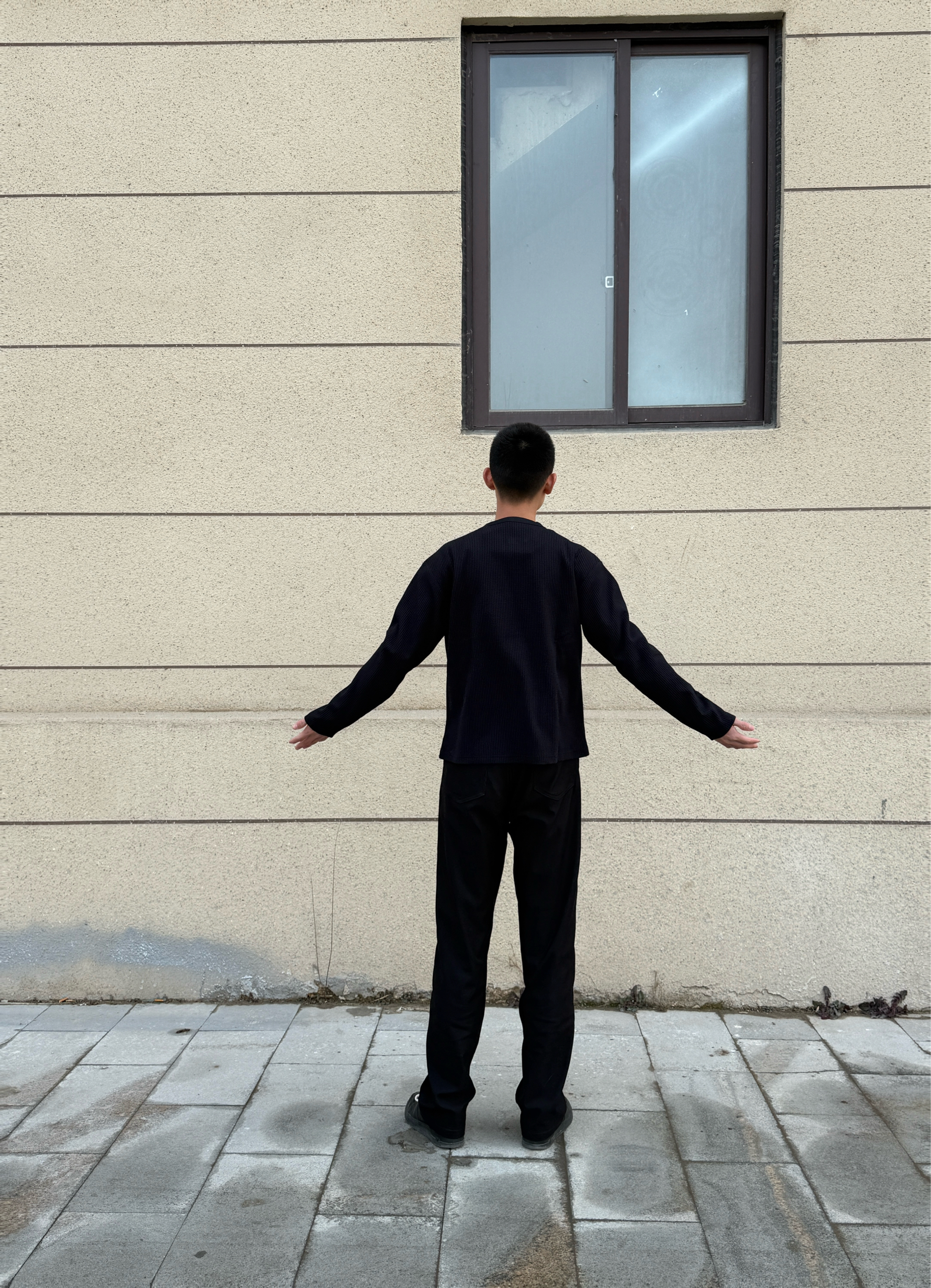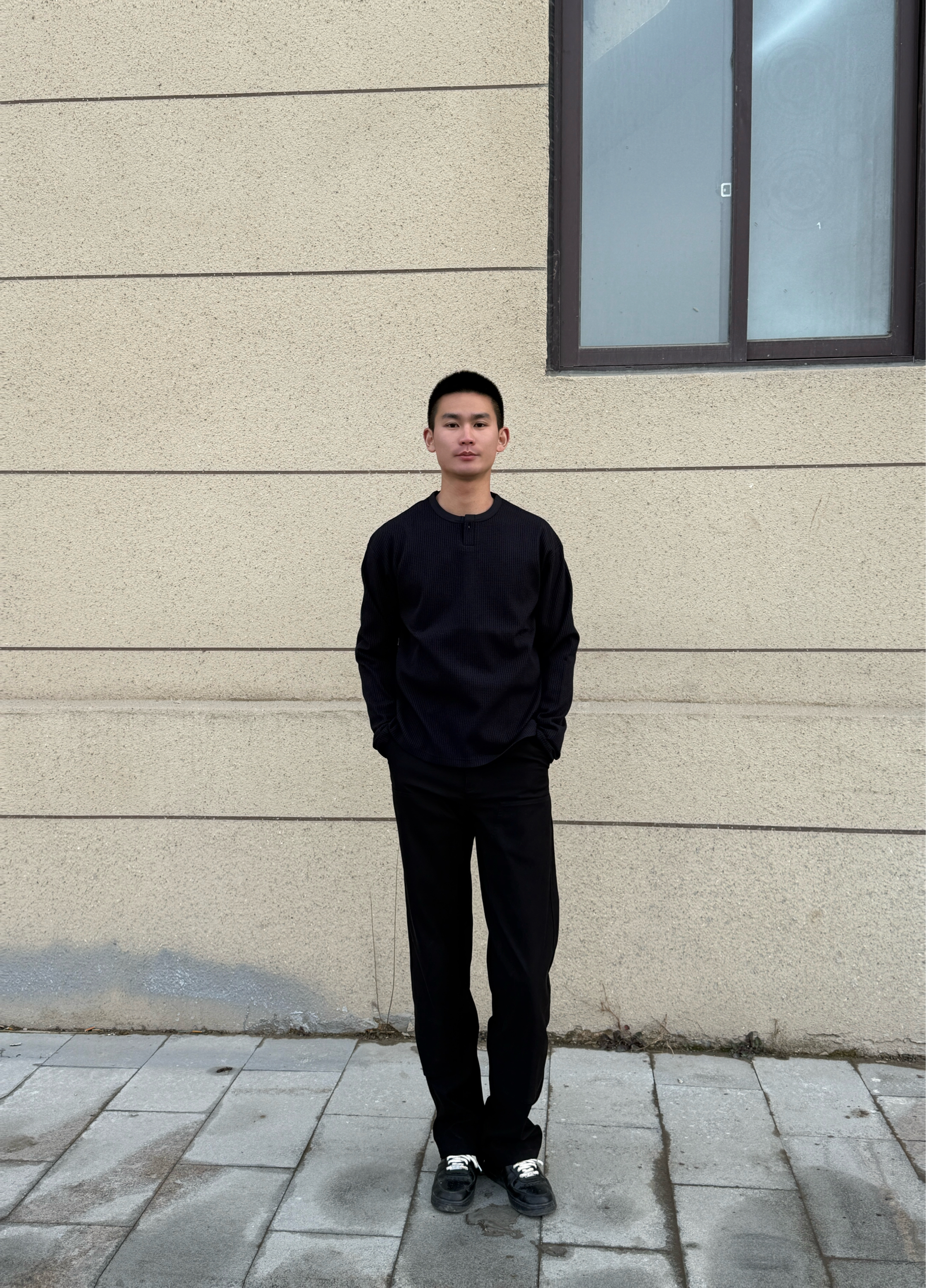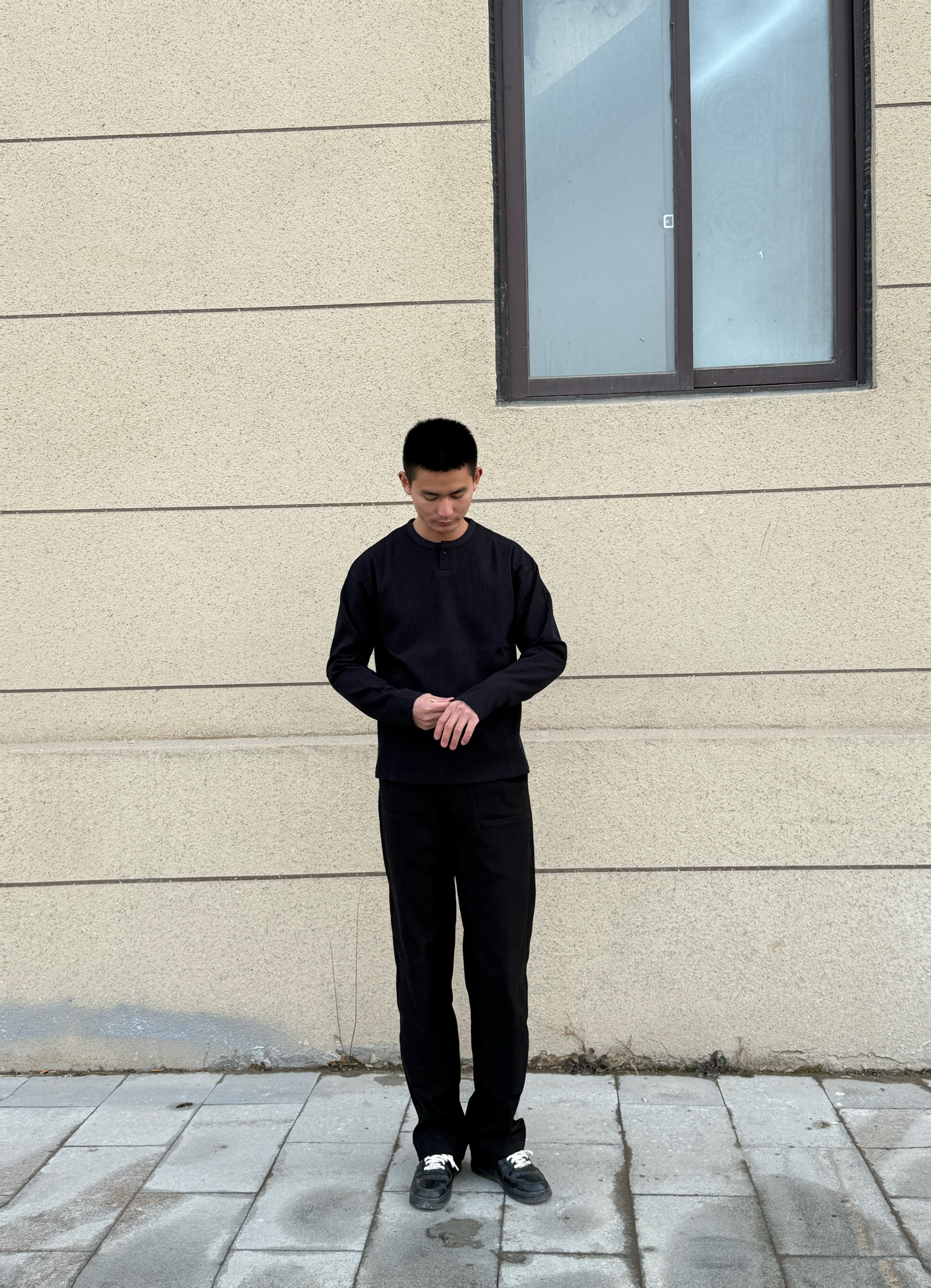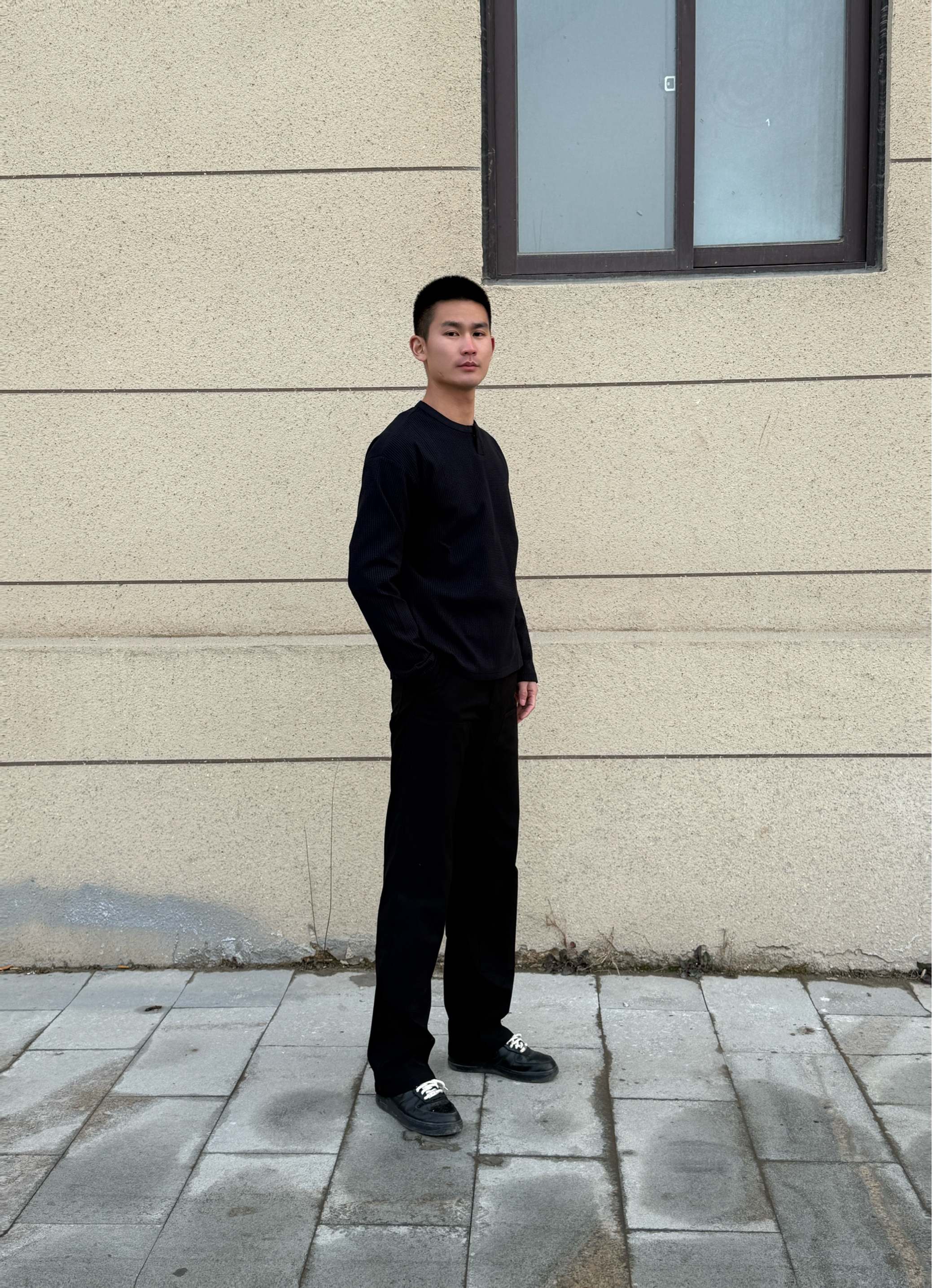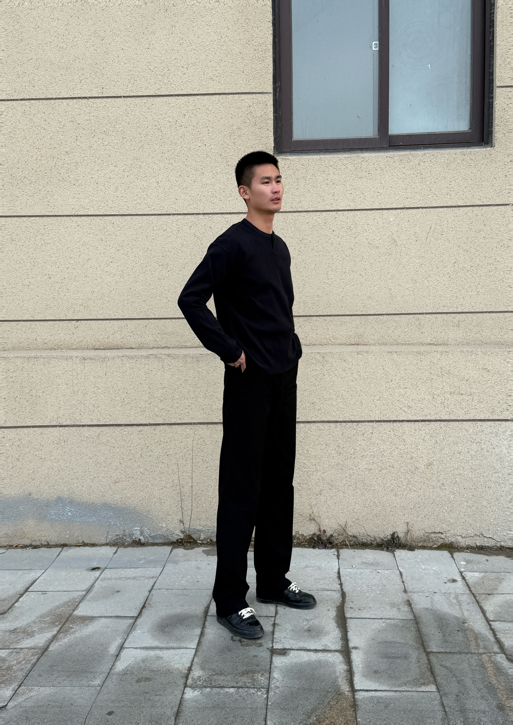 • 上衣:一件华夫格亨利领长袖,材质有质感,领口的小设计增加了细节。 • 裤子:一条垂感很好的黑色直筒西裤,显瘦又能拉长腿部线条。 • 鞋子:一双经典的黑色板鞋,和全身风格完美适配。 搭配思路 这种All Black的搭配,核心在于利用不同材质的质感和版型来营造层次,简单又不单调。