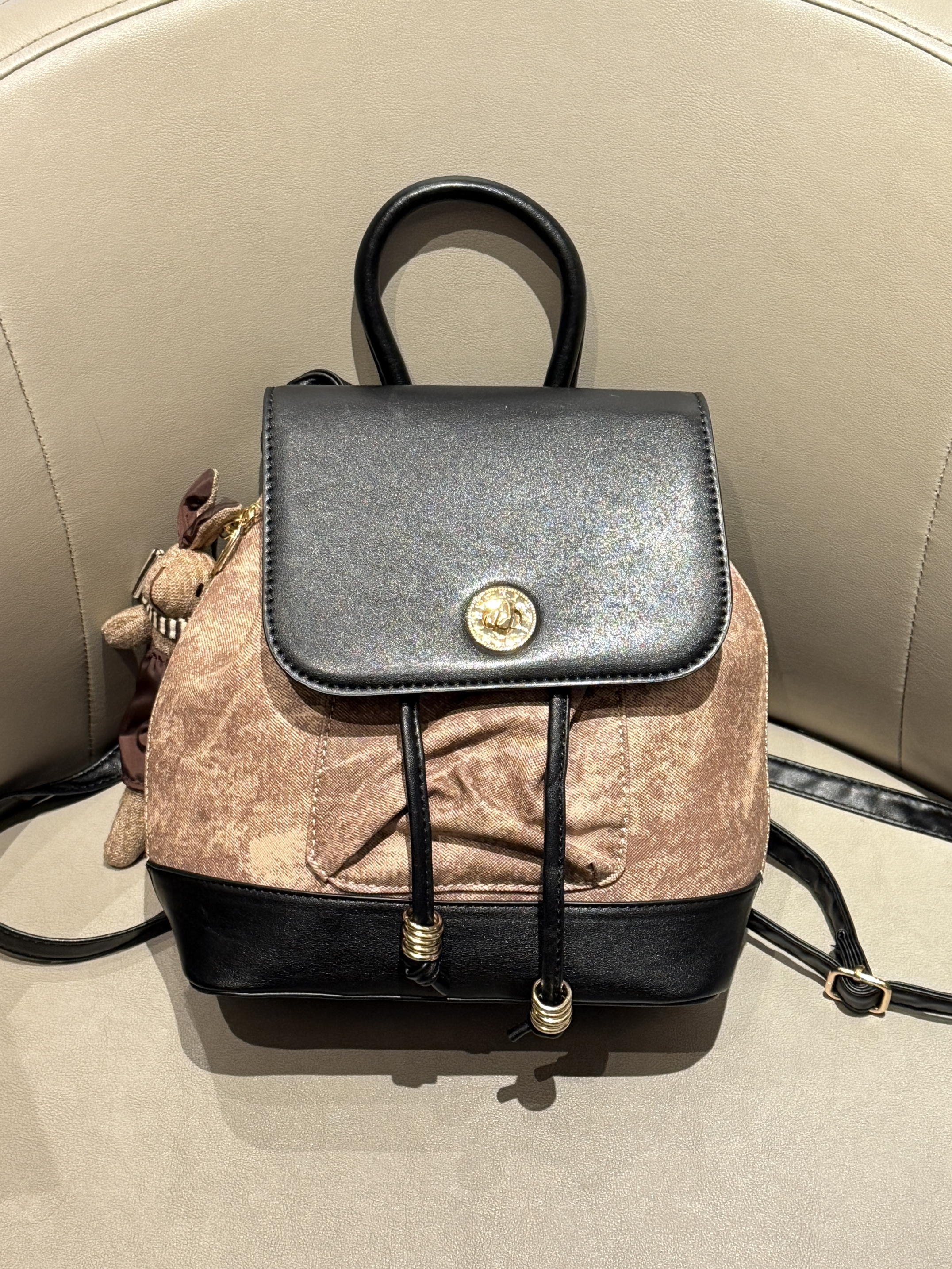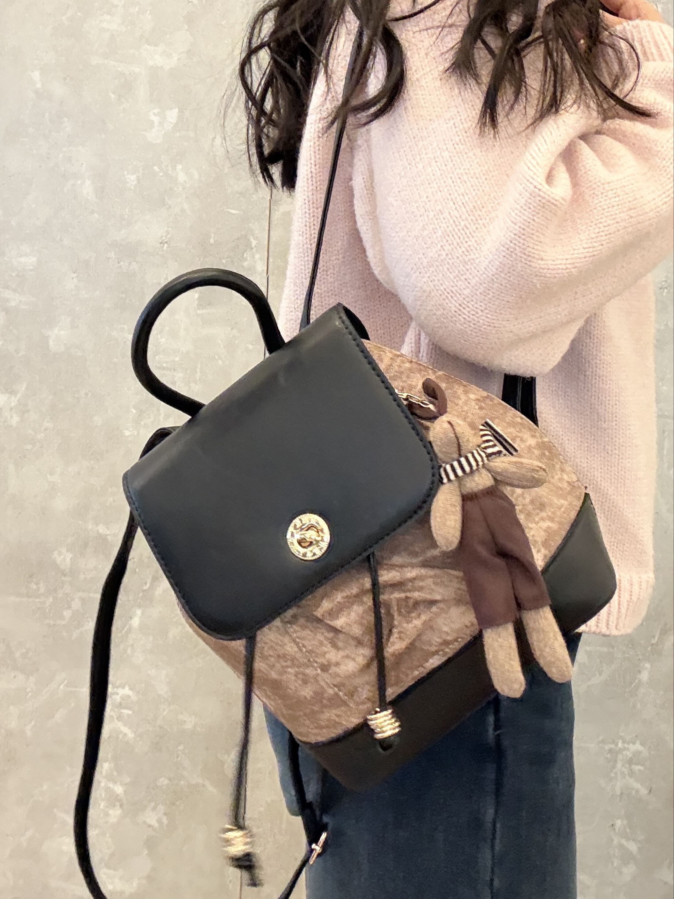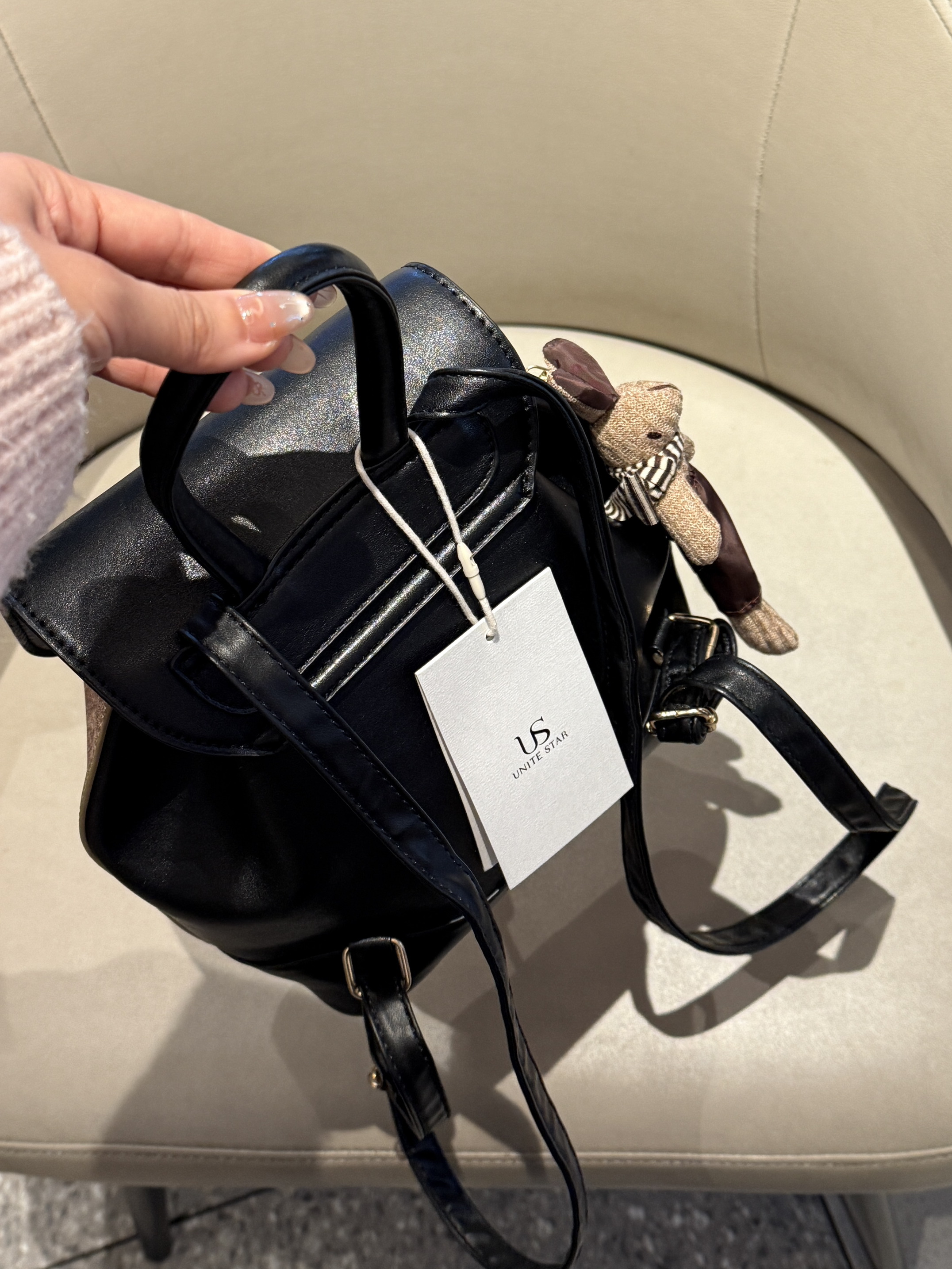 是unite star家的双肩包耶 打开后是水桶造型很有特点 卡其色和黑色双拼给人的感觉简约又高级 还配了一个小兔子挂件 上身亮眼又吸睛 包包里面的容量也很可 我觉得还蛮能装的 无论是平时上课还是日常通勤 出街都可以背 感觉还蛮百搭的