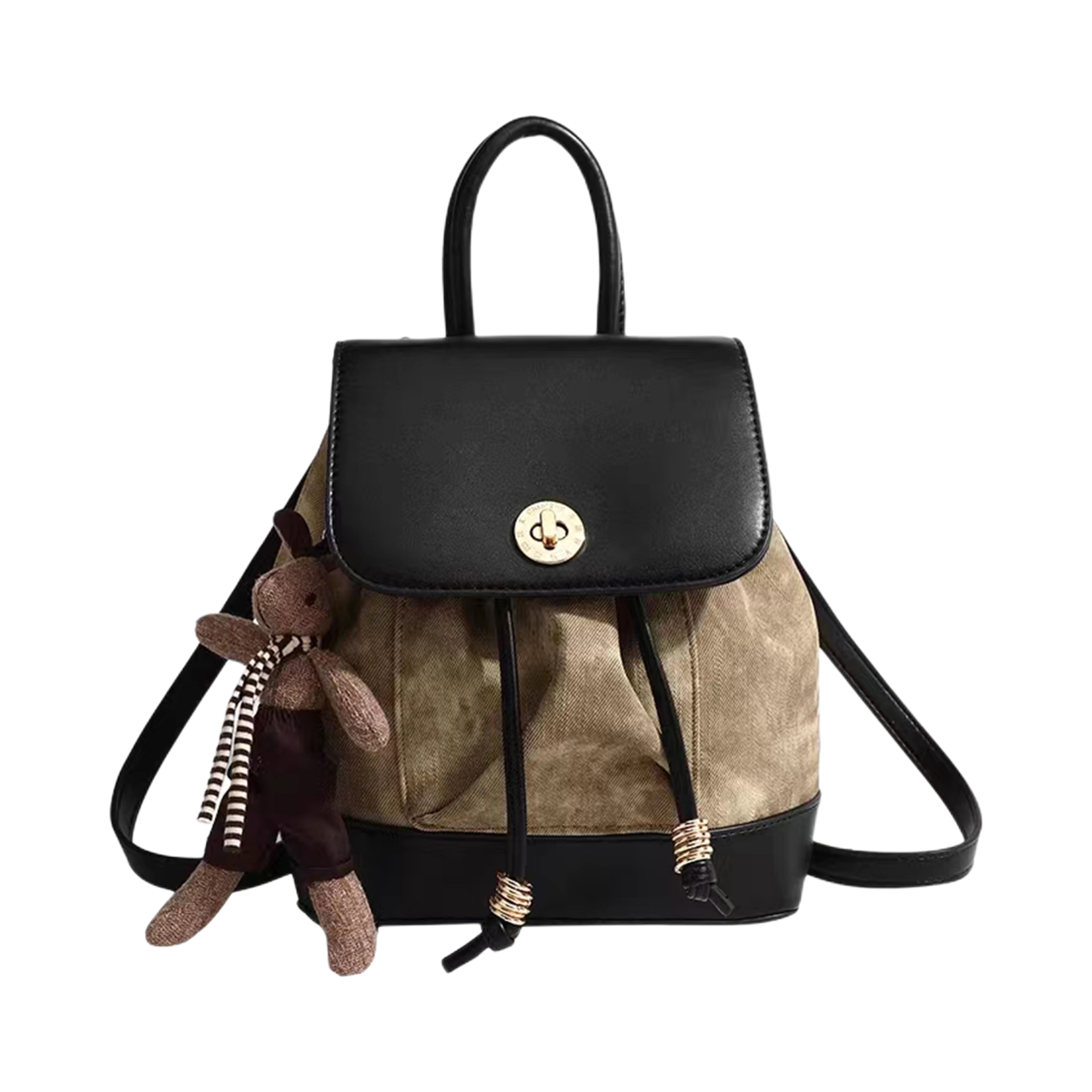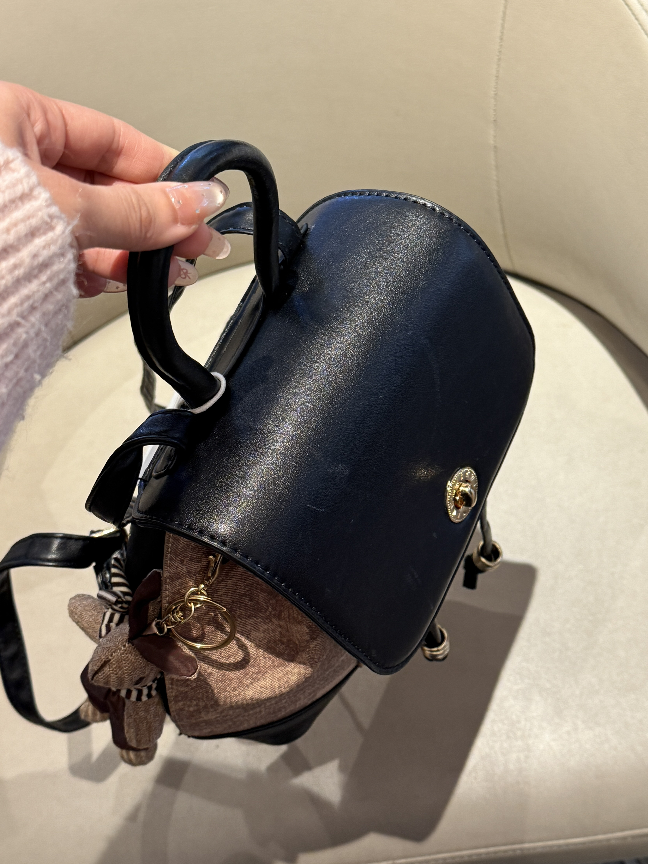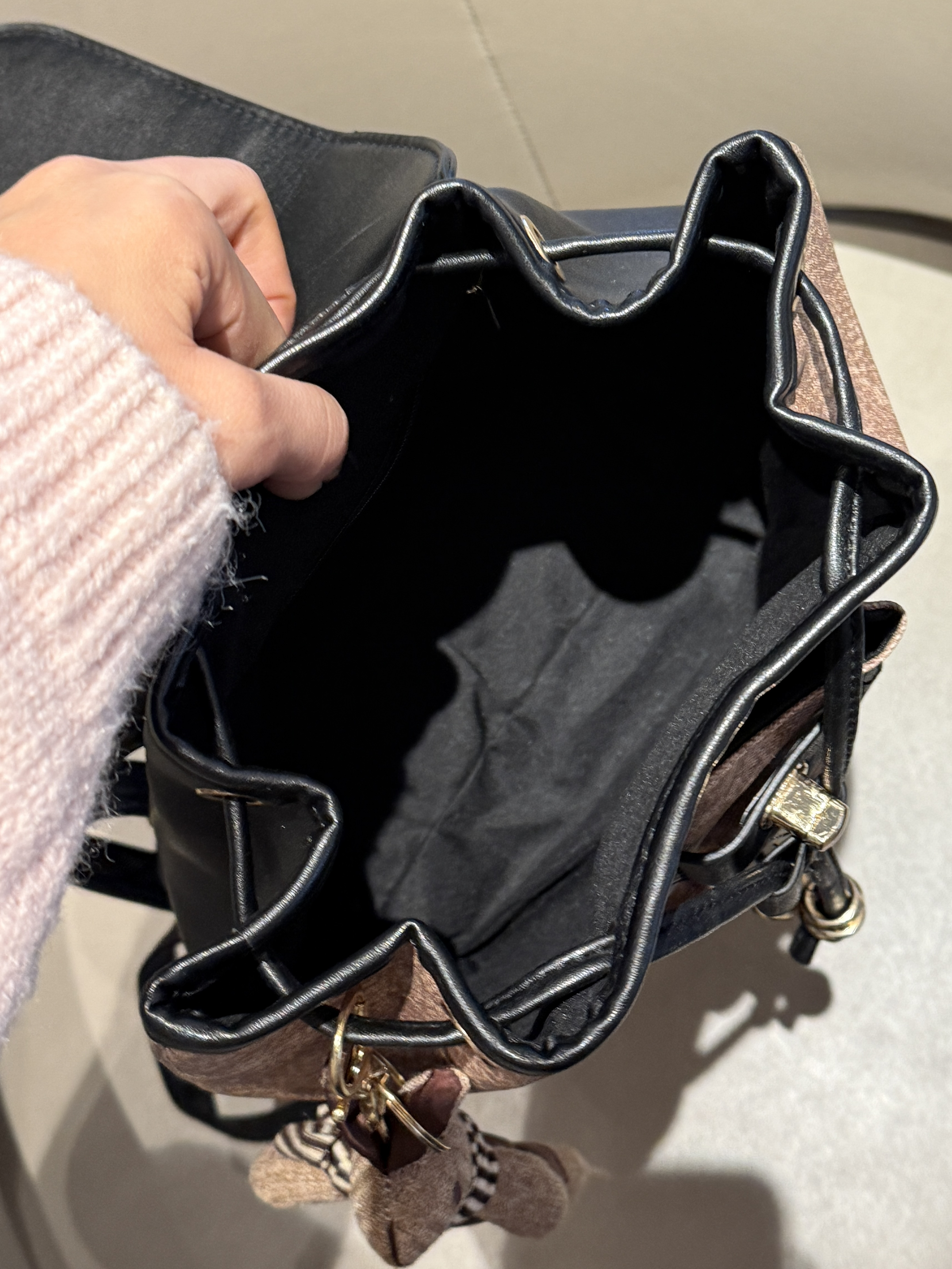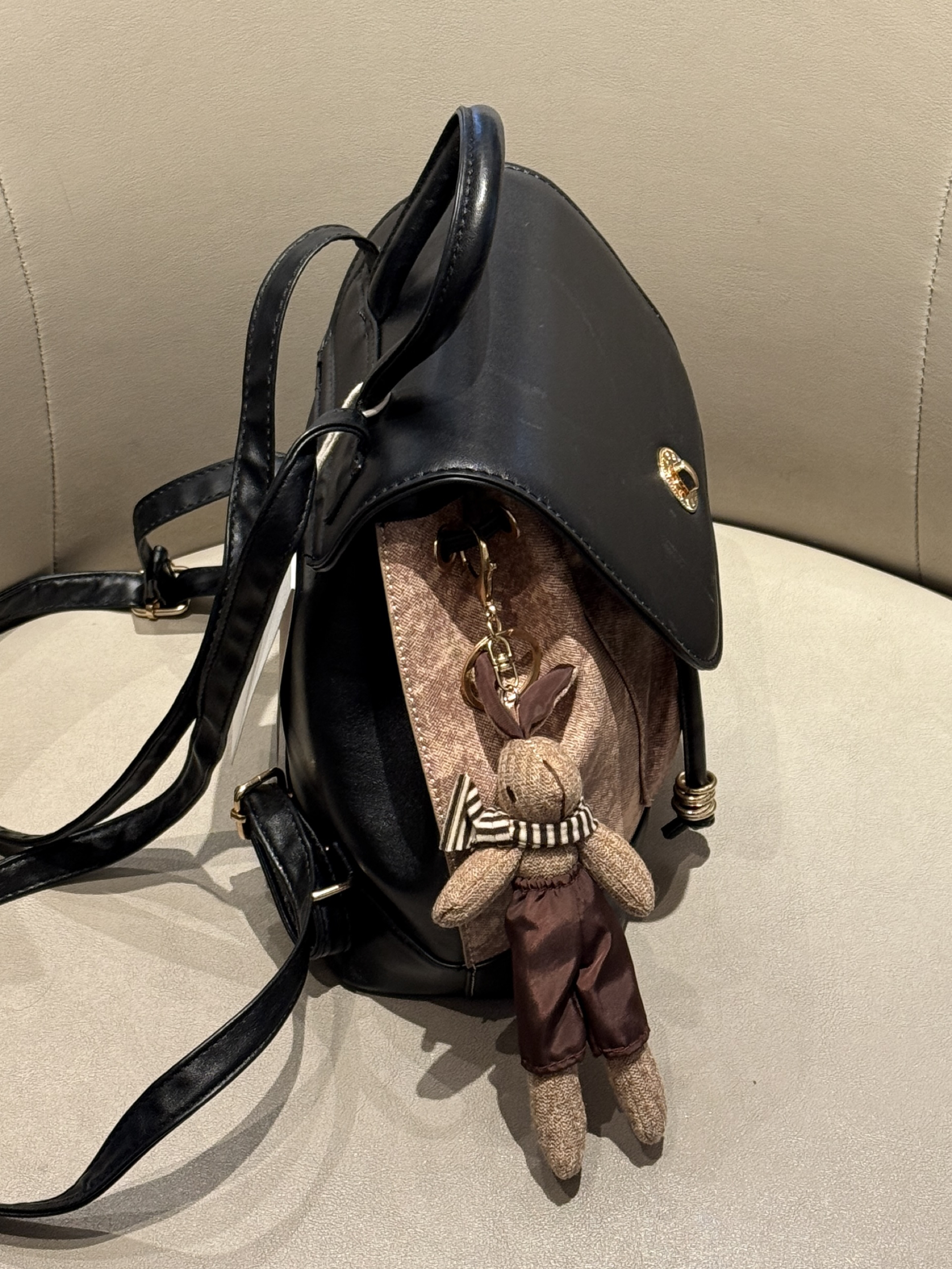 是unite star家的双肩包耶 打开后是水桶造型很有特点 卡其色和黑色双拼给人的感觉简约又高级 还配了一个小兔子挂件 上身亮眼又吸睛 包包里面的容量也很可 我觉得还蛮能装的 无论是平时上课还是日常通勤 出街都可以背 感觉还蛮百搭的