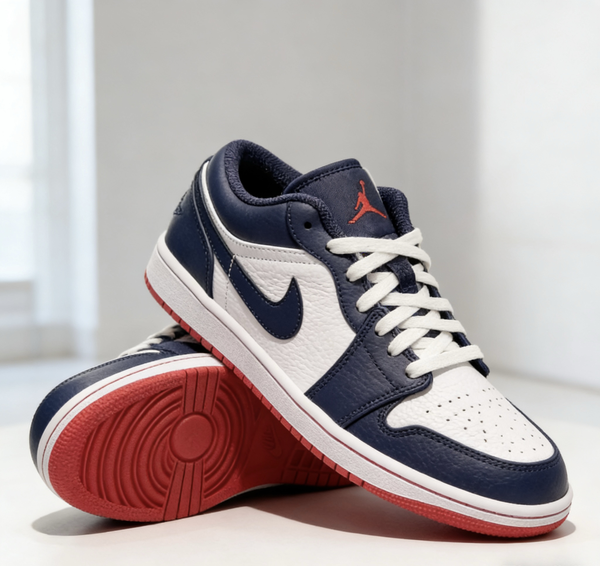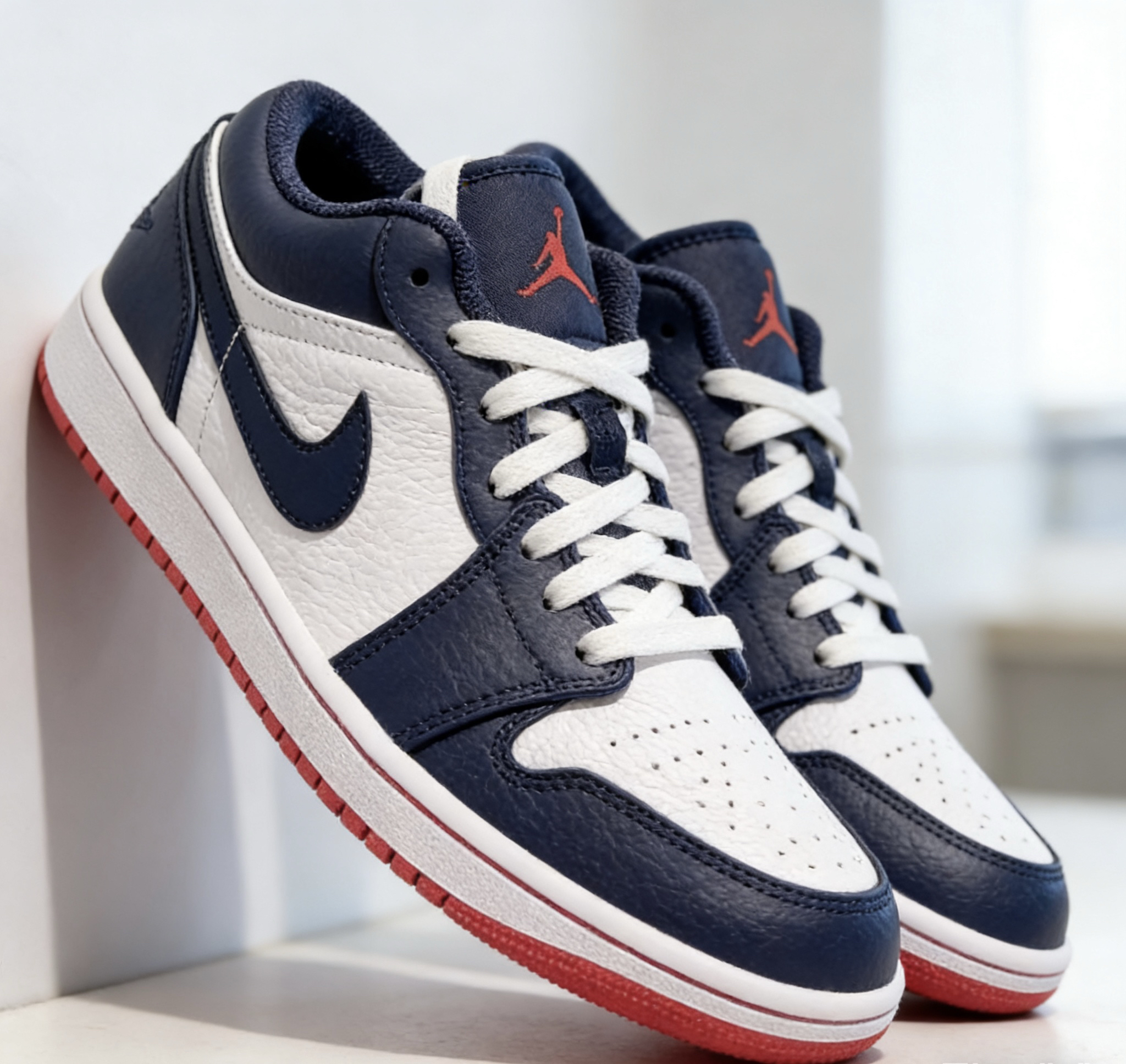 这款鞋是WMNS Air Jordan 1 Low "Blue Grey and Dune Red",专为女性打造的蓝白红配色低帮经典篮球鞋。 设计特点 • 配色方案:以纯白皮革为基底,灰蓝色皮革覆面,沙丘红色点缀Swoosh、Jumpman Logo和Wings Logo,层次感丰富。 • 材质工艺:采用细腻皮革材质构建鞋身,质感出色且保证颜值。 • 经典标识:保留AJ1标志性设计元素,...