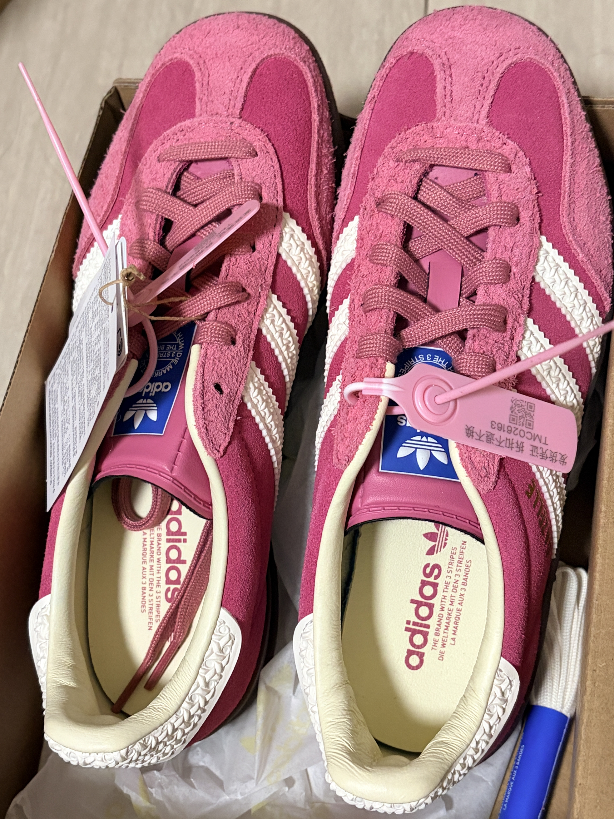 被这双阿迪的鲨鱼粉鞋整得有点自闭,既喜欢又头疼。 先说颜值,就像火龙果撞到了鲨鱼鞋一样,粉配黑确实很抢眼,当然不是那种腻人的粉,鞋面的翻毛皮表面摸着也有质感,上脚挺舒服,平常走路压马路没感觉累脚。 但细节也是真有点磨人,翻毛皮太容易沾灰,穿两天就显得旧旧的;鞋带做得宽,系起来老感觉不紧,每次出门前都要跟它较会儿劲;鞋码还偏小,按平常码买还有点挤,所以建议喜欢的人,入手最好选大半码或一码。 总体来说...