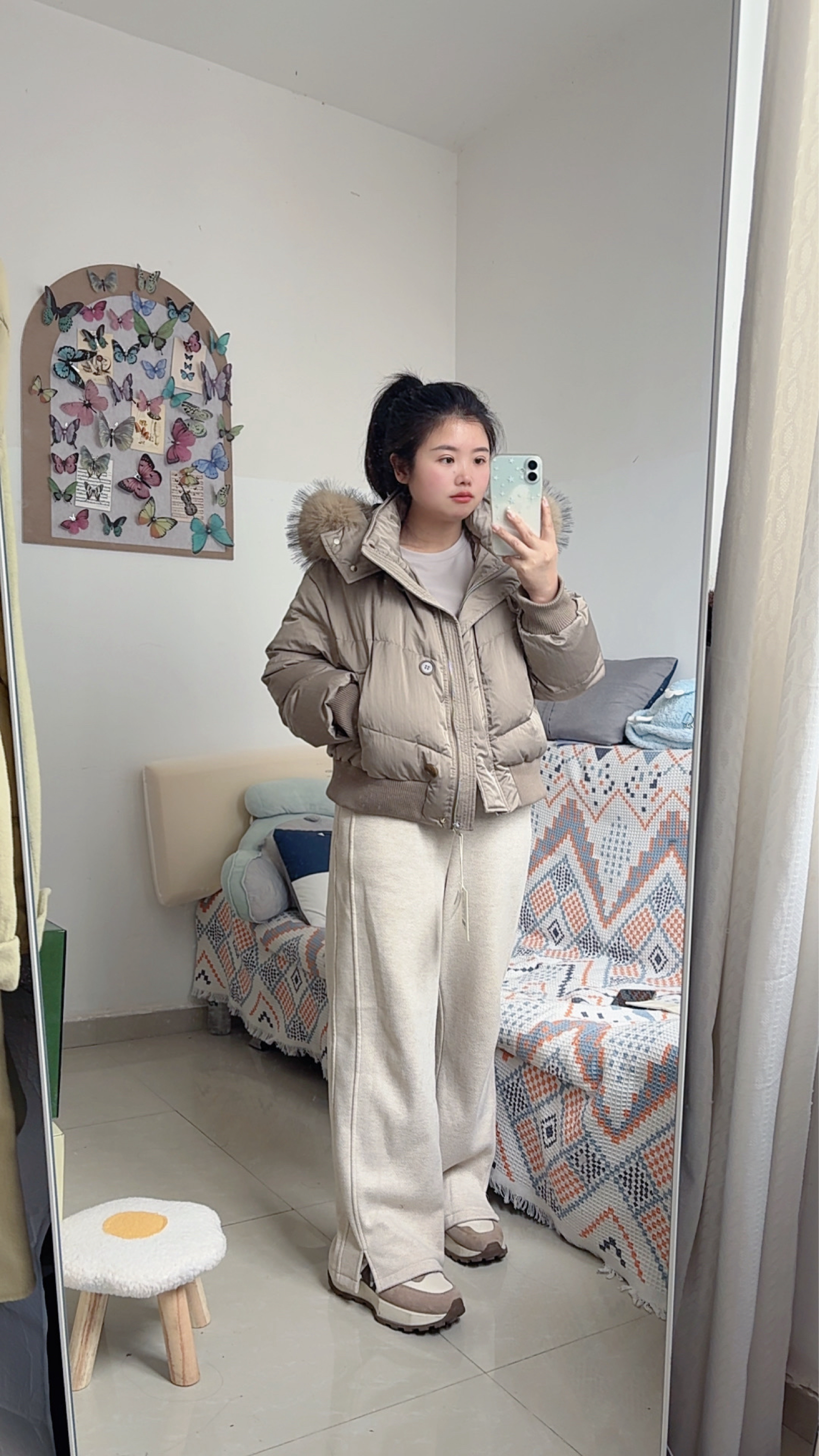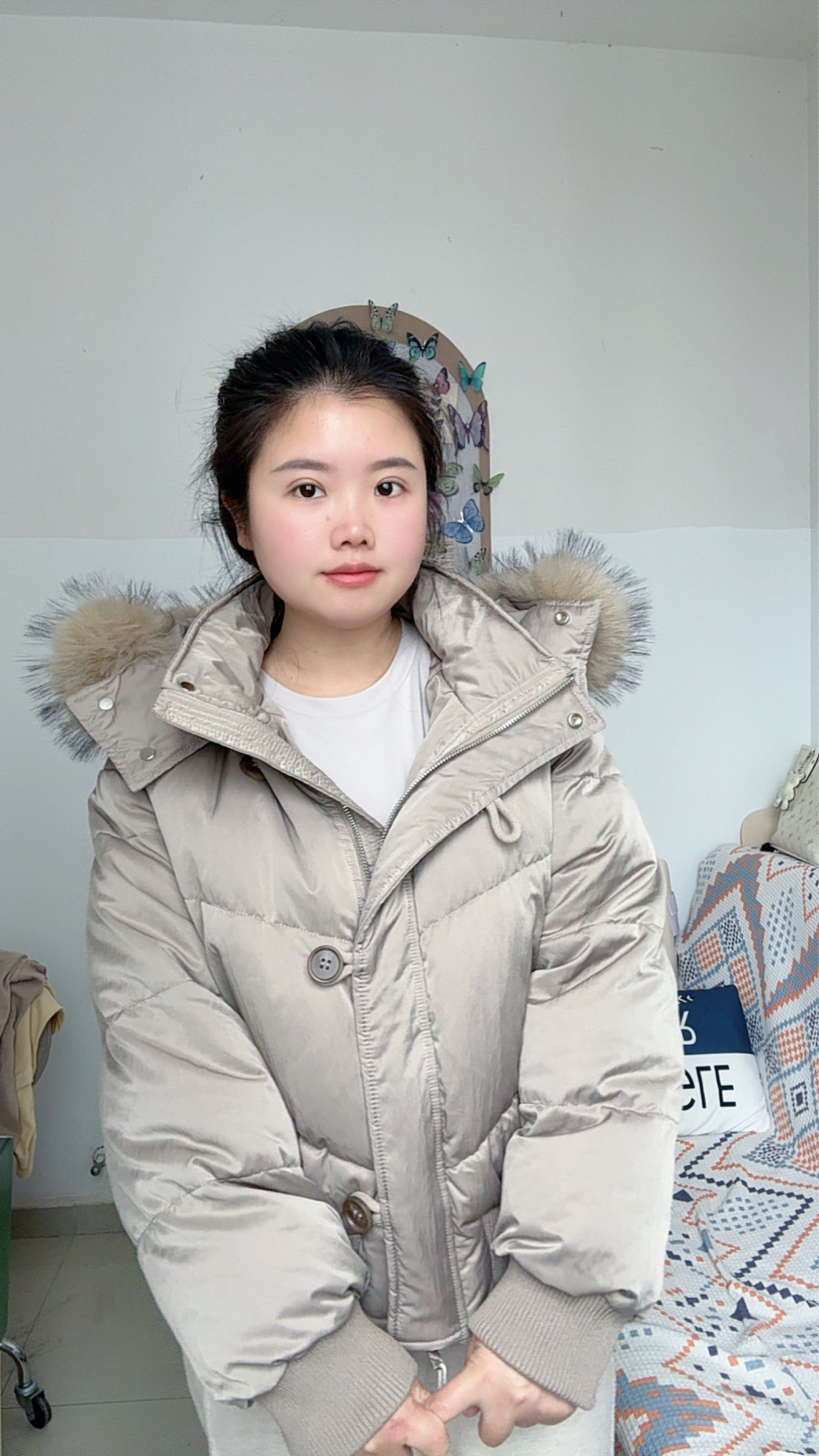 这件奶茶色羽绒服真的挖到宝了!貉子毛领软乎乎的,衬得脸小又温柔,连帽设计还能挡风。面料是哑光质感的,不会显臃肿,宽松版型对各种身材都友好,内搭毛衣、卫衣都合适。按扣+拉链的双重防风设计超贴心,南方过冬单穿就够,北方搭件打底也暖和,日常通勤穿太合适了~
