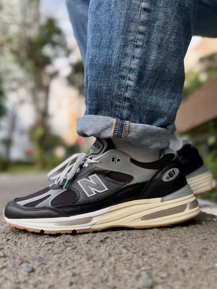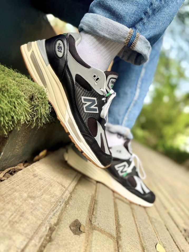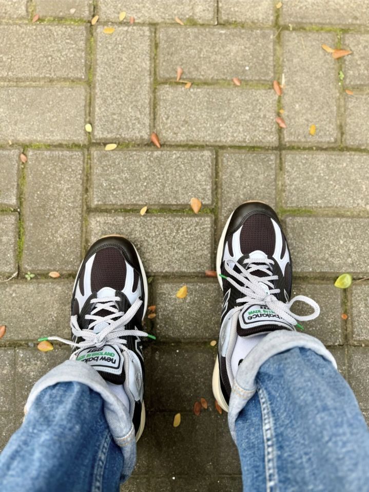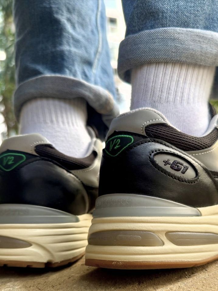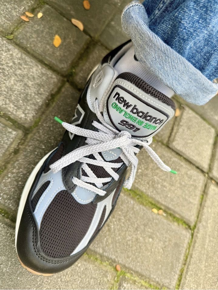 我惊于这双Up There x New Balance 991 V2英产黑灰款的吸睛度,整套复古街头穿搭的质感,全被这双鞋牢牢拿捏。 上半身选了黑色重磅圆领T恤,叠穿浅灰连帽薄卫衣增加层次,下身搭水洗蓝直筒牛仔裤,裤脚卷边露出浅灰中筒棉袜,简约的蓝黑灰配色本是复古穿搭的经典组合,却被脚边的黑灰NB991 V2抢尽风头。 我叹服这双鞋的搭配适配性,鞋身的黑灰麂皮拼接撞着银色N标,米白中底的做旧质...