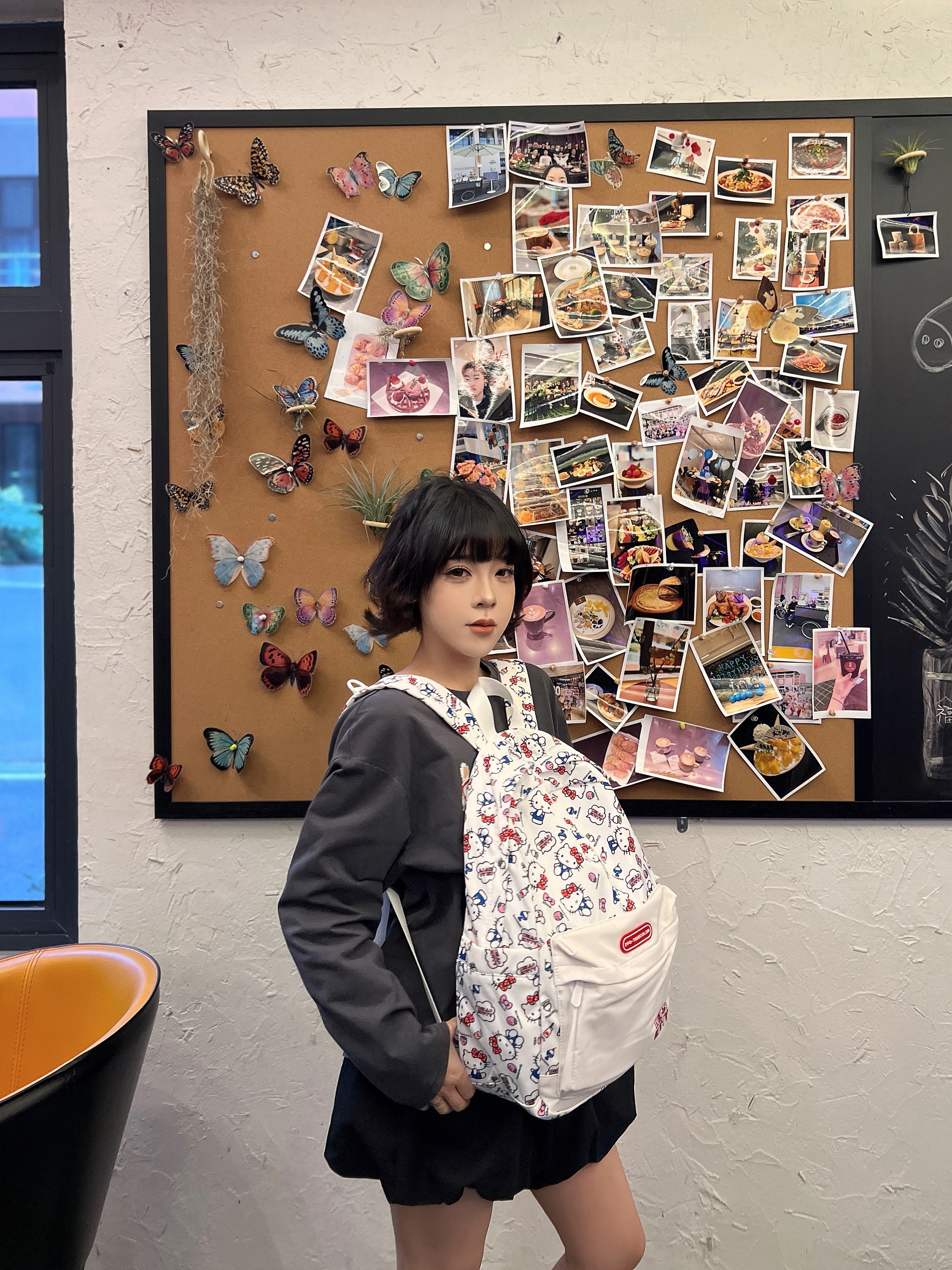 谁能拒绝满印的凯蒂猫双肩包🎒!白色底色搭配多彩图案,童趣感拉满。大容量实用又能装,日常通勤,上学出游都适配。背上它,可爱值直线上升🔝,没有哪个喜欢kitty的女孩能拒绝叭!! 尊嘟敲可爱!!容量也敲大ᕑᗢᓫ,背着它出门感觉自己是全世界最幸福的女孩~