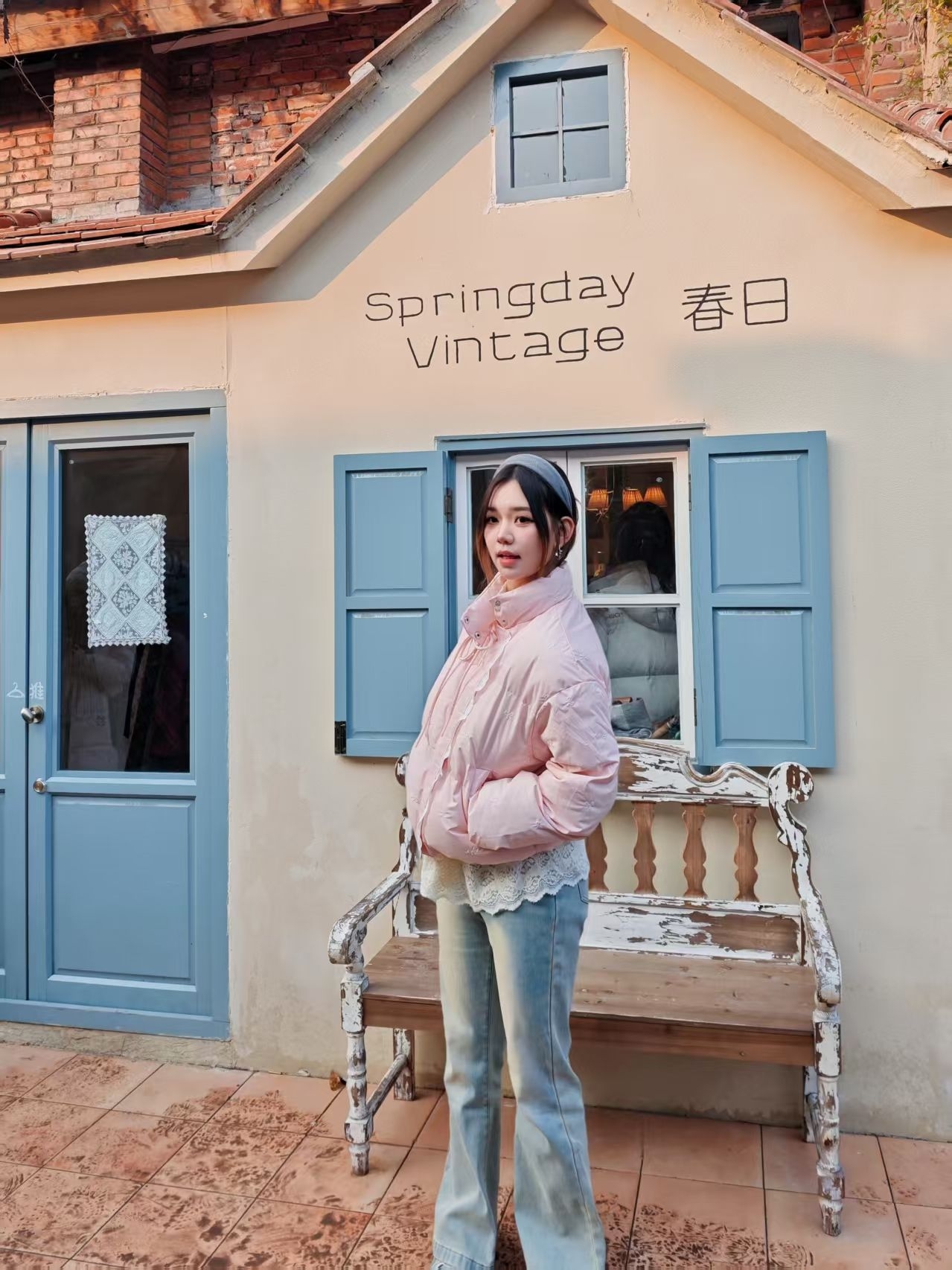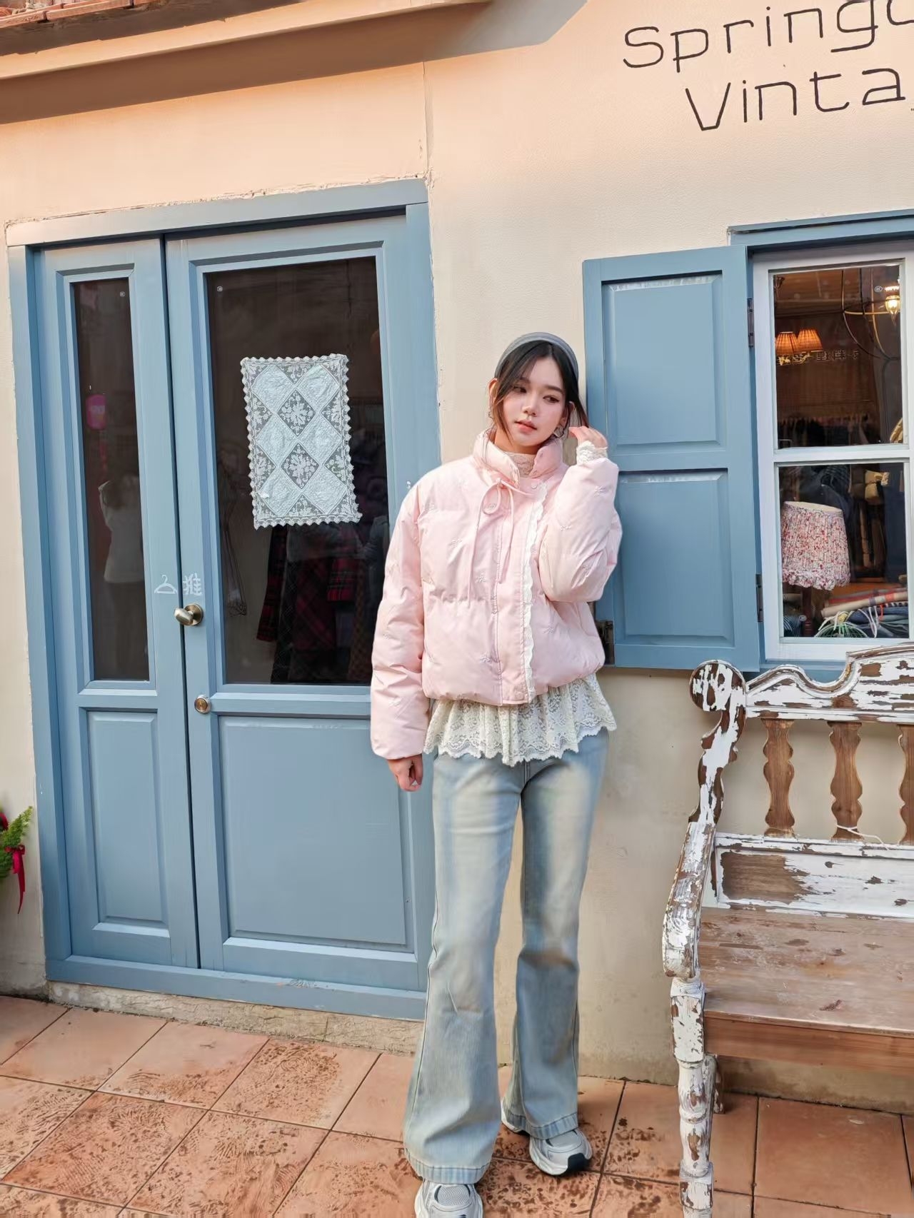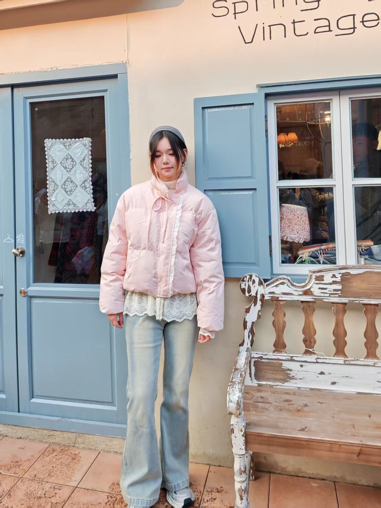 打卡春日古着店,特意搭配了这套look和店里的复古氛围适配度拉满~软乎乎粉色短款棉服 + 微喇牛仔裤,走的是「上宽下紧」的显瘦思路。棉服的温柔感中和牛仔裤的休闲,甜酷平衡感拉满。身高174cm,体重60kg,穿xl码刚刚好,也不显臃肿。💕