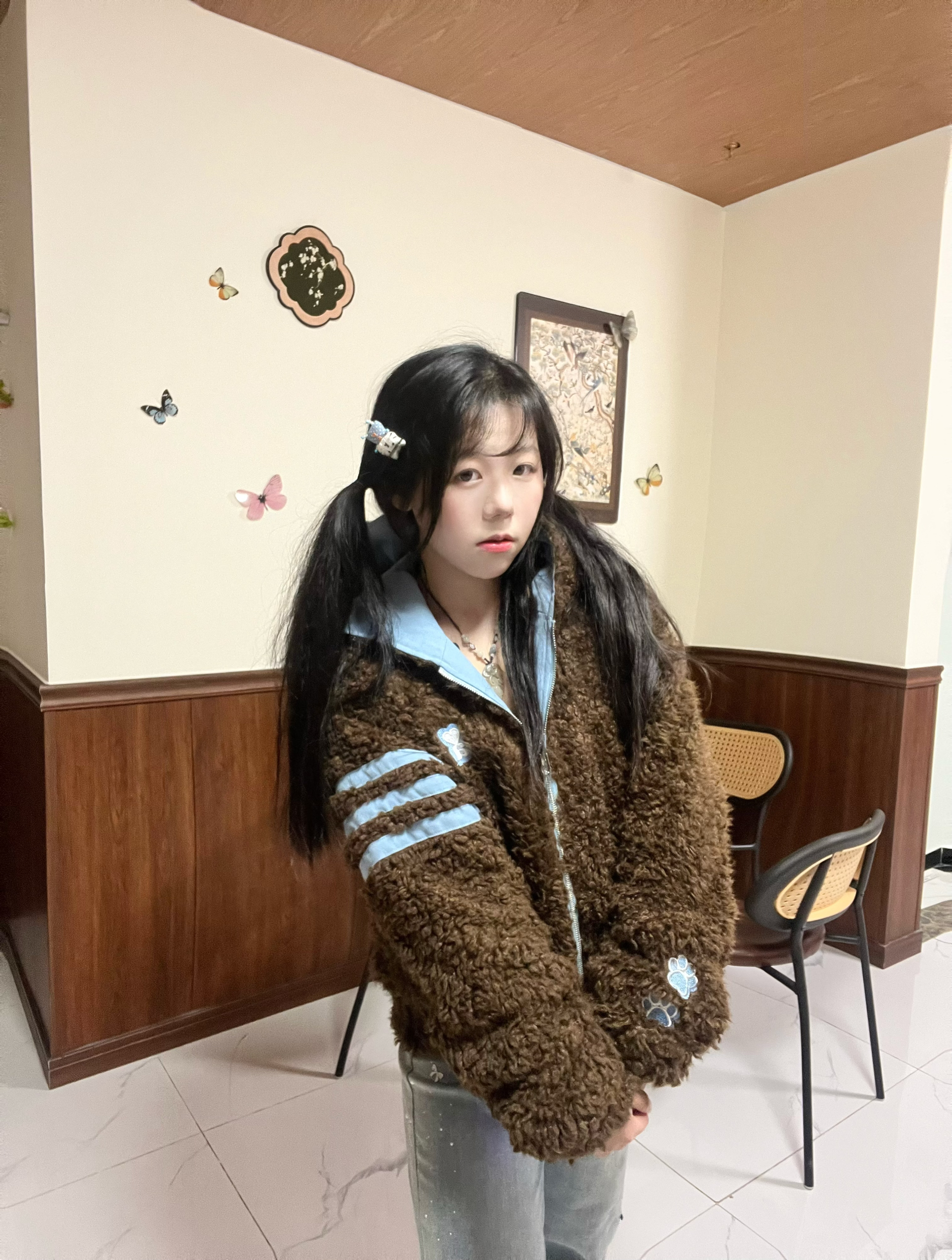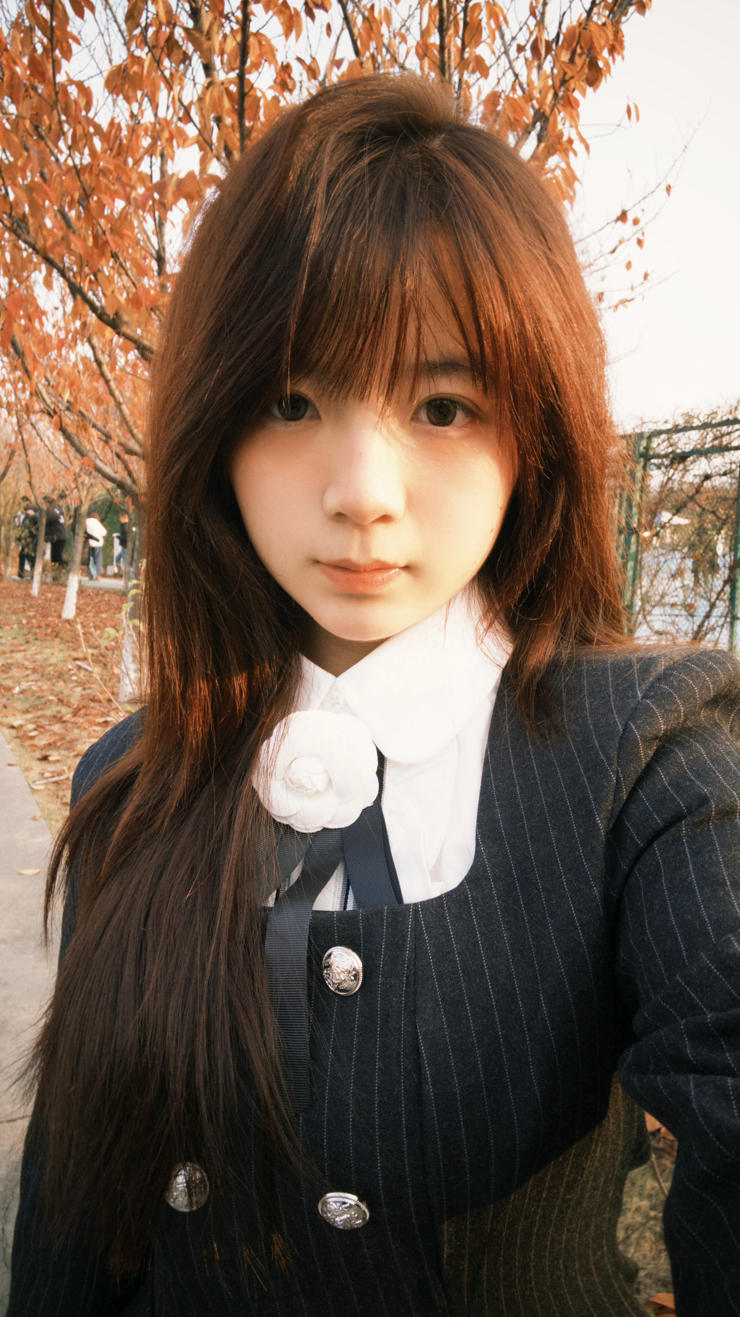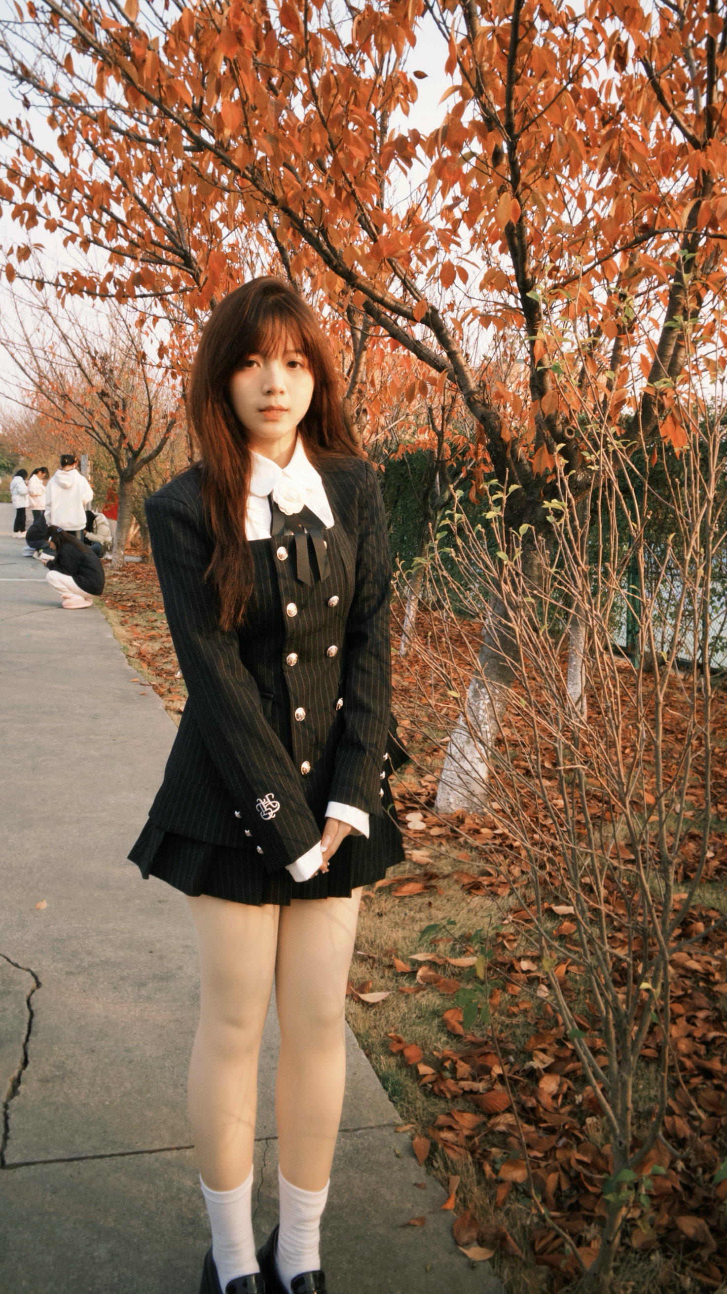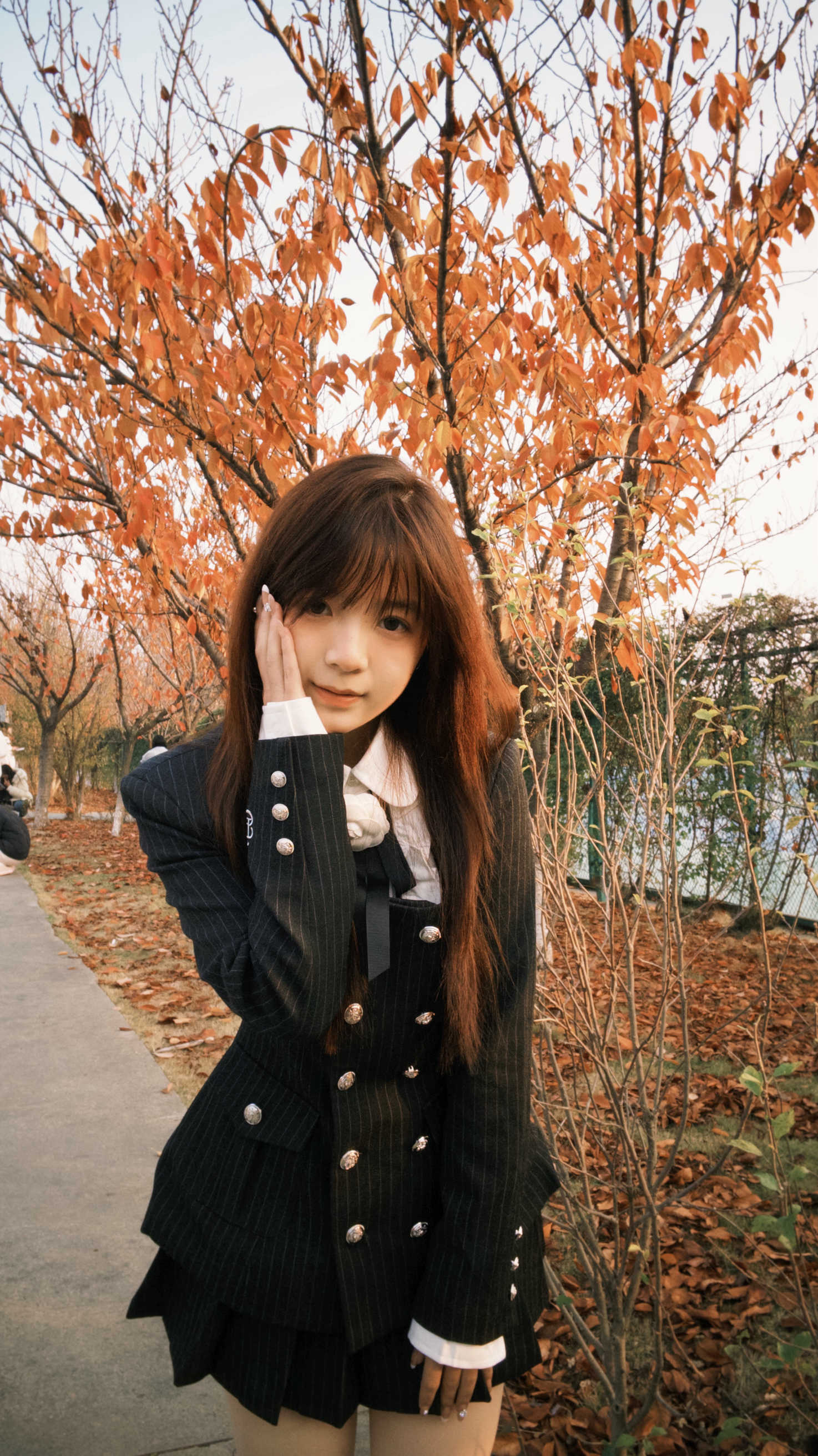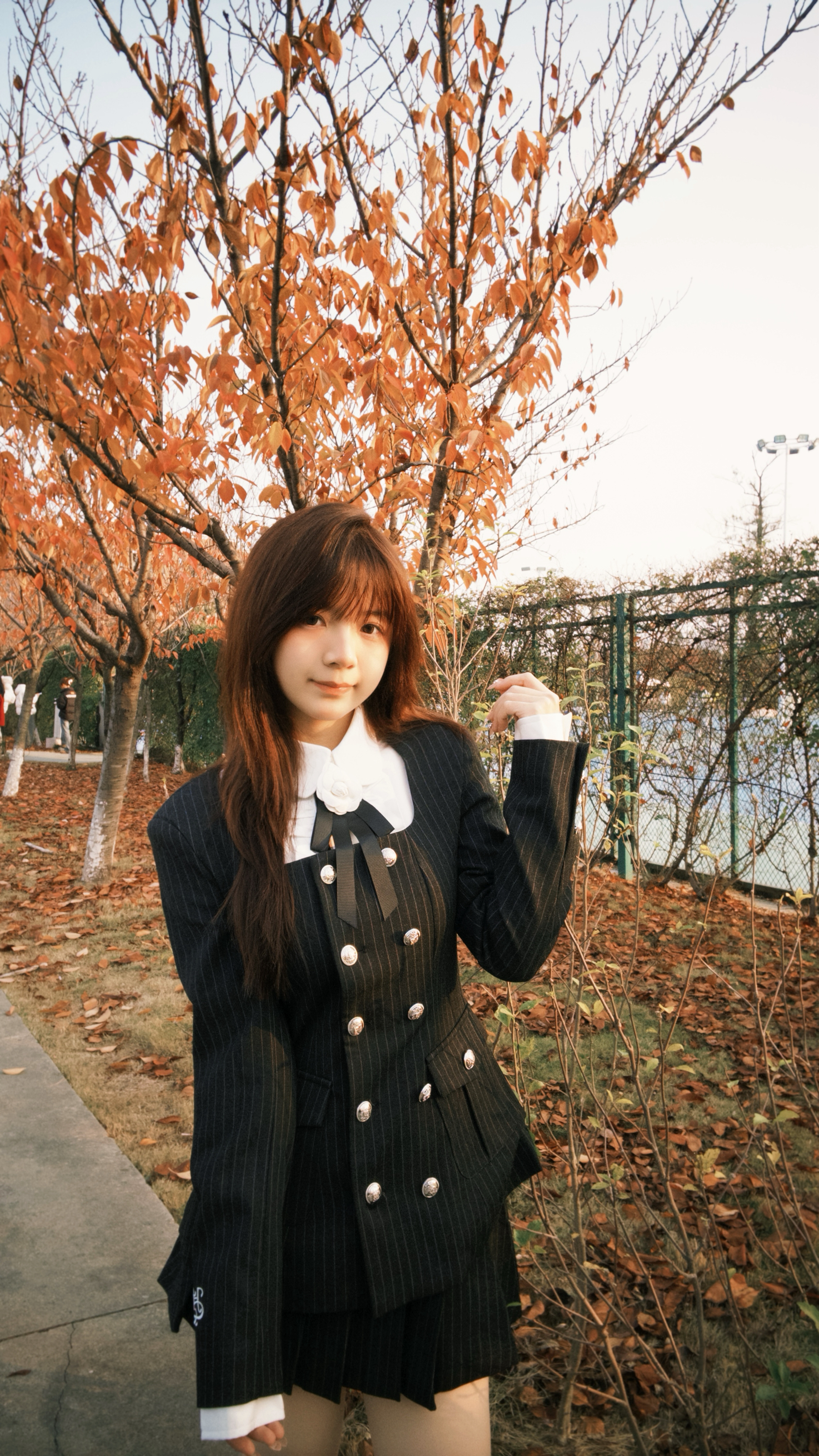 秋天的风裹着落叶味,黑条纹西装刚好适配这份松弛的学院感~领口的蝴蝶结是今日份甜,连风都变得软乎乎啦