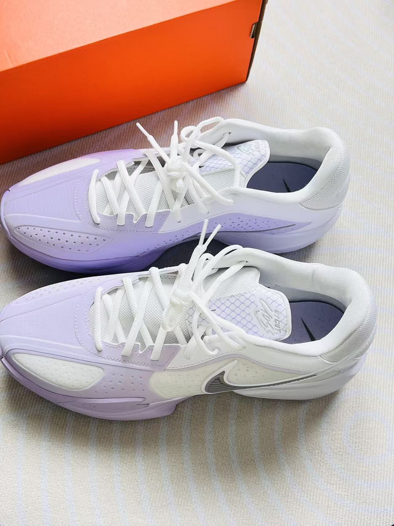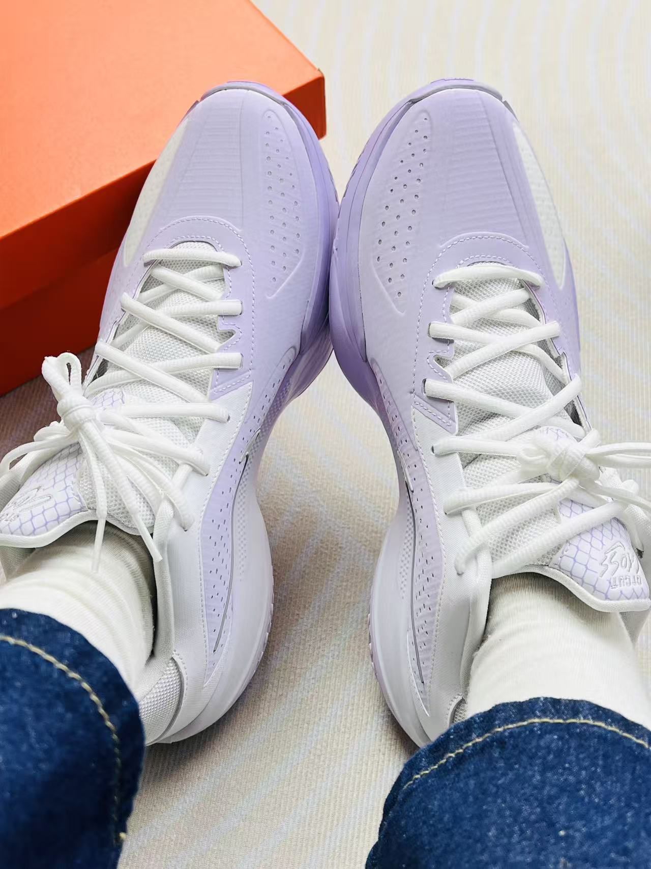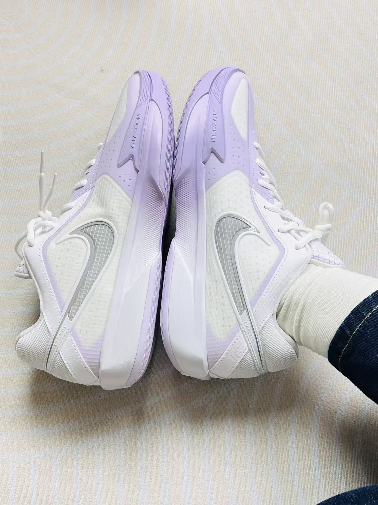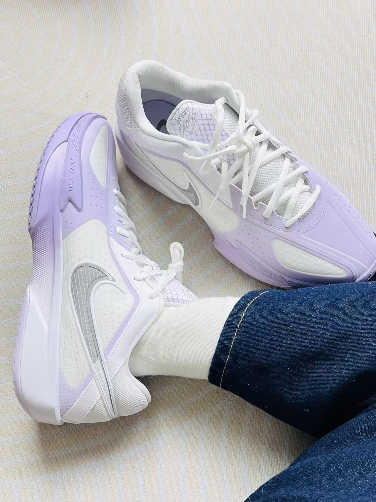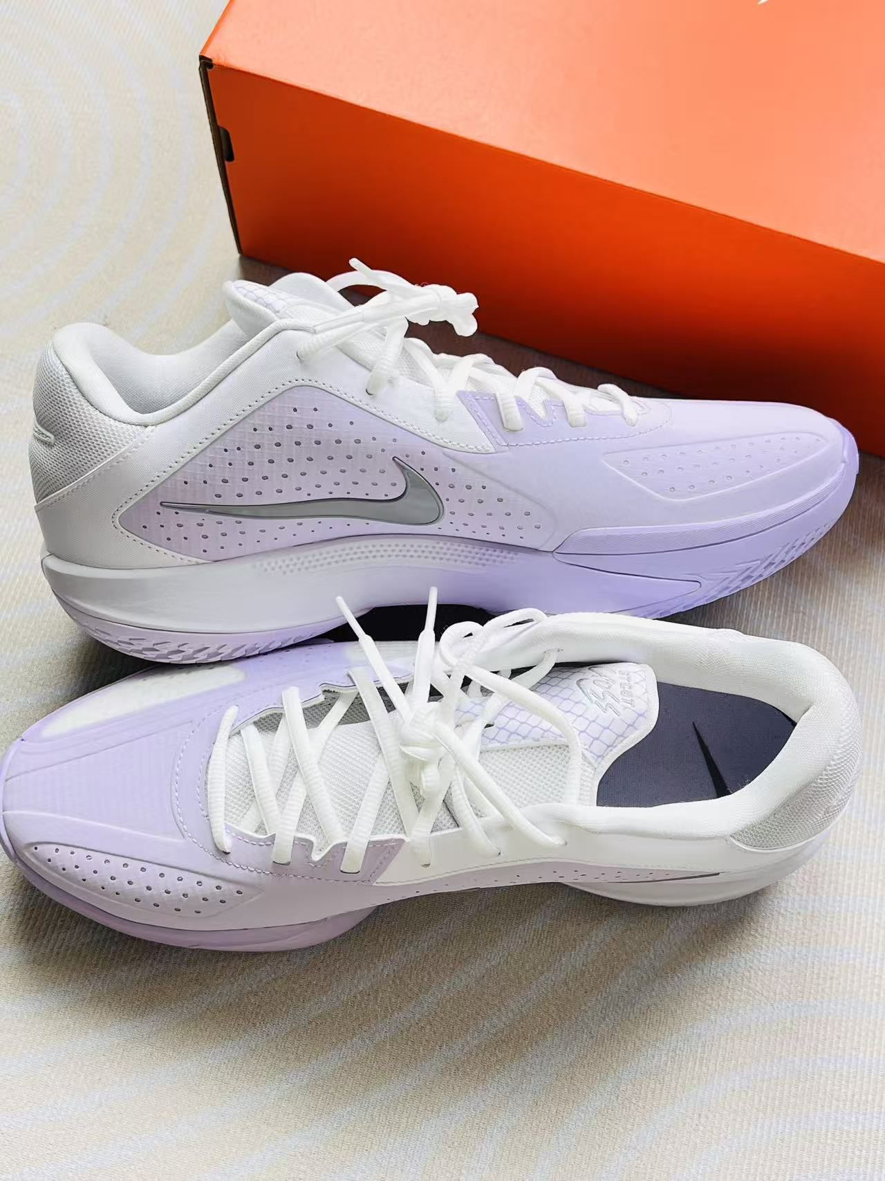 分享下这双紫白配色的Nike实战鞋上脚感受吧💜 脚感方面还挺惊喜的,鞋垫软弹度刚好,日常走路或者打半场球,脚底不会有明显的硬邦邦的感觉,前掌弯折也很顺畅,没有卡脚的情况。鞋身的网布+合成革材质,透气性比我想象中好,夏天穿也不会闷脚闷到出汗黏袜子。 不过缺点也很实在,鞋楦偏窄,脚宽的朋友得选大半码,不然挤脚的感觉会很明显😐。另外鞋底的橡胶材质偏软,在水泥地打了几次球,边缘已经能看到轻微的磨损了,...