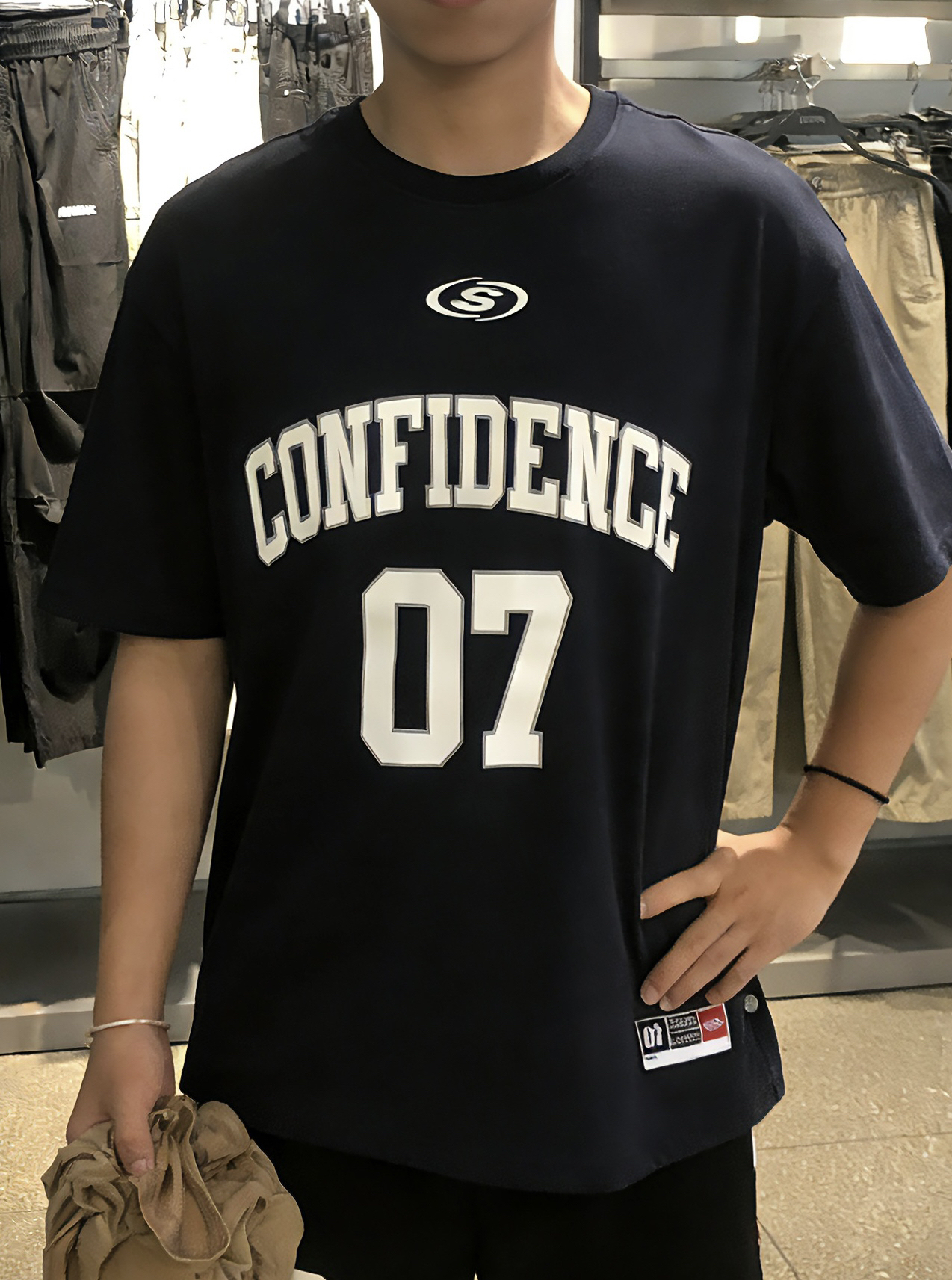 这件衣服质感很好 整体版型比较适合身材比较壮的兄弟 会显得胸🐔明显照片没拍出来 藏蓝色也不会显黑同时也没有黑色那么普通 坚持运动的兄弟无脑冲就完事了