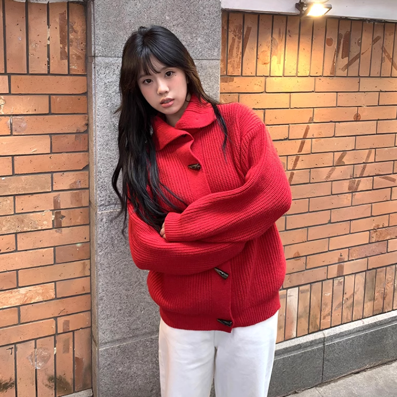 2025年度封神穿搭必须是这件红色牛角扣毛衣!过年穿红也能不土气,软糯的针织面料贴身穿超舒服,单排扣的设计还能敞开当开衫,一衣两穿太值了~ 我搭了简单的黑色打底和牛仔裤,红色在街头特别出挑,牛角扣的复古细节让整体造型不单调,不管是拍新年照还是日常出门,氛围感直接拉满! 这件毛衣的版型是微宽松的,对各种身材都很友好,藏肉又显元气,新年想穿红又怕浮夸的姐妹,闭眼入这件准没错~
