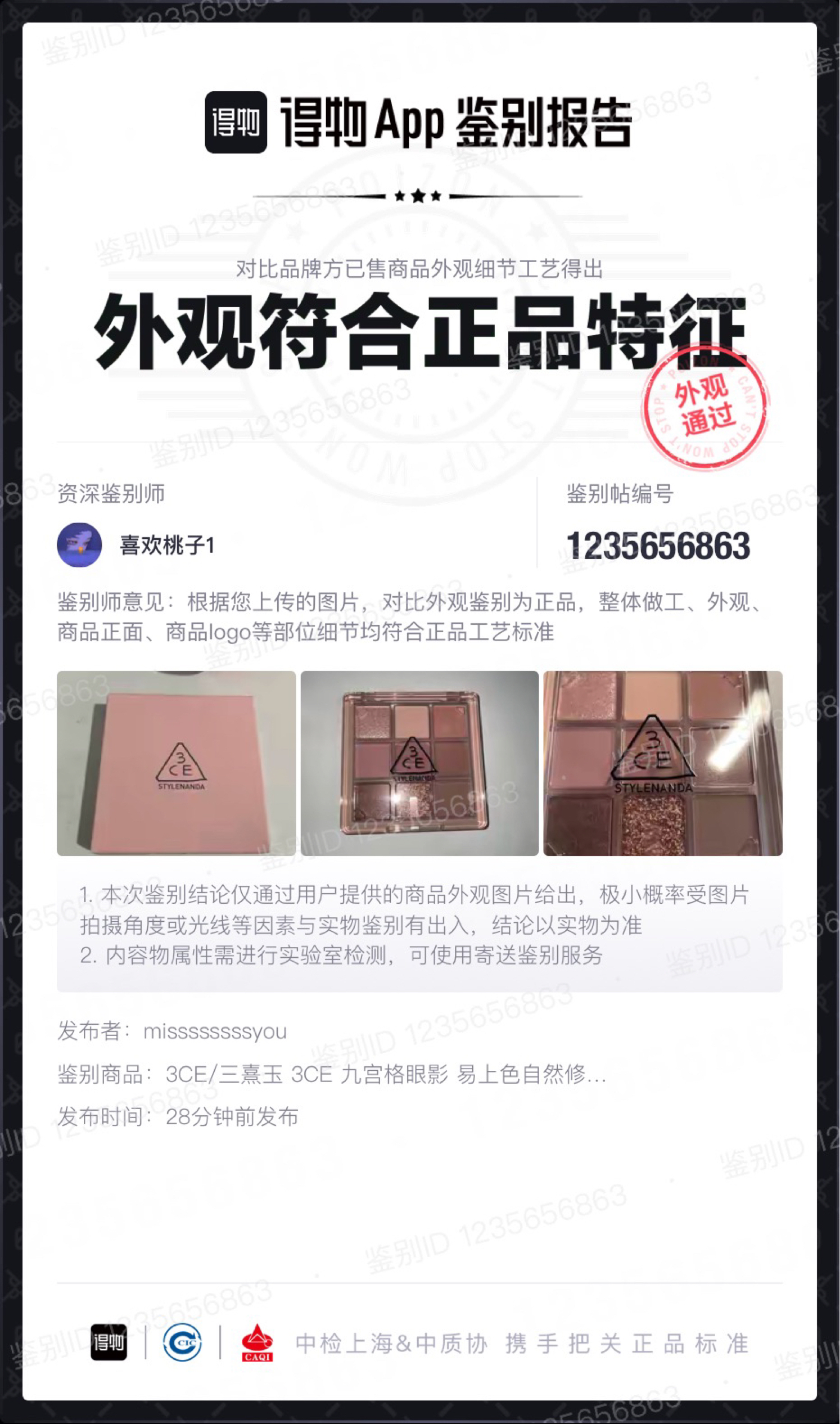 正品3ce9色眼影盘 我买的是芋泥盘 颜色很好看 高光很闪得物鉴定过了是正品 想买的姐妹可以放心入手