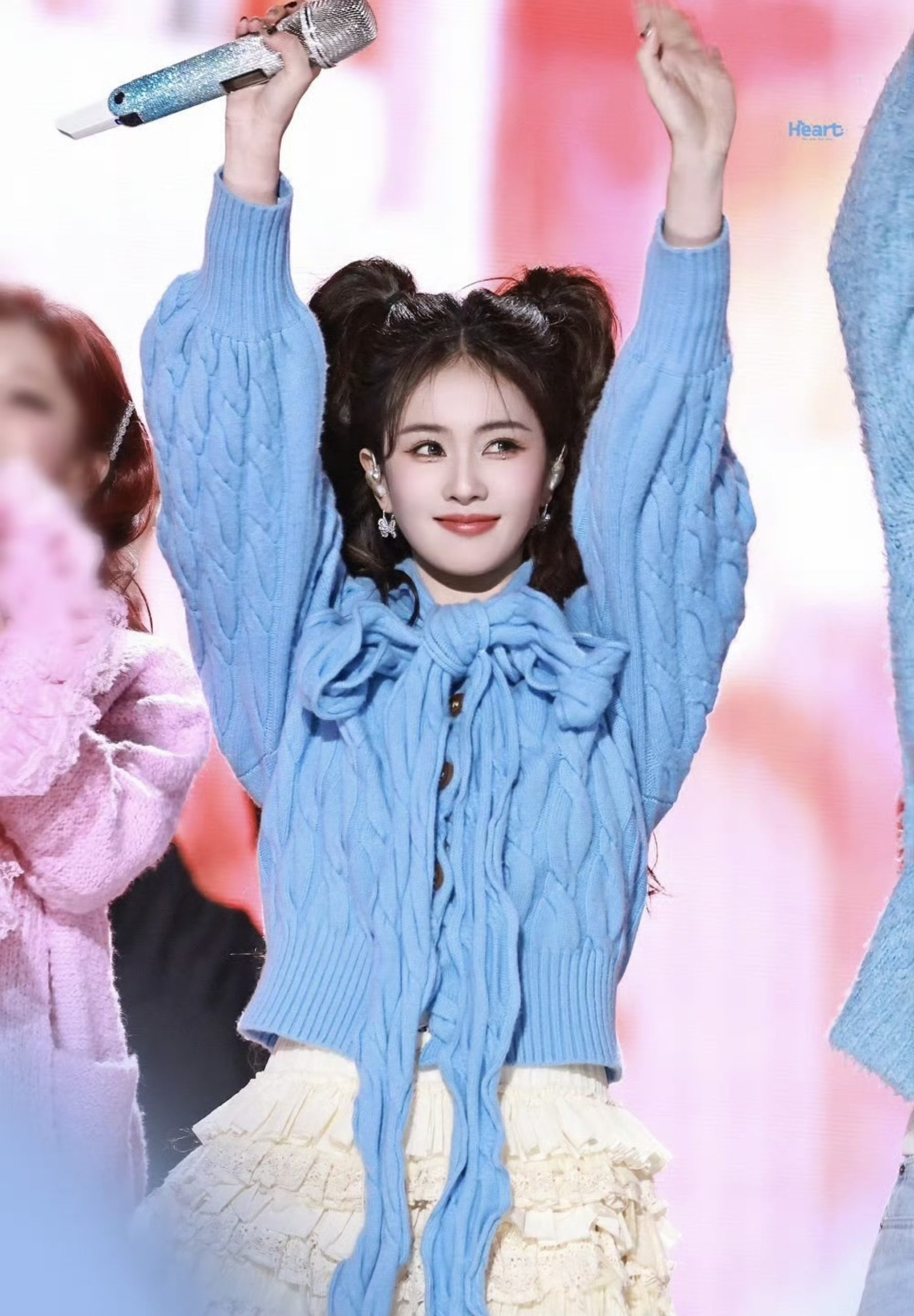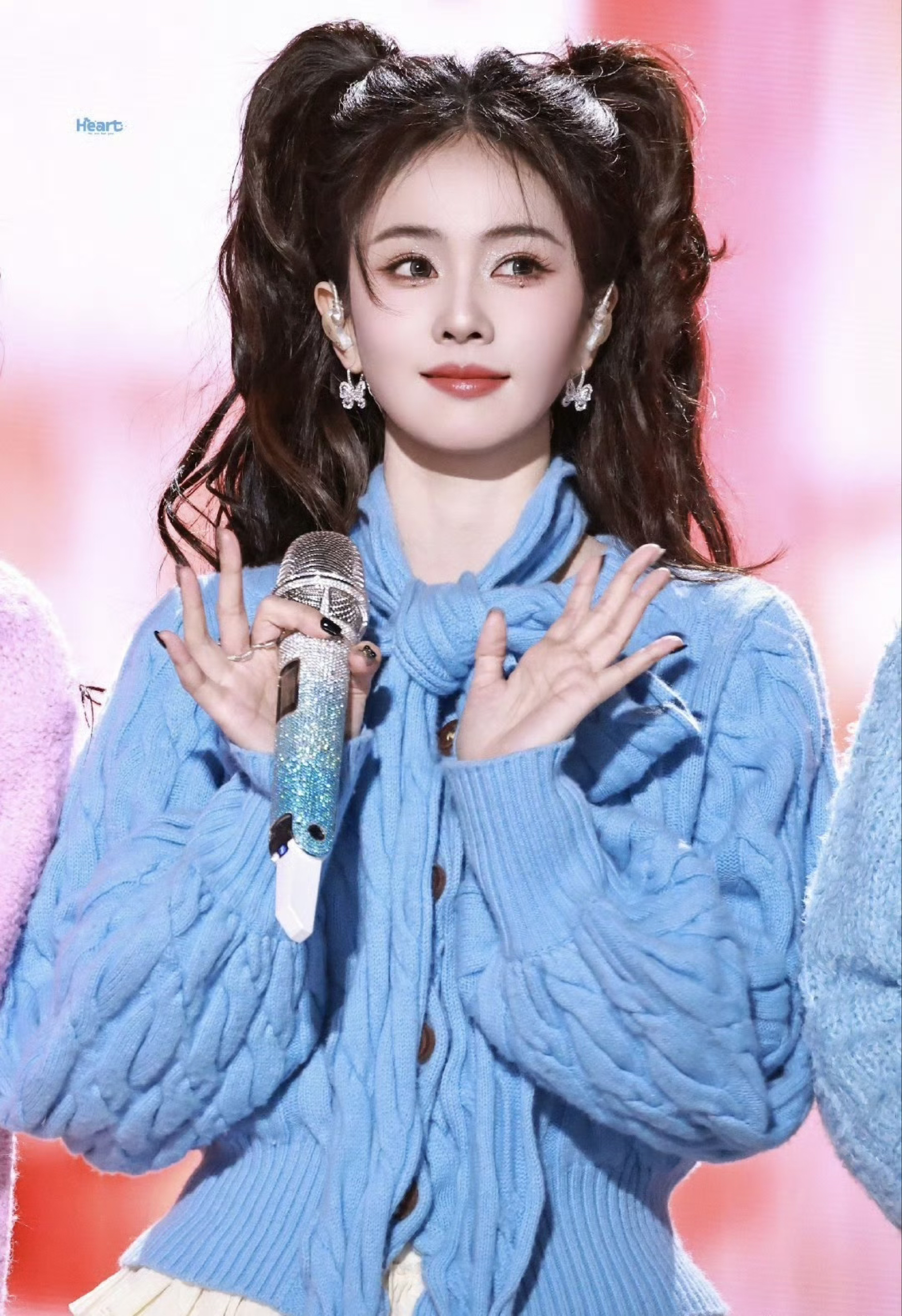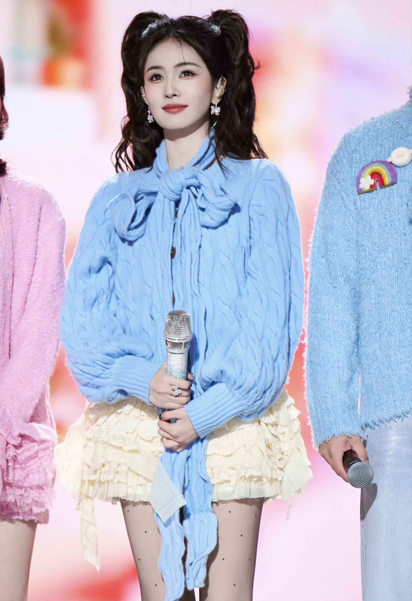 白鹿参加跨年晚会这套穿搭甜美又富有活力。 baby蓝针织衫自带软萌滤镜,超长系带设计增加了灵动感。搭配米白色层叠短裙,少女感十足。 白色毛绒雪地靴不仅保暖,更与整体的甜美风格完美呼应,非常适合打造冬日里的元气造型。