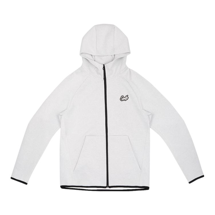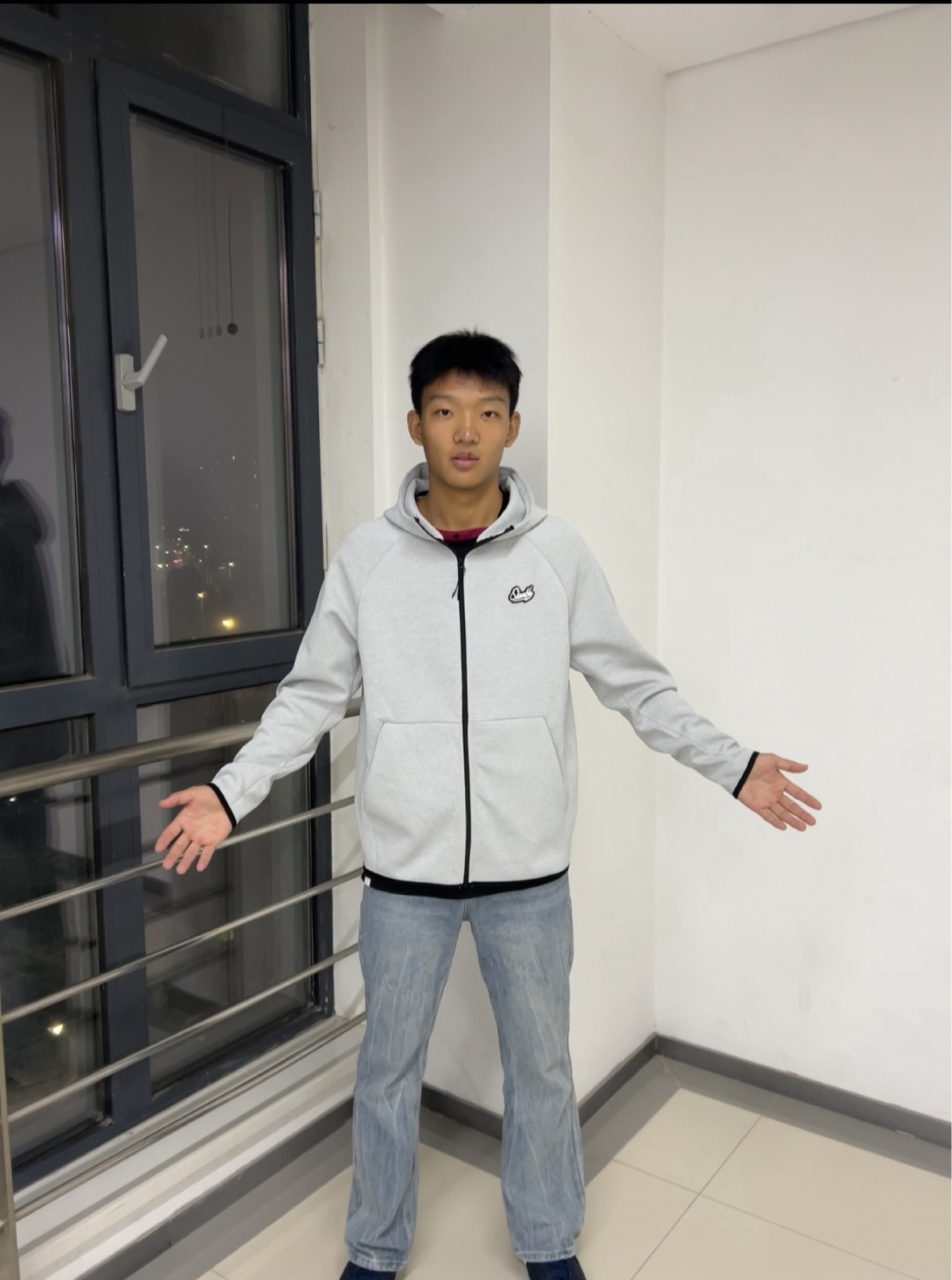 浅灰色连帽卫衣外套自带清爽感,搭配浅蓝色牛仔裤,配色和谐不突兀,运动风与休闲风结合得比较自然,日常穿很合适。