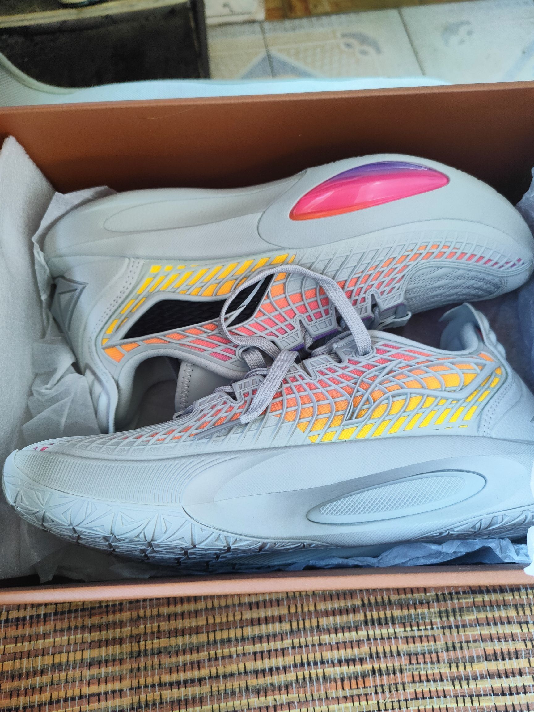 家人们,这双李宁球鞋真的太绝了!外观是那种灰底搭配橙粉渐变网格,颜值超高,配啥裤子都好看。脚感更是一绝,前掌软乎乎的,后掌气垫弹到飞起,缓震效果特别好,打球起跳落地都不伤膝盖。抓地力超强,水泥地上急停变向稳得很,纹路耐磨,打很久都不磨损。包裹性也特别好,鞋带一拉就紧,脚踝安全感满满,还不磨脚,不过尺码偏大半码,买的时候注意选。透气性也没得说,夏天打球脚都不咋出汗。400多块的价格,这配置性价比直接...