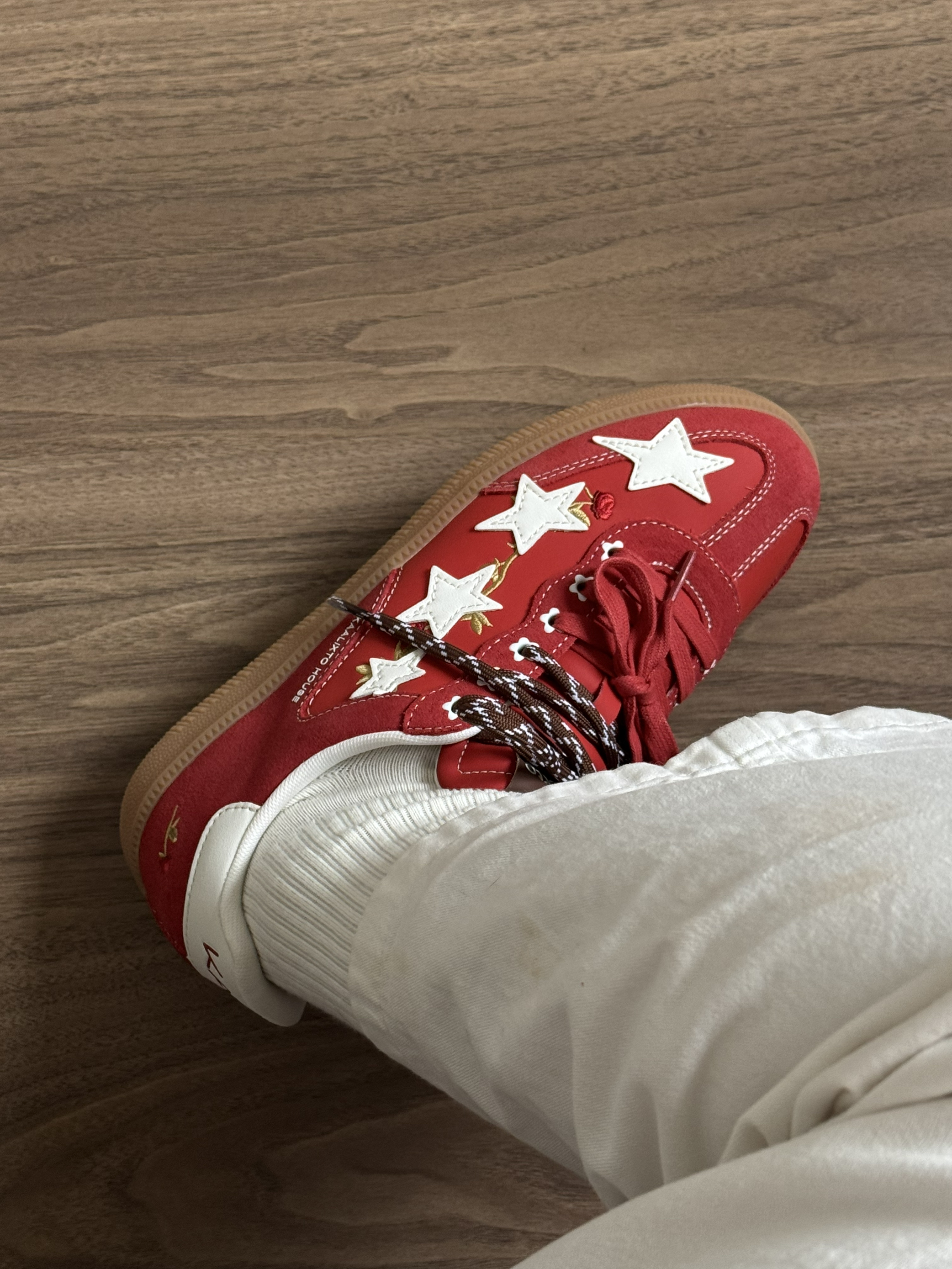 一眼喜欢上了这一双~ 配色真的超级适合新年穿‼️ 玫红色越看越好看👀 新年穿红色感觉会带来好运气~ 鞋面的玫瑰刺绣和星星印花好好看✨ 脚感也很好~ 穿出门很吸睛耶👀