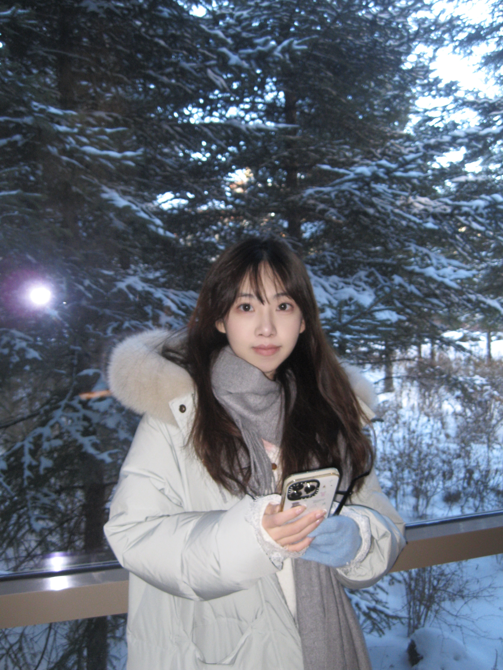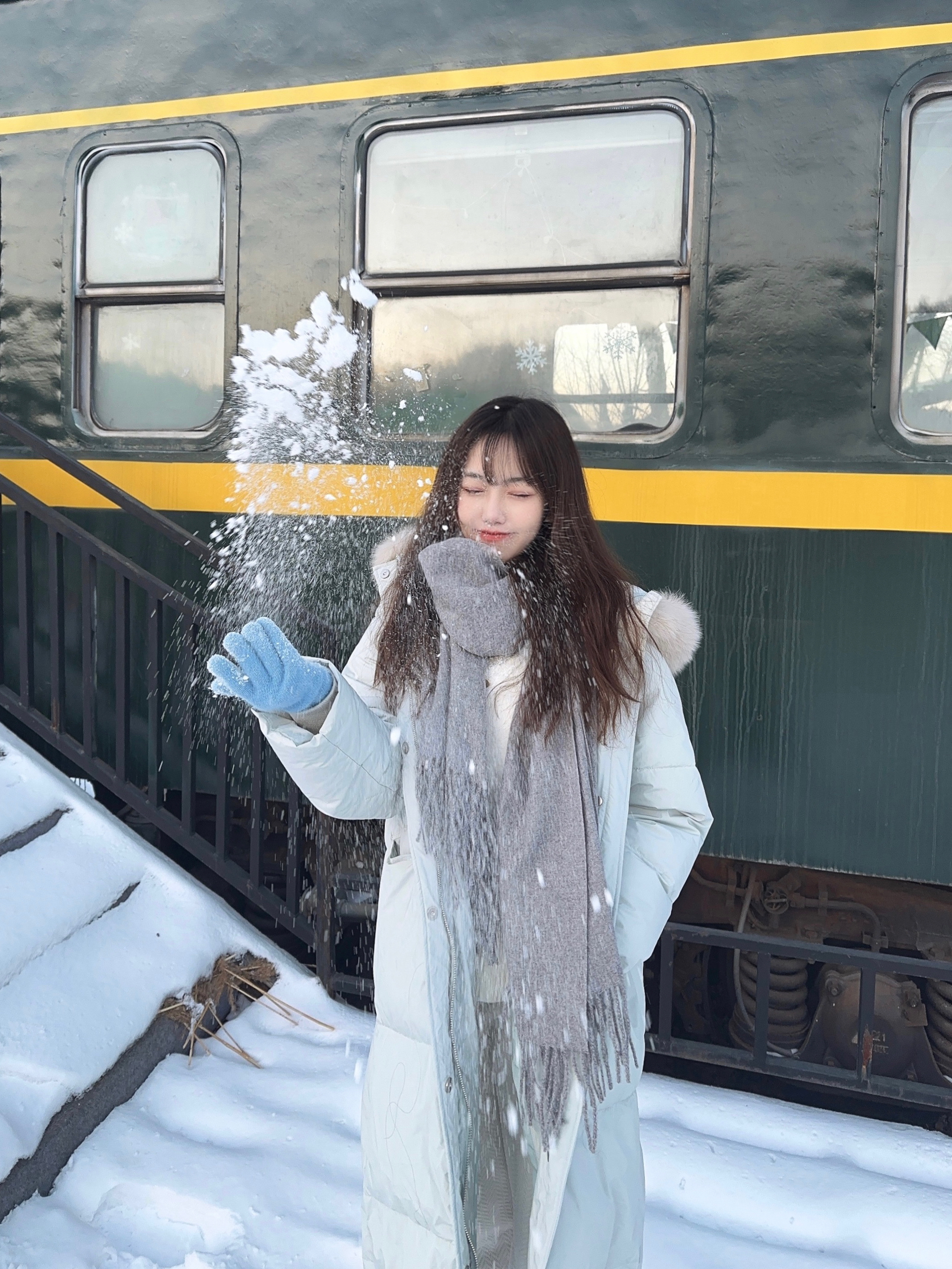 浅色系在雪地里真的很出片 可以穿蓝色的长款羽绒服 搭配紧身加绒鲨鱼裤 再配上灰色的围巾,特别出片