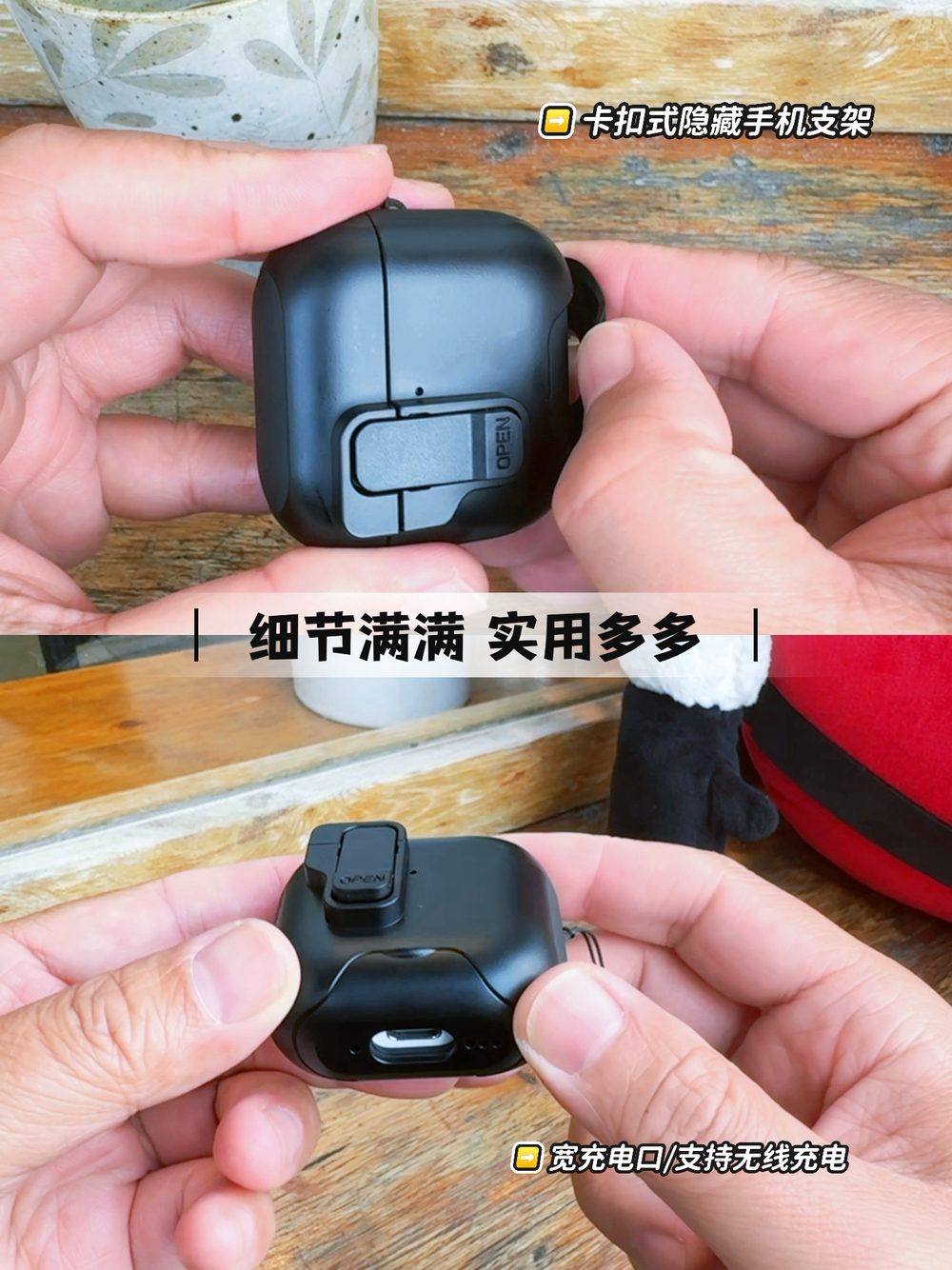AirPods从初代到现在7款全是同款大白壳,还没看腻?!耳机充电仓裸奔揣兜放包久了,势必会磨出一堆划痕,出门还极易撞款,选款好用又好看的保护壳才明智✌️。 我手里这款采用磁吸+锁扣的设计,能方便地单手一键开合。别看是小东西,设计却处处走心—一充电口够宽不卡线,四角圆润不硌手,还贴心做了隐藏式卡扣支架,无聊时掀开卡扣放上手机,追剧超方便!选个喜欢的颜色套上,防刮又有专属感,彻底告别千篇一律~