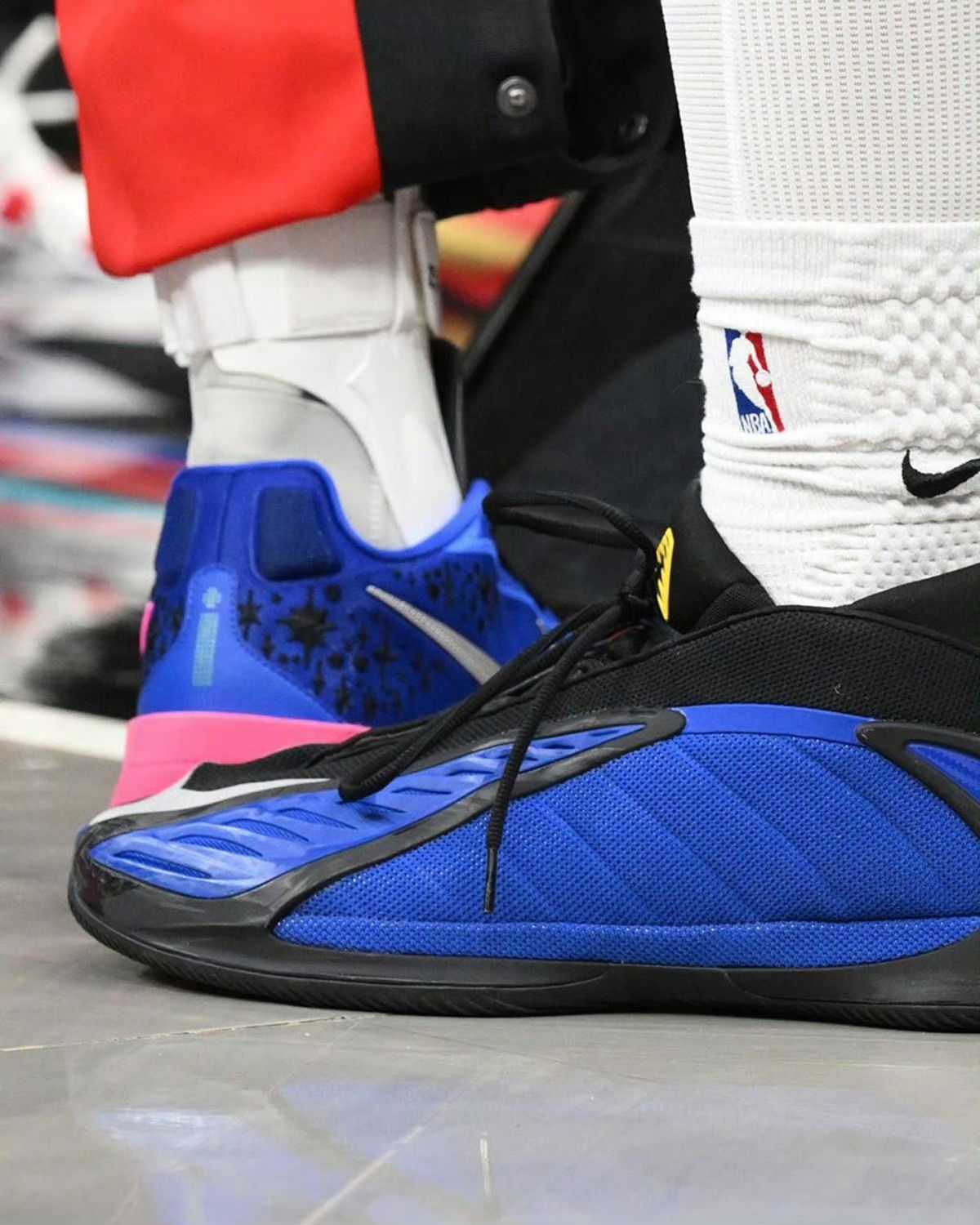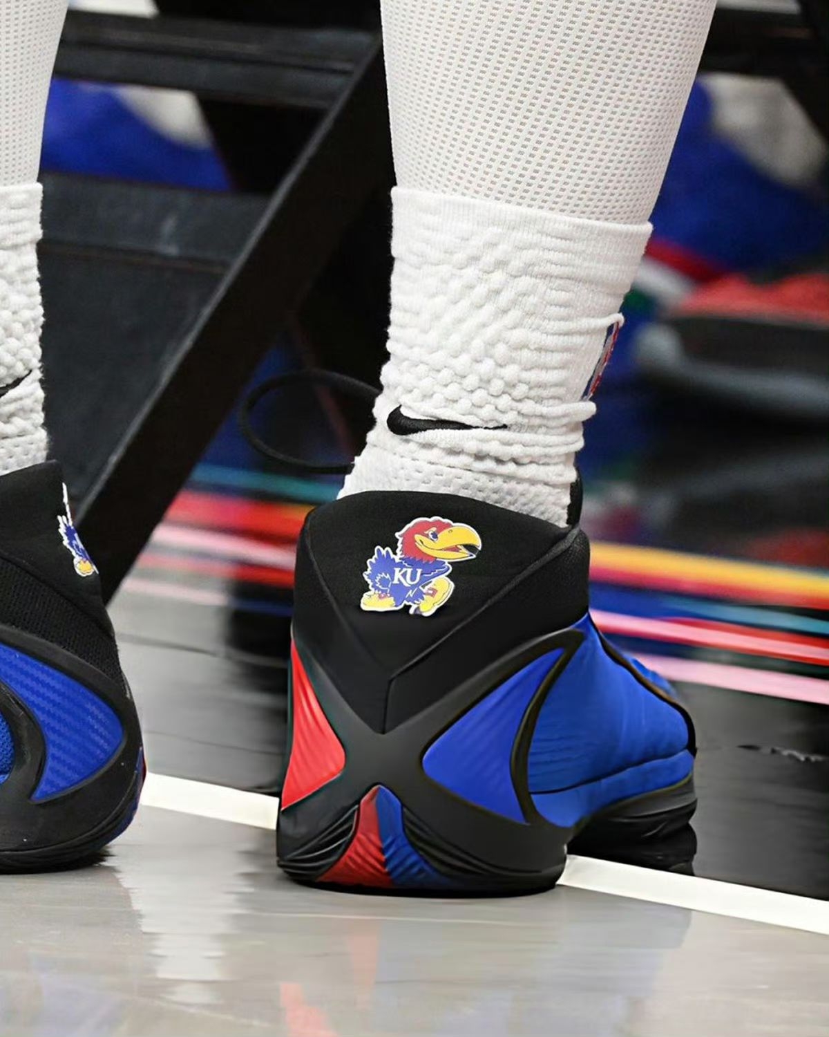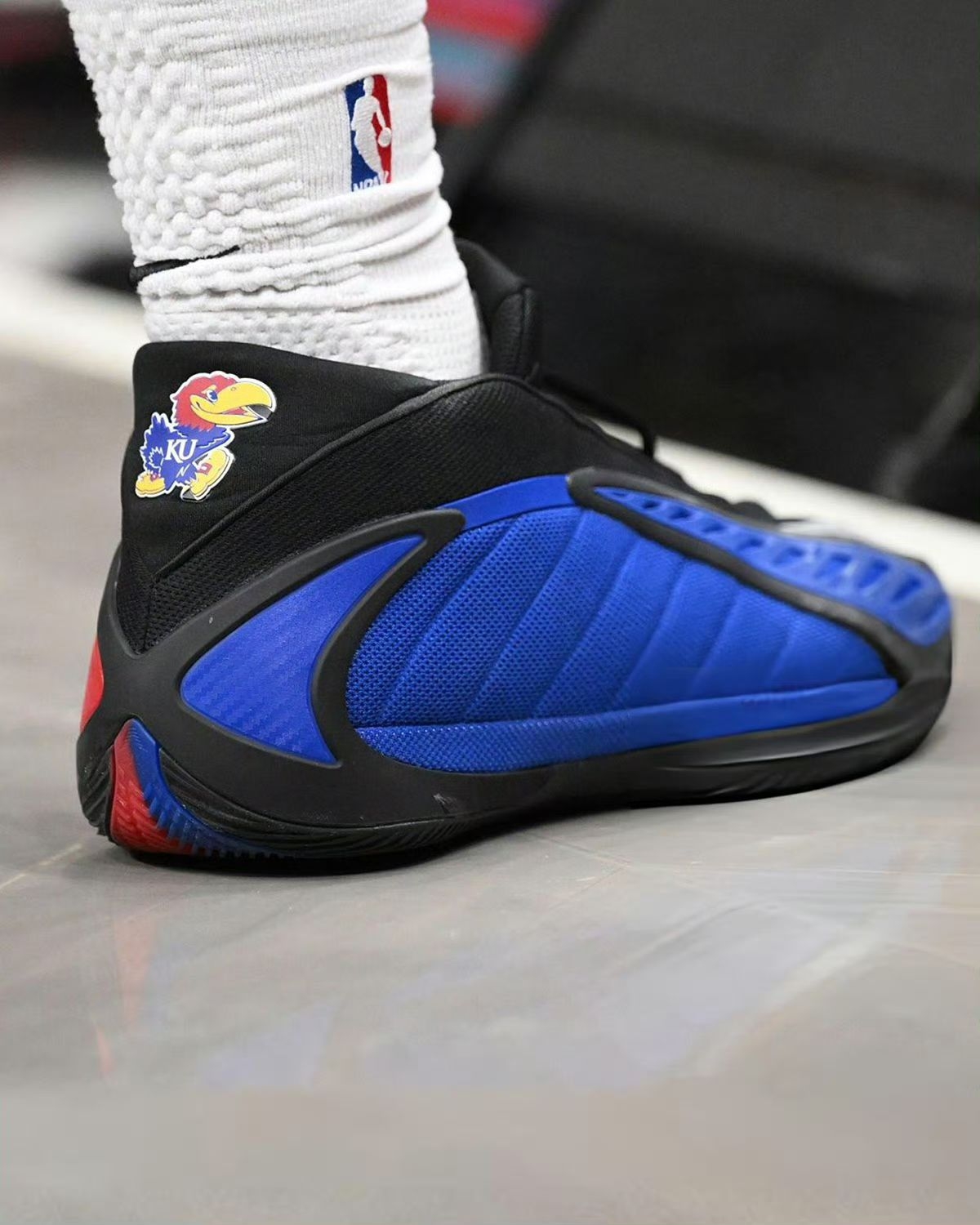 猛龙迪克上脚的AE 2 Kansas PE,绝对是篮球鞋圈里情怀与实力双在线的宝藏款! 颜值上,鞋身以堪萨斯经典宝蓝为主调,红黑线条勾勒出利落的流线型轮廓,赛场灯光下鞋身的光泽感直接拉满,不管是搭配球裤实战还是日常出街,这抹亮眼的蓝都能瞬间成为造型焦点。细节处更是藏满巧思,后跟的Jayhawk徽章复刻堪萨斯松鹰队图腾,鞋帮NBA标与鞋舌的粉蓝点缀相互呼应,把校园情怀和职业赛场的联结具象化,篮球...