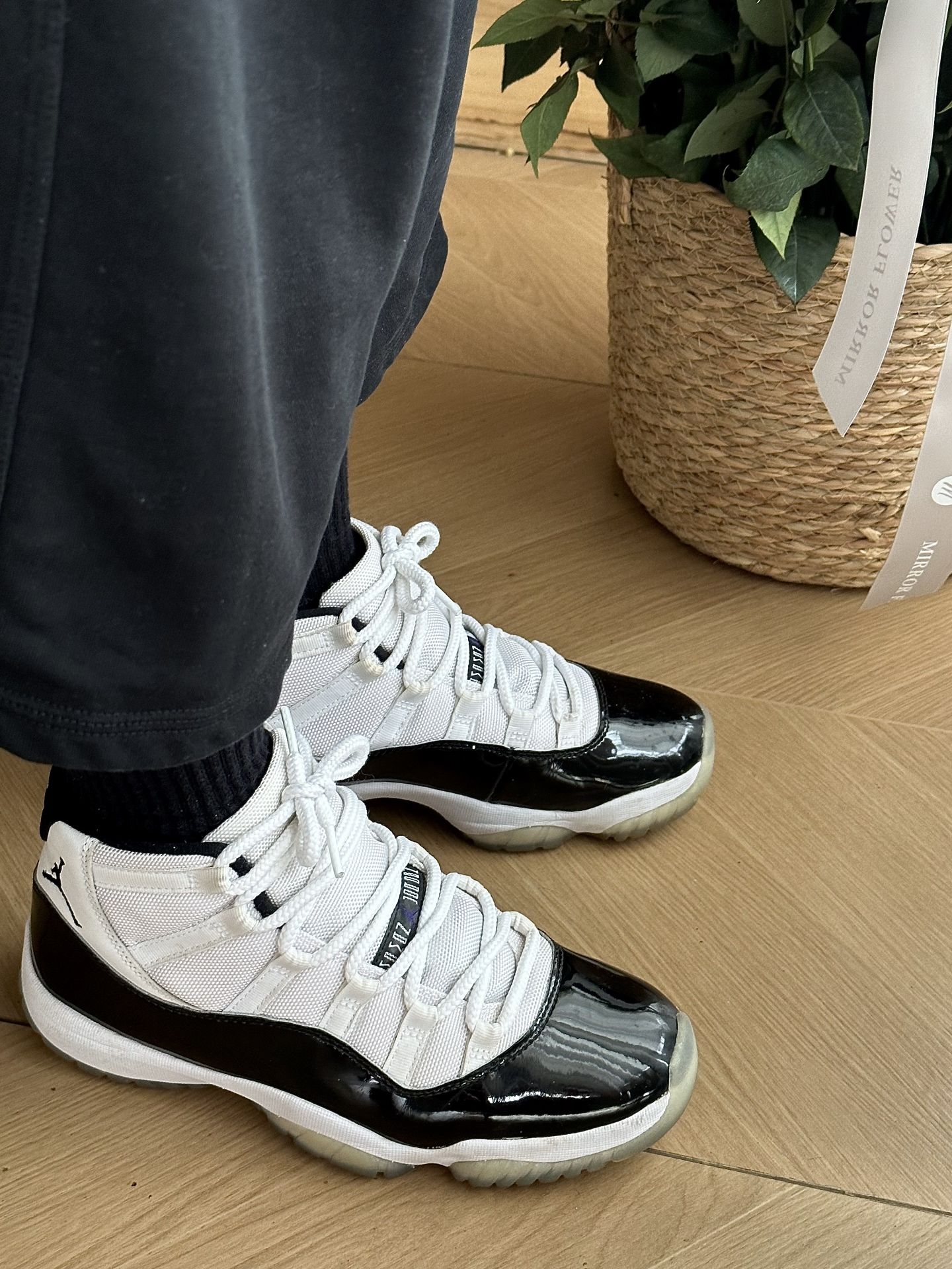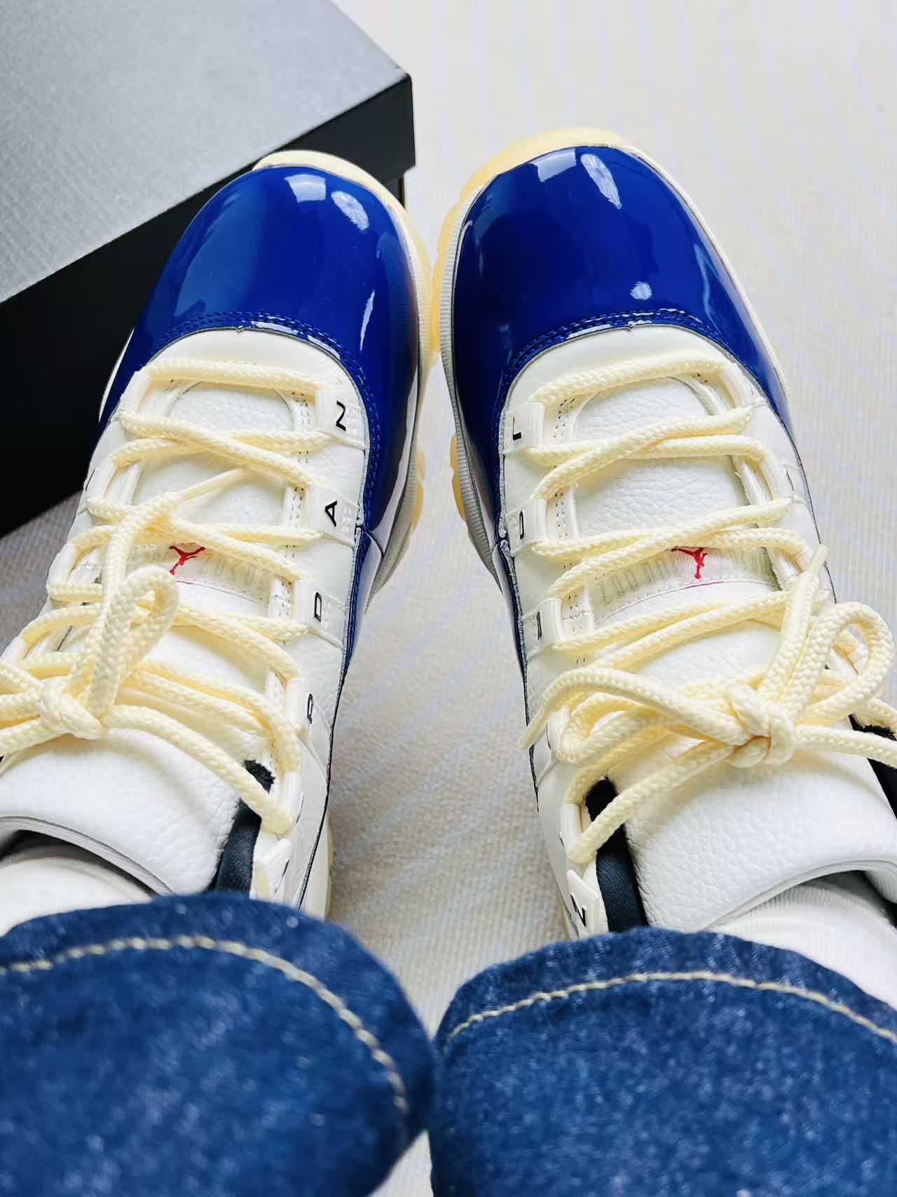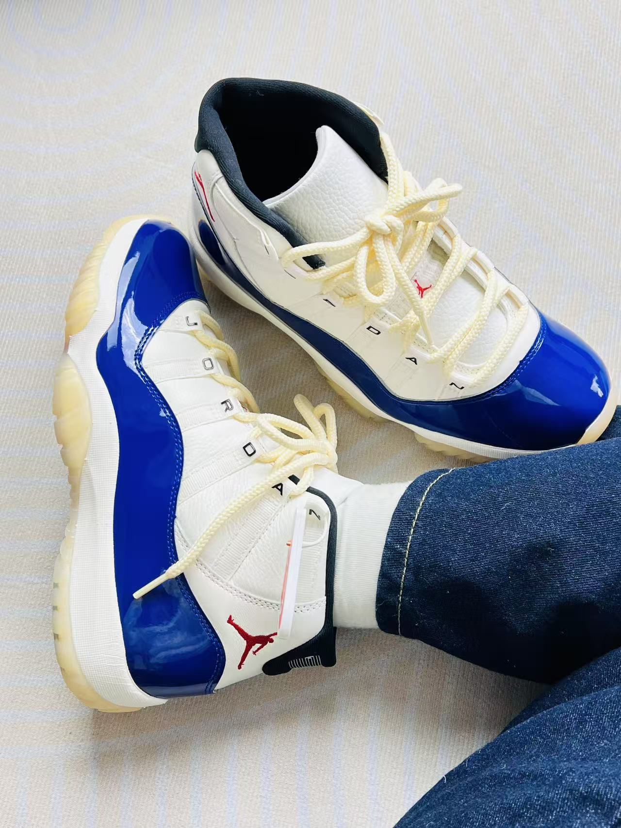 分享这双AJ11的上脚真实感受吧🏀 鞋身的漆皮蓝白撞色很有质感,搭配米白的鞋身,复古感拉满,日常搭牛仔裤或者运动束脚裤都很出片,颜值这块确实没话说✨。脚感上,中底的缓震反馈比较柔和,走路时脚底不会有生硬的感觉,高帮的鞋帮包裹也很贴合脚踝,不会晃荡。皮质鞋面的支撑性也还可以,日常穿的稳固感够。 缺点也挺明显的,漆皮部分特别容易留划痕😓,才穿了两次鞋头就有几道细微的痕迹了。而且鞋底的氧化速度比我想...