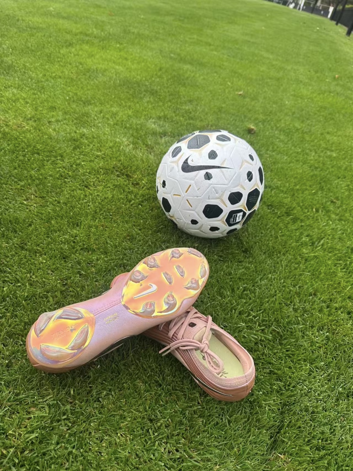先夸颜值——不是那种艳俗的粉,是带点柔光的淡粉叠了层浅紫细闪,光线下会泛点清透的光泽感,配银色Swoosh真的戳中我这种“想低调但忍不住精致”的审美~鞋型是偏流畅的窄版,不会像传统足球鞋那样笨重,日常穿配运动裤/束脚裤都不违和,上周穿它搭了条浅灰卫裤去球场,队友还问我是不是新出的休闲鞋hhh 重点说脚感:本来以为足球鞋会磨脚,结果这双的鞋面包裹感巨舒服!是那种软乎乎的贴合感,脚趾头能活动开但...