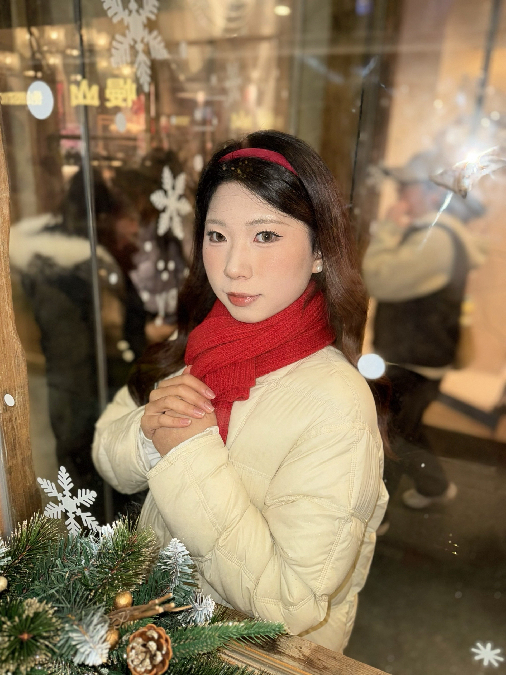 米白色菱形格子羽绒服与红色系的碰撞 这身穿搭主要是米白色和红色为主 红色的围巾和发箍作为点缀 即喜庆又具层次感