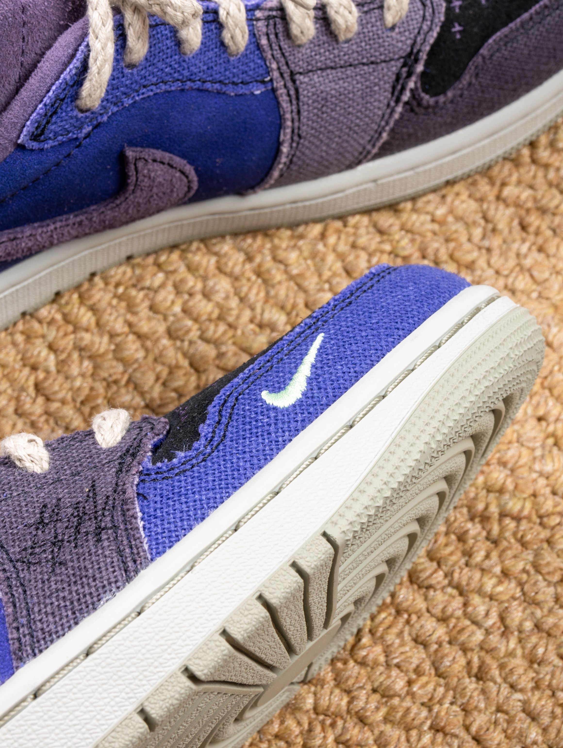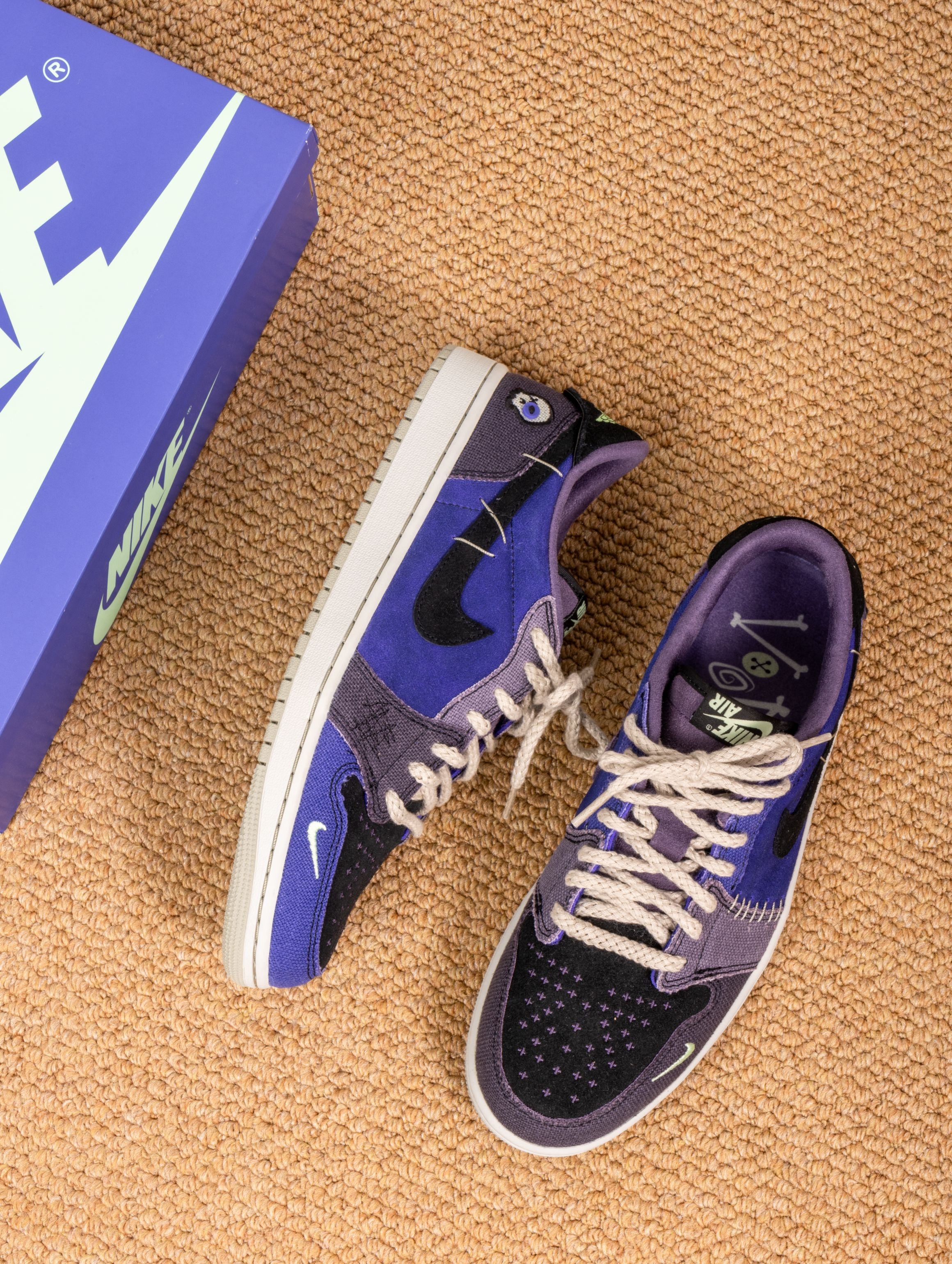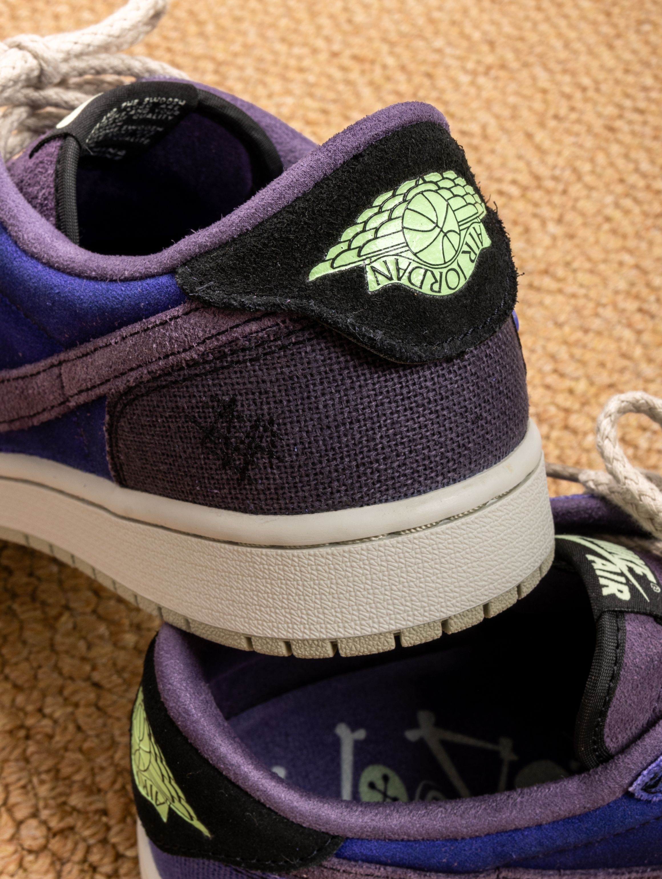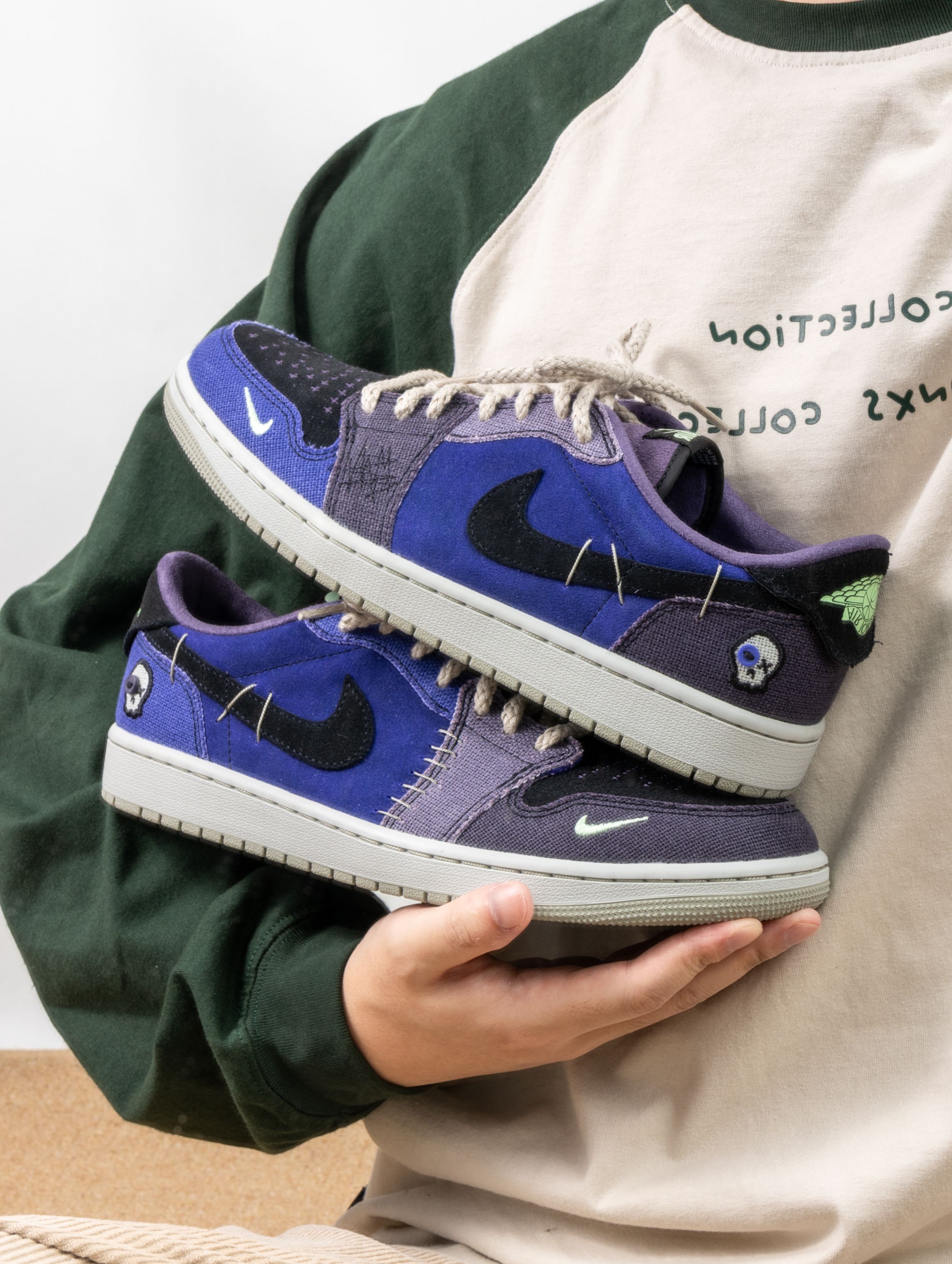 这双Zion联名的AJ1 Low真的帅到失眠!深蓝紫织面像巫毒秘药浸泡过的夜空,鞋身刺绣和做旧中底写满神秘符咒。 上脚意外地舒适,皮质内衬柔软贴合,低帮设计搭配微做旧中底,走路自带慵懒的复古气场。穿它出门总被追问链接,配黑色工装裤或灰调牛仔,一身暗色系却因这抹幽紫而瞬间亮起。 它像一件穿着行走的古老护身符——不必懂巫毒传说,但踩在脚下的每一道纹理,都在替你默念着关于风格的小小咒语。