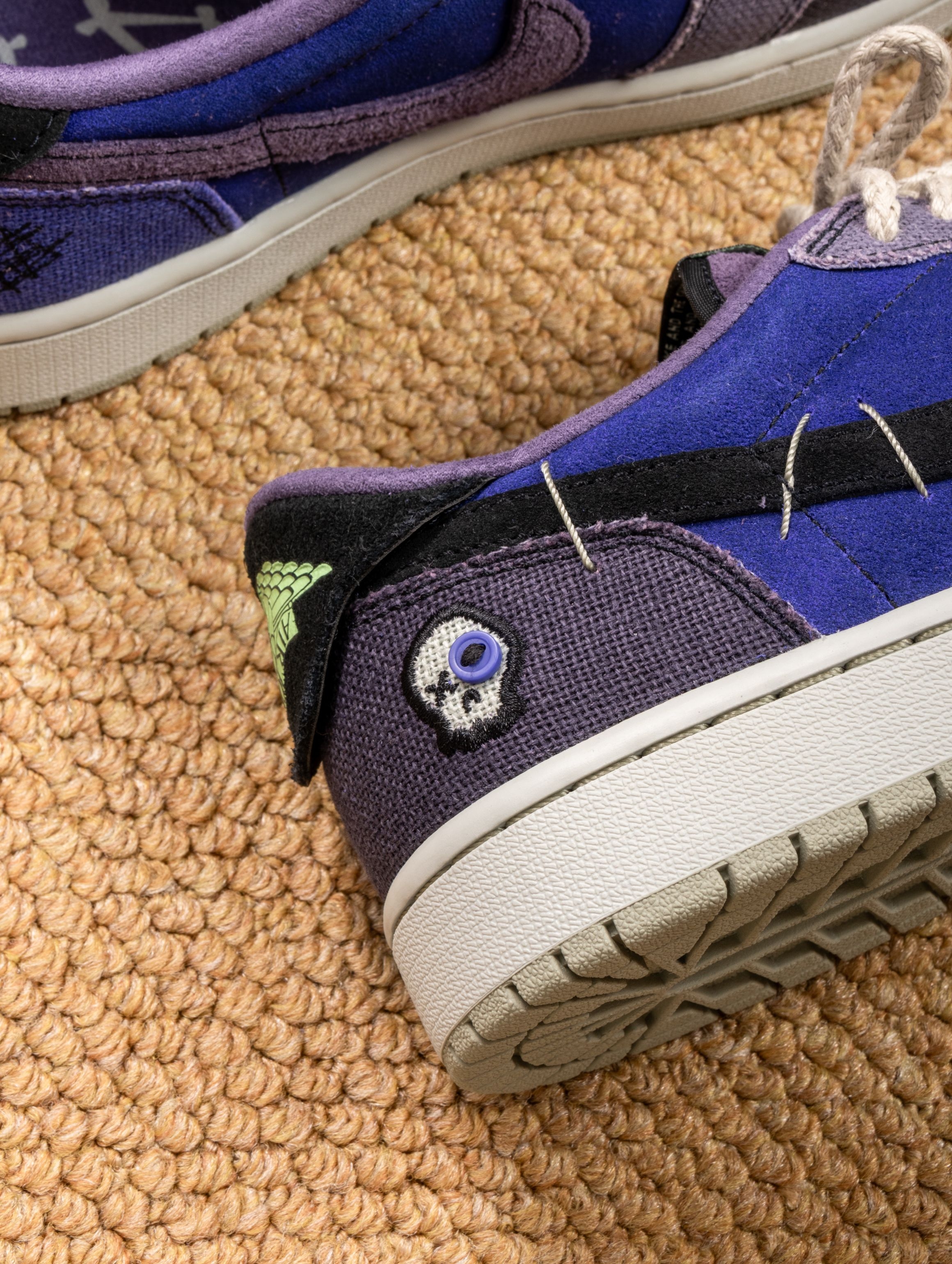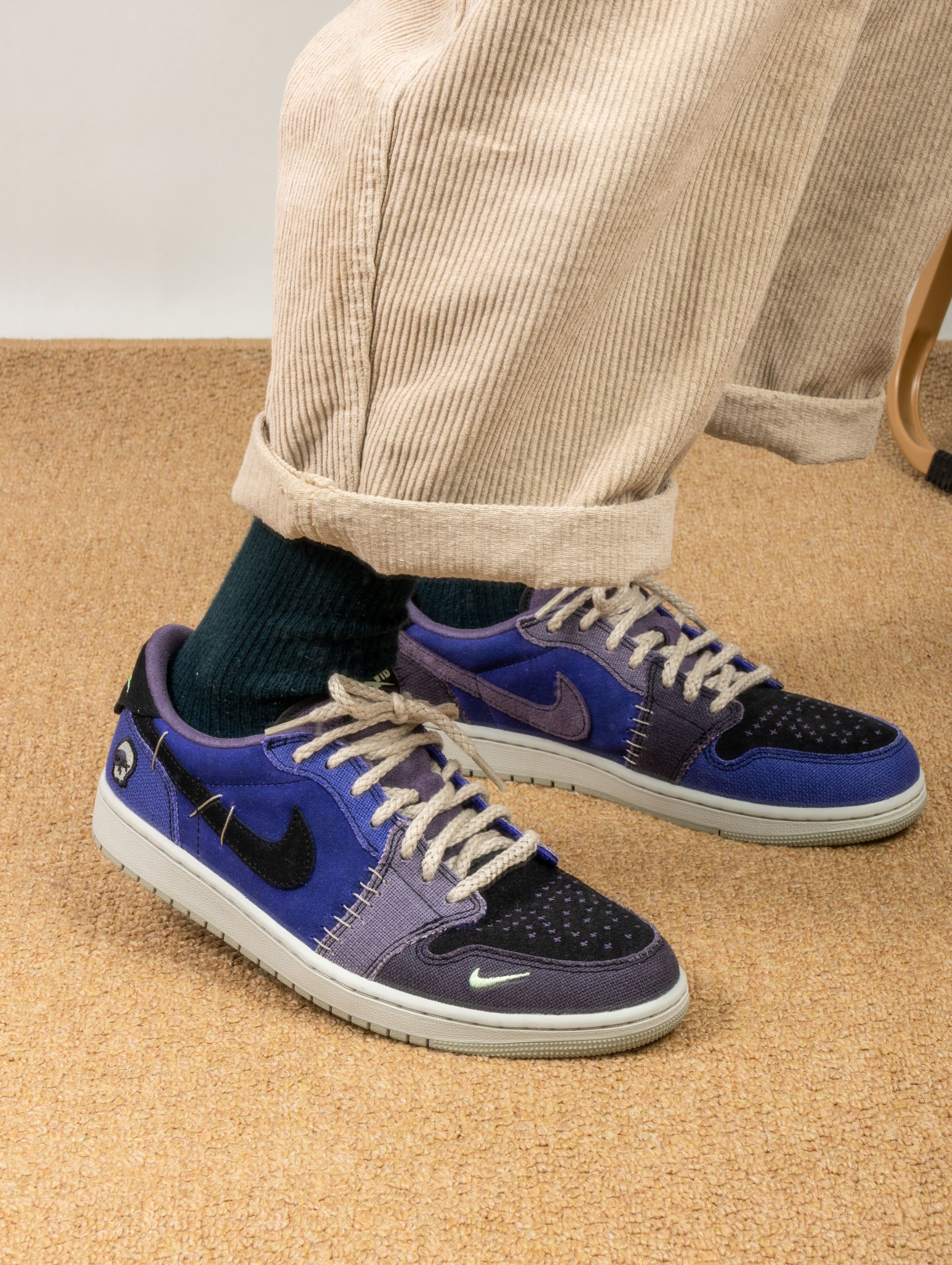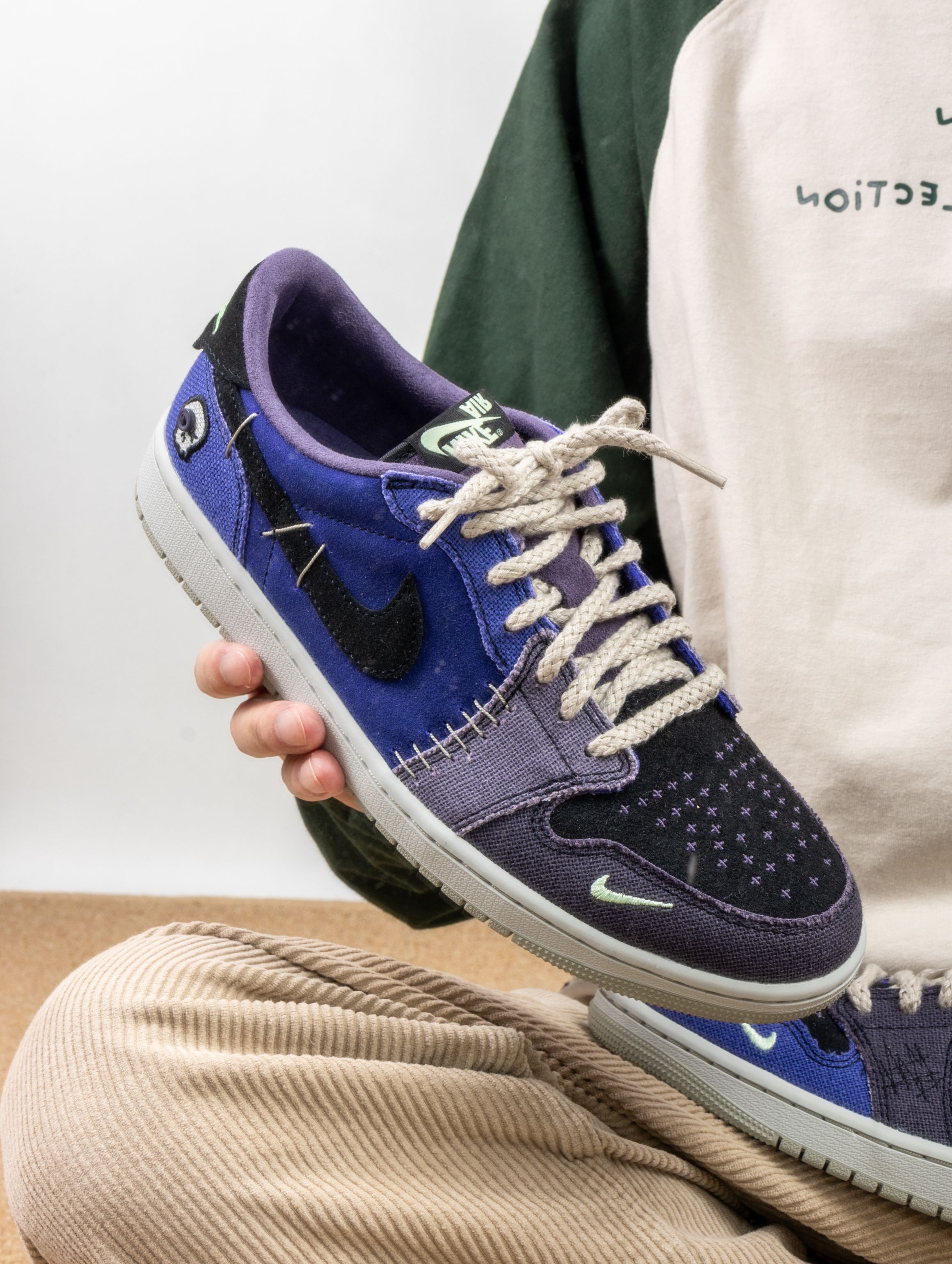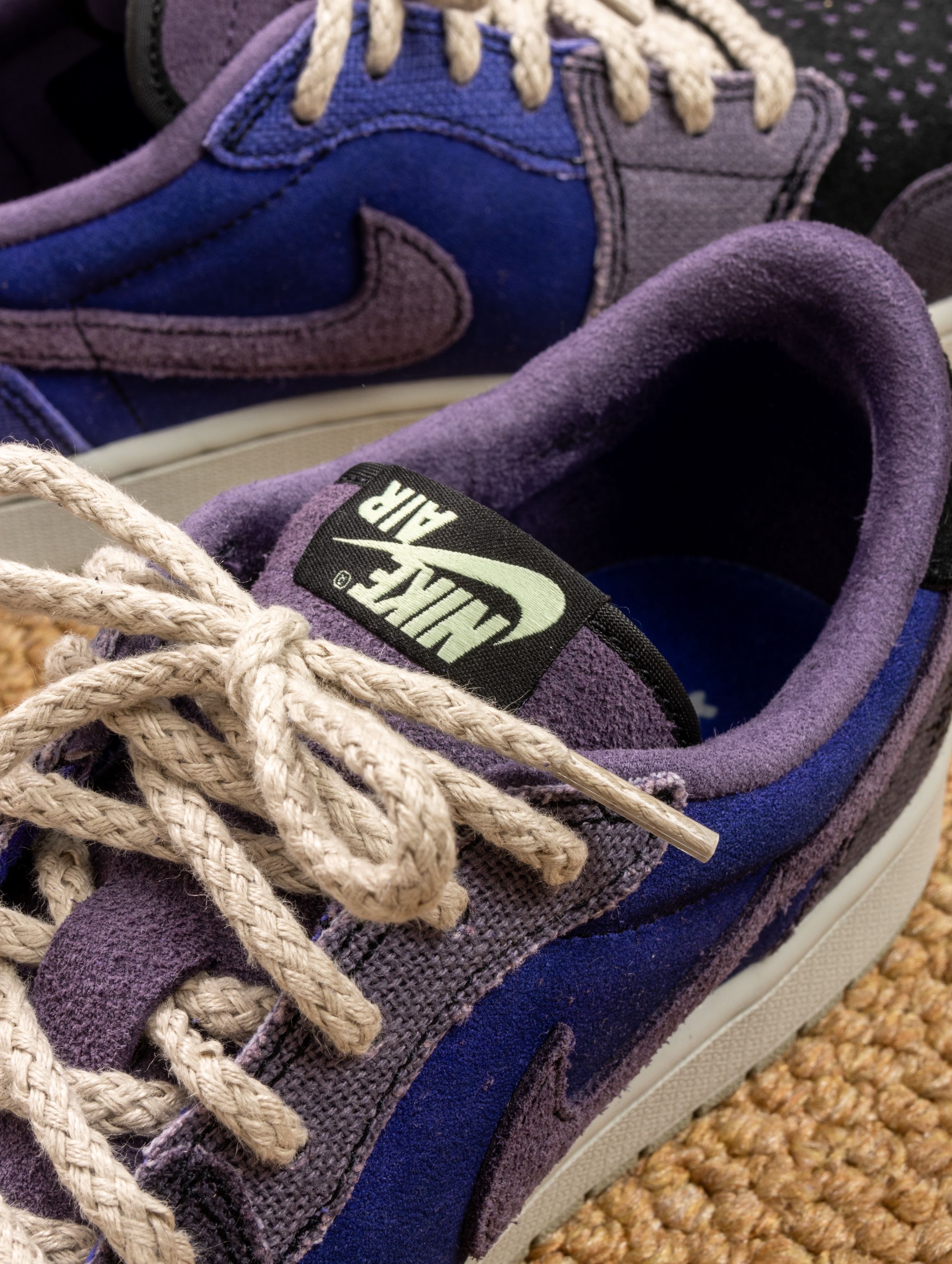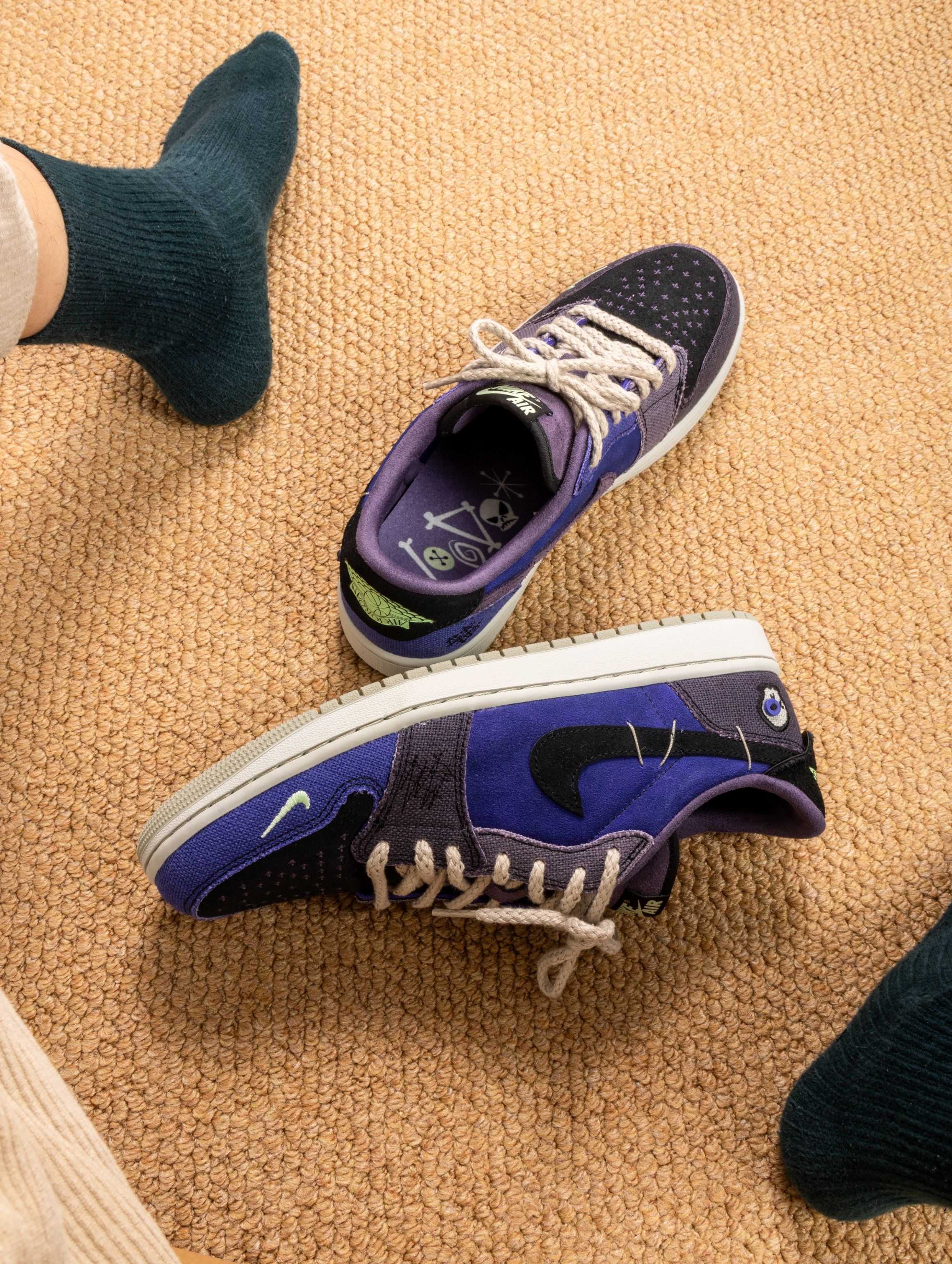 这双Zion联名的AJ1 Low真的帅到失眠!深蓝紫织面像巫毒秘药浸泡过的夜空,鞋身刺绣和做旧中底写满神秘符咒。 上脚意外地舒适,皮质内衬柔软贴合,低帮设计搭配微做旧中底,走路自带慵懒的复古气场。穿它出门总被追问链接,配黑色工装裤或灰调牛仔,一身暗色系却因这抹幽紫而瞬间亮起。 它像一件穿着行走的古老护身符——不必懂巫毒传说,但踩在脚下的每一道纹理,都在替你默念着关于风格的小小咒语。