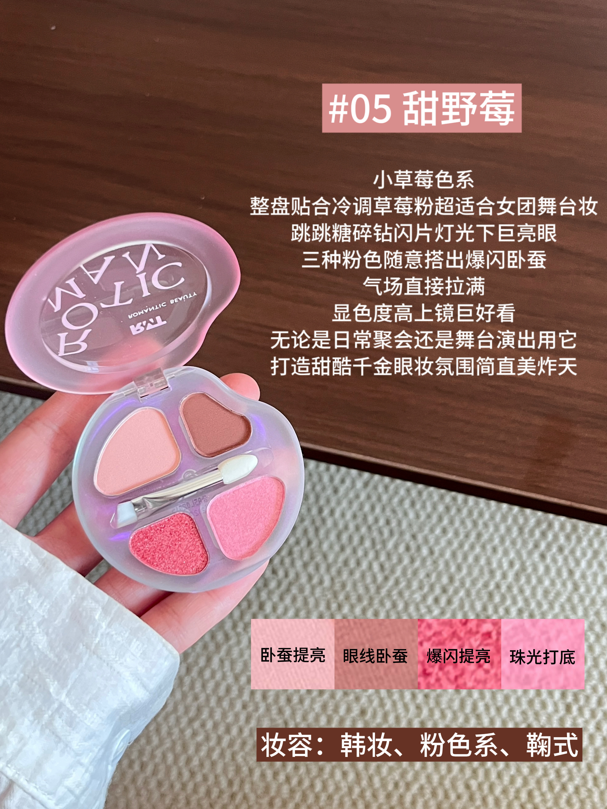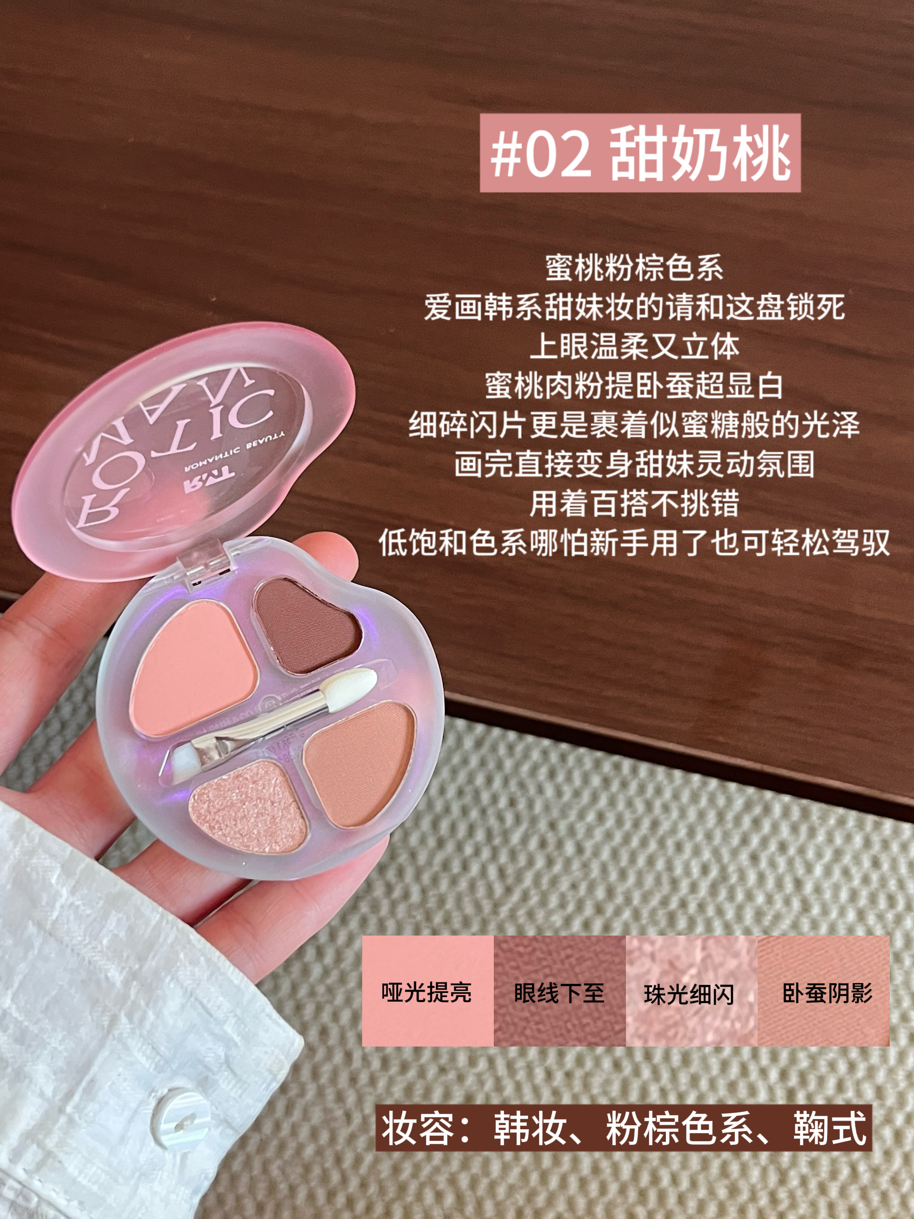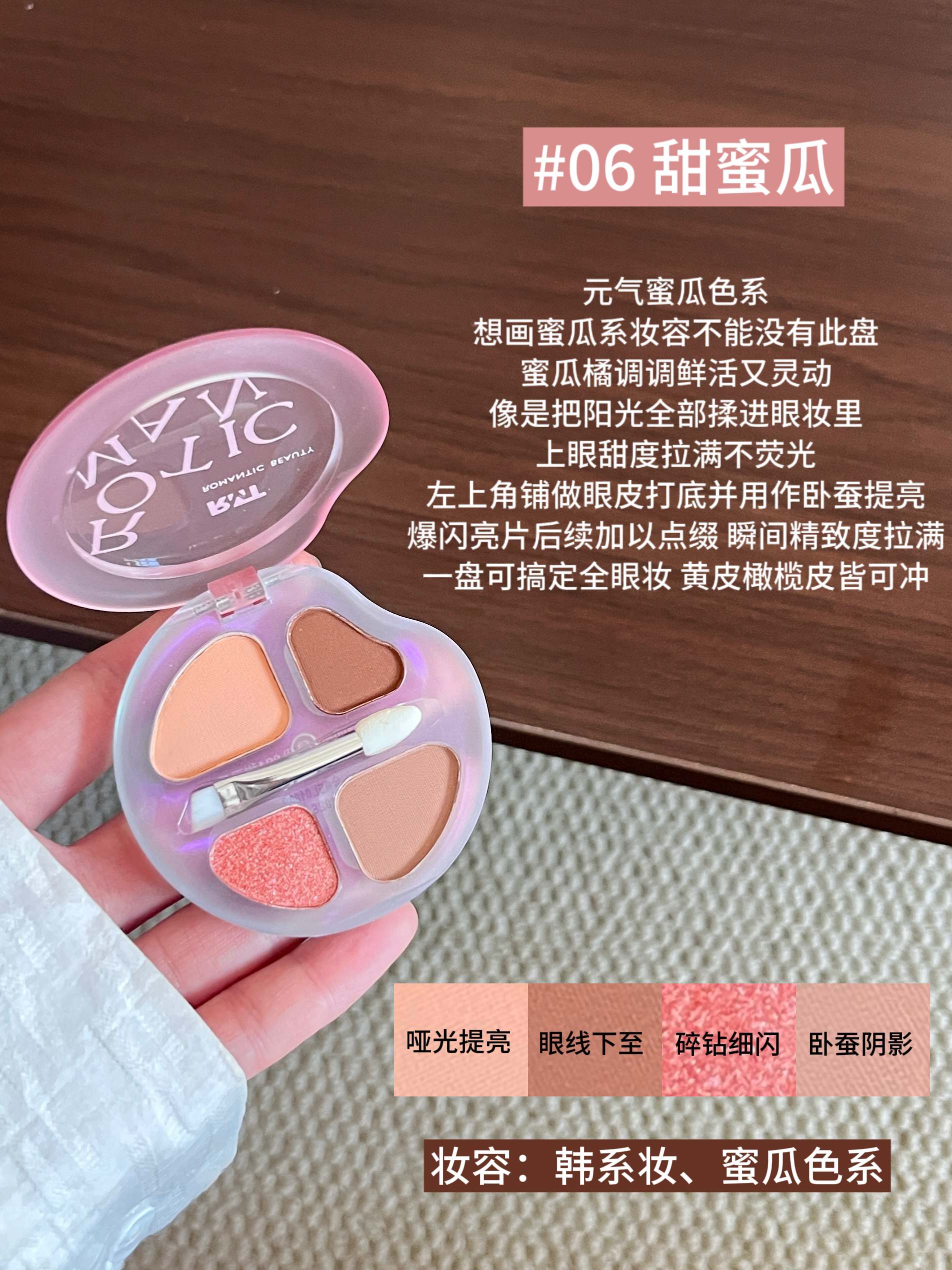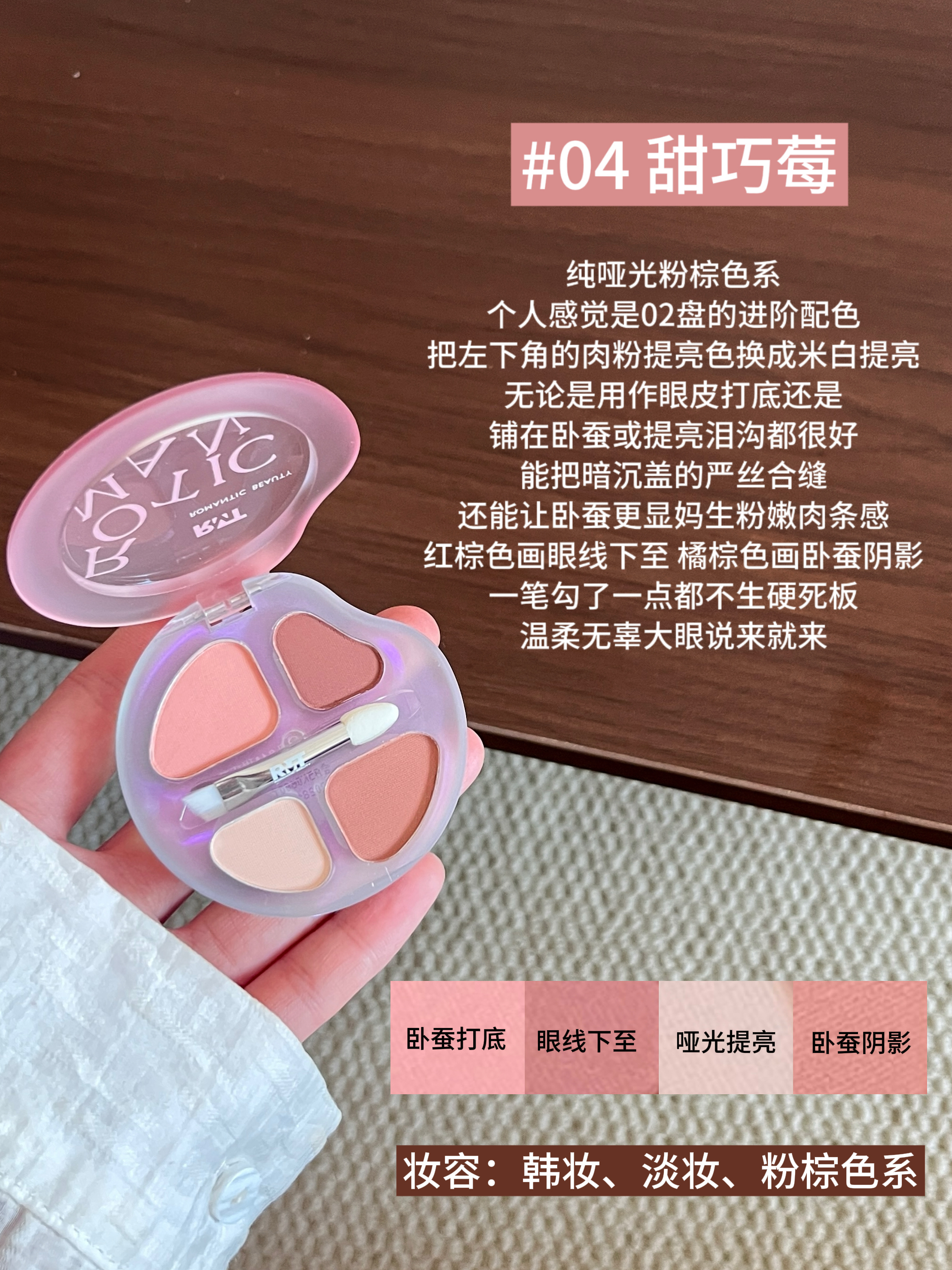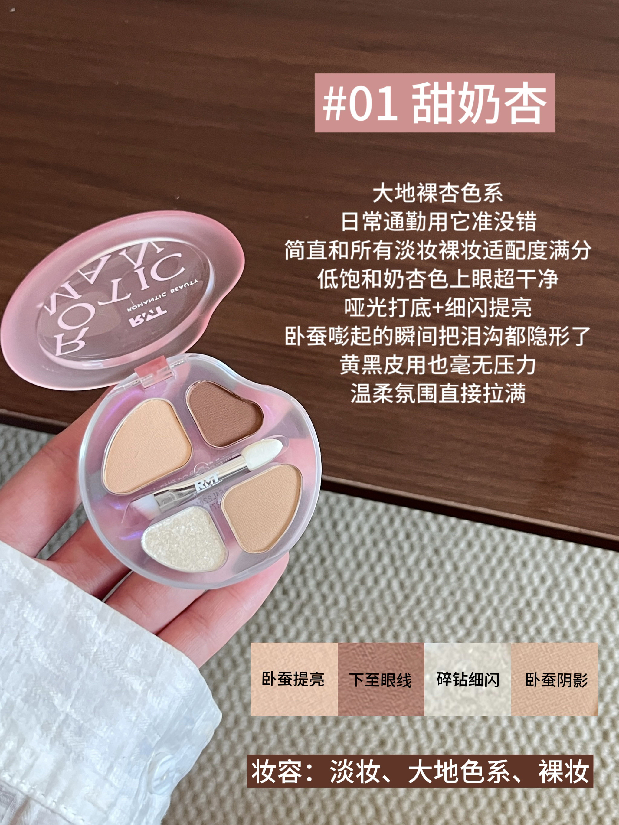 本篇笔记关联了romantic beauty/罗小曼 四色卧蚕眼影综合一体盘 持久防水放大双眼哑光提亮阴影下至晕染 2.5g 03甜奶瓜、romantic beauty/罗小曼 四色卧蚕眼影综合一体盘 持久防水放大双眼哑光提亮阴影下至晕染 2.5g 02甜奶桃、romantic beauty/罗小曼 四色卧蚕眼影综合一体盘 持久防水放大双眼哑光提亮阴影下至晕染 2.5g 01甜奶杏等商品,为用户提供真实的使用体验和购买参考。