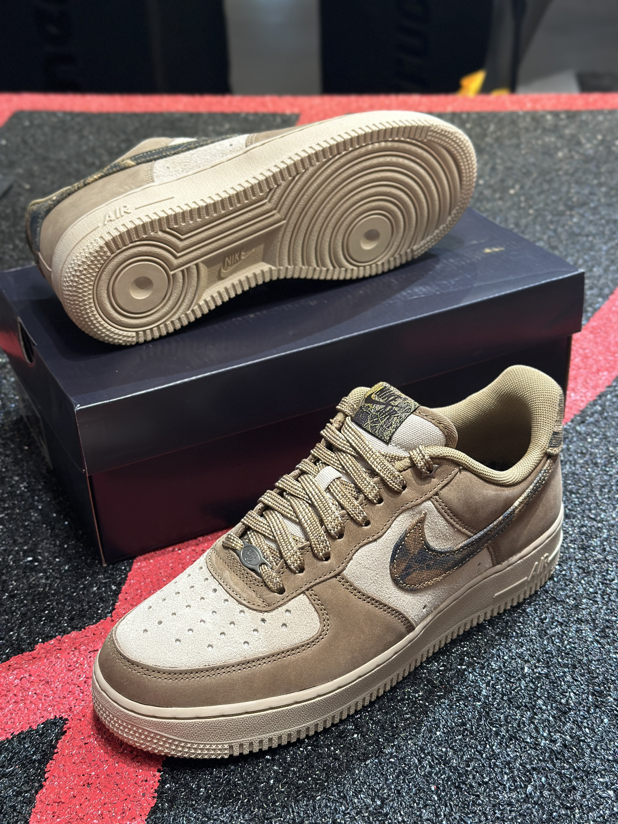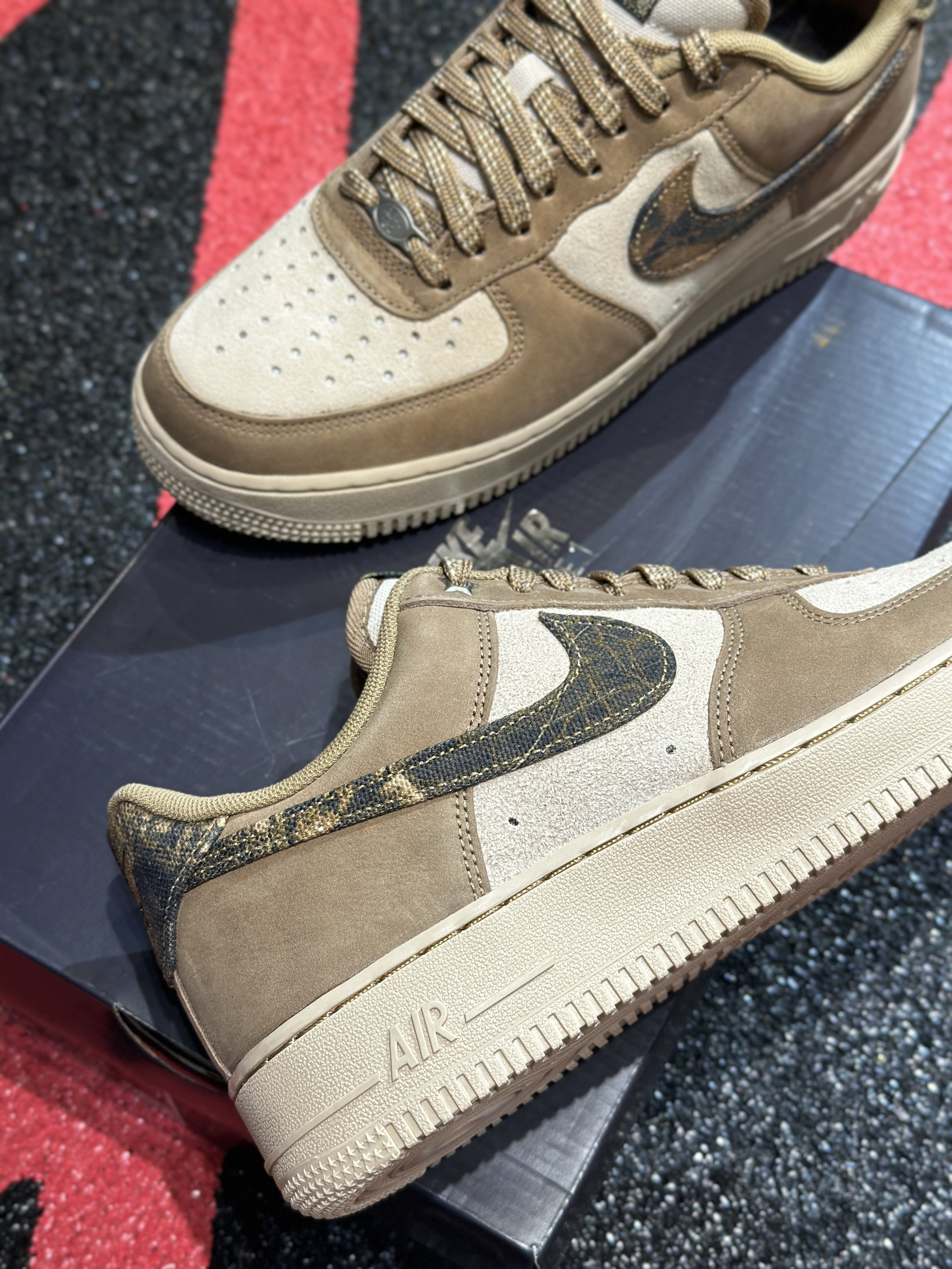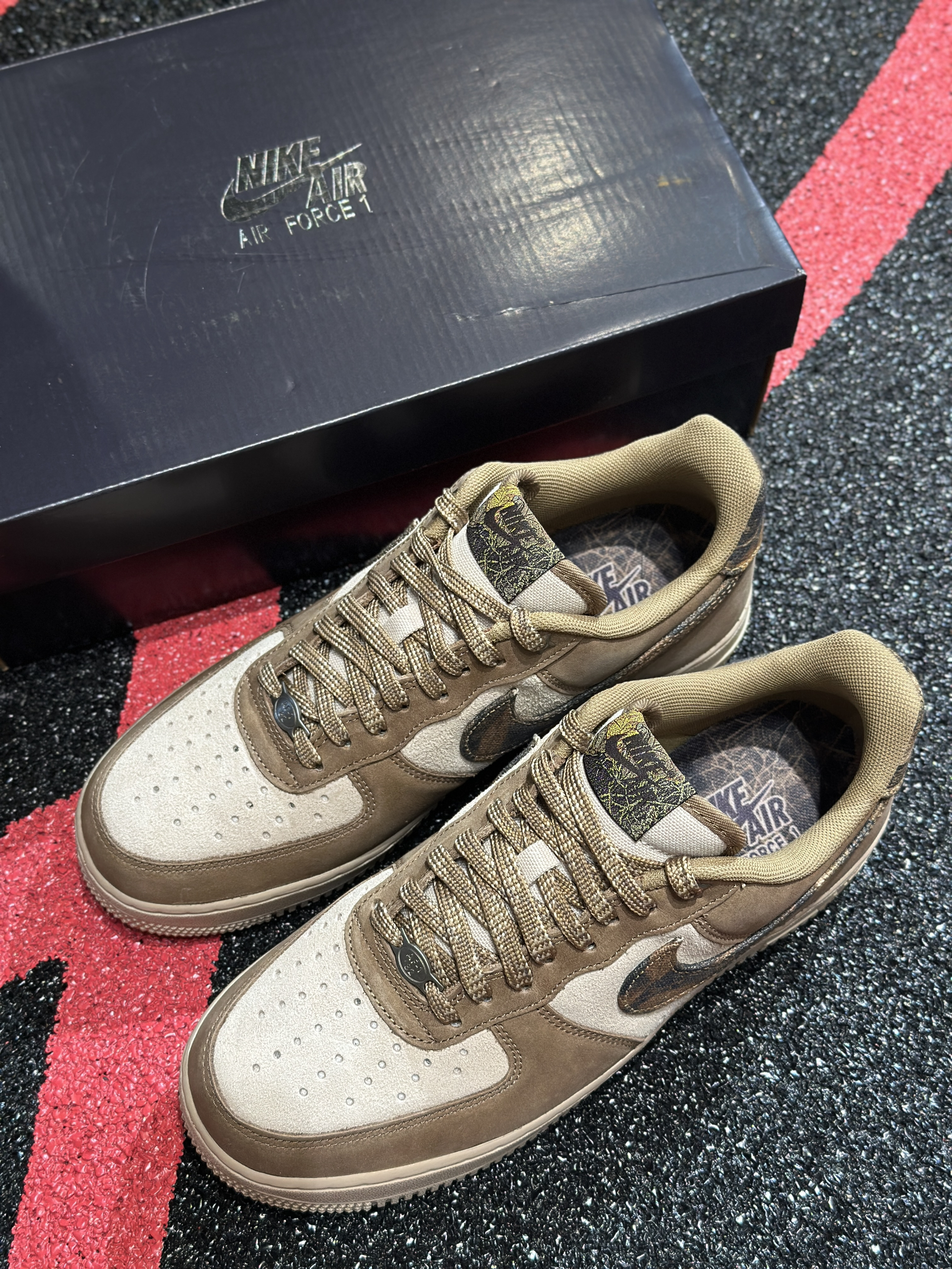 ▫️新拆的AF1棕调款也太有味道了!麂皮拼接的质感摸着超绝 ▫️鞋身的迷彩勾细节拉满,棕白配色复古又高级 ▫️上脚脚感很稳,搭工装裤、休闲裤都超有氛围感,直接列入近期最爱~