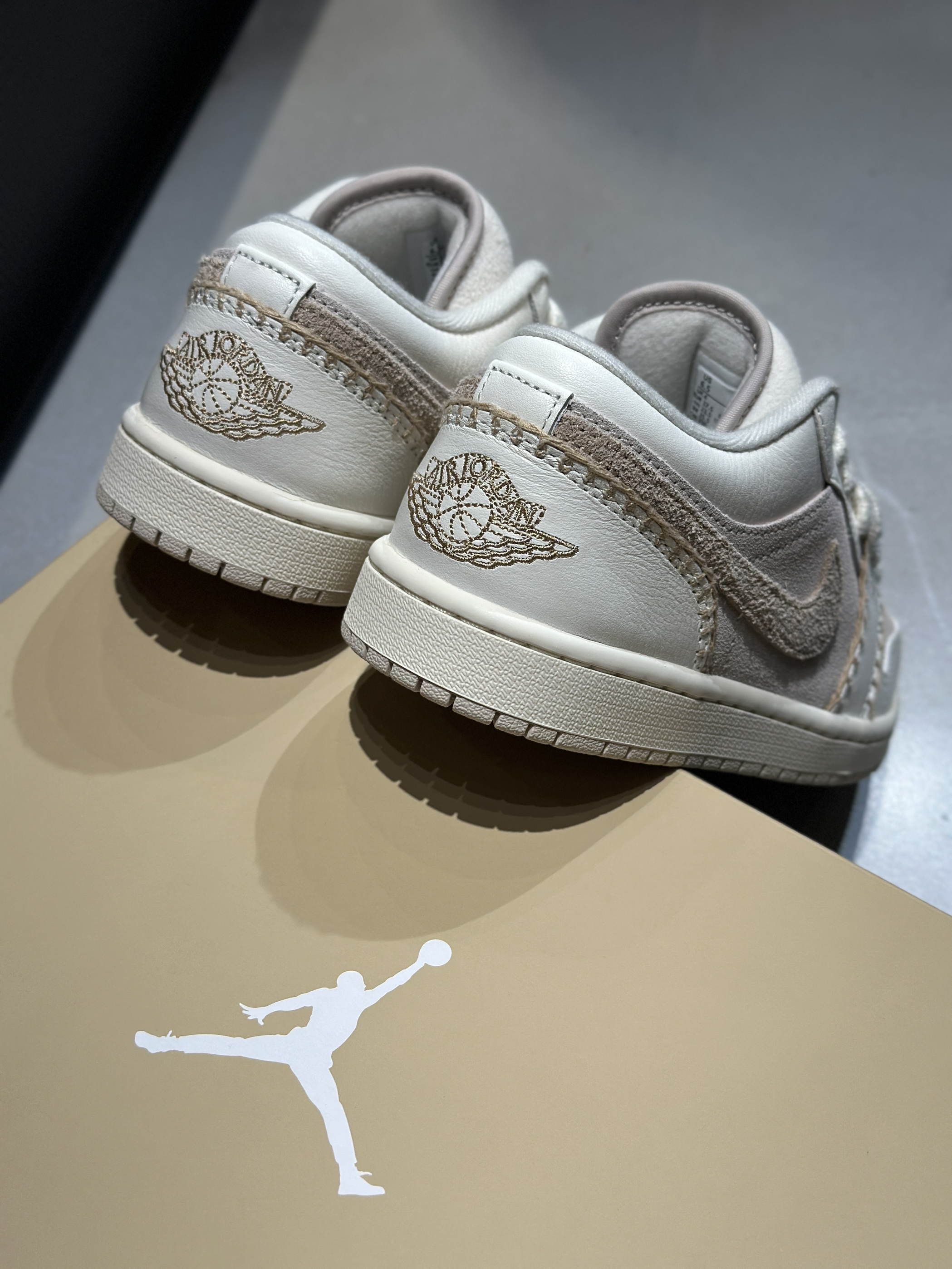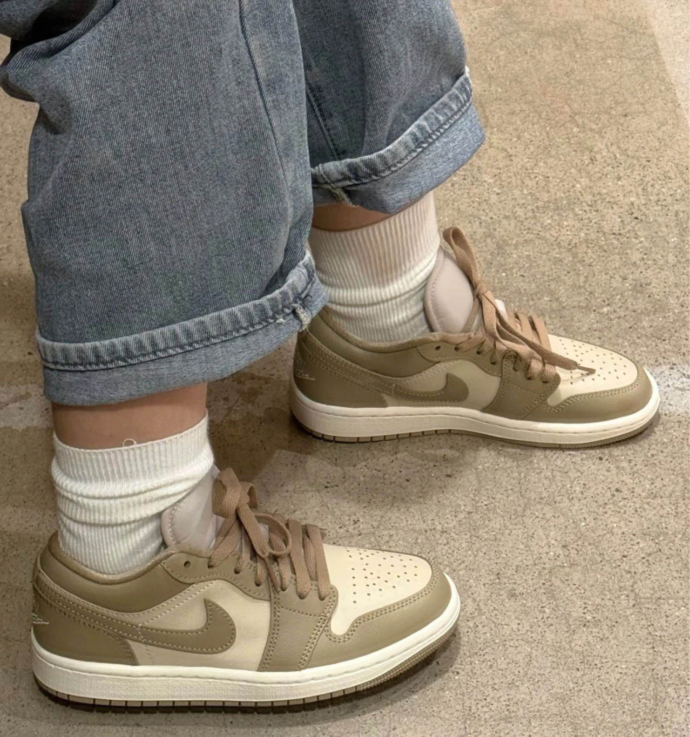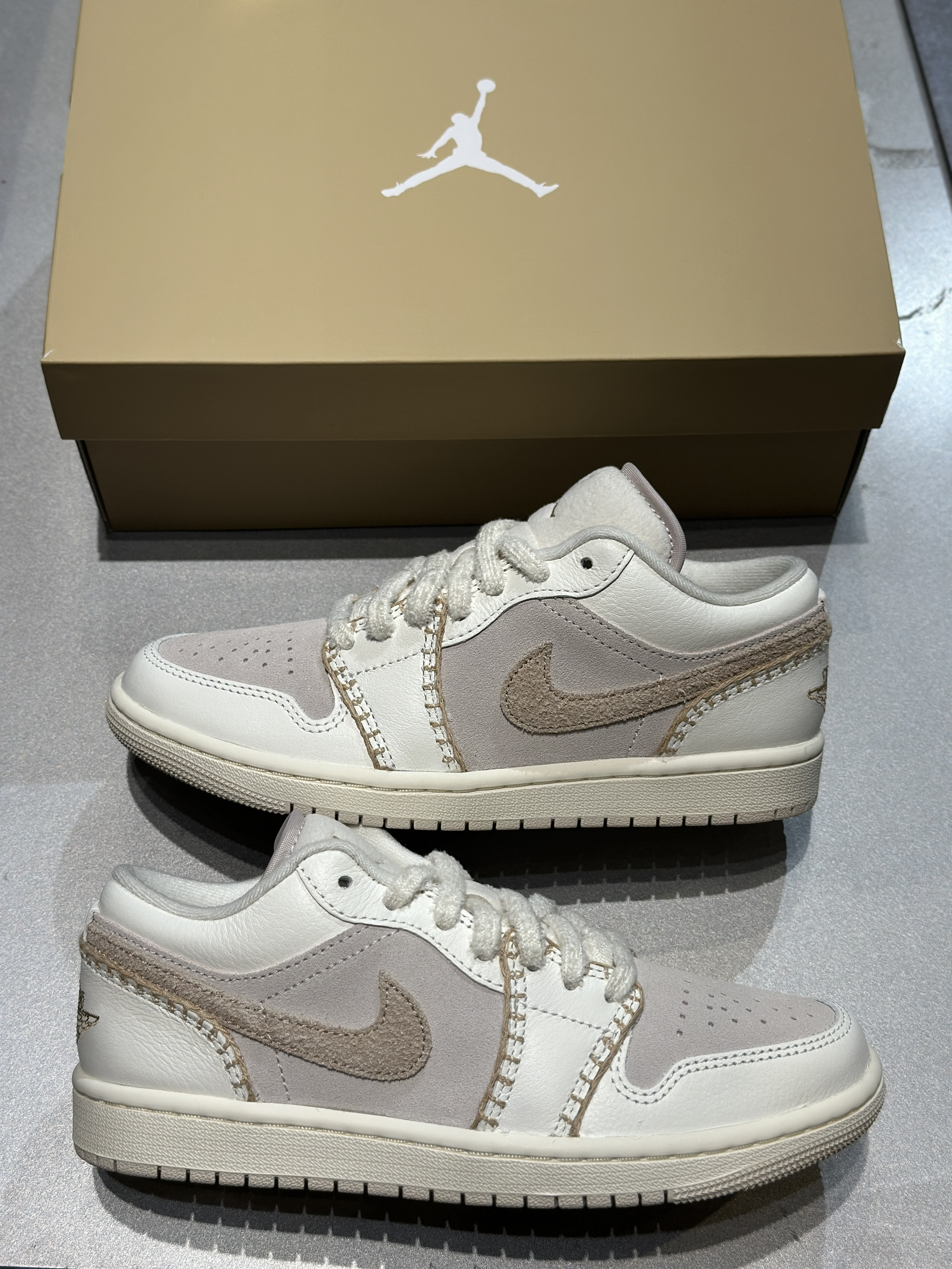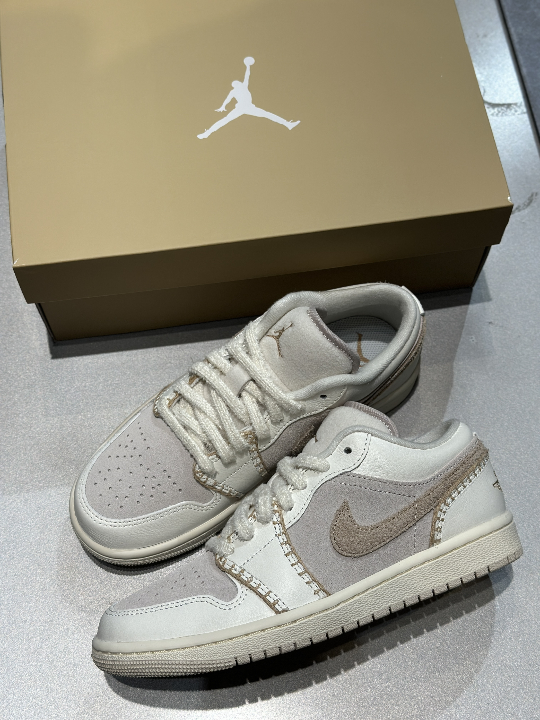 ┆新入的AJ1米灰款也太温柔了吧!奶白拼浅灰的配色软乎乎的 ┆麂皮勾+明线设计细节感拉满,麂皮和皮革拼接的质感超棒 ┆上脚脚感很轻盈,搭小裙子或休闲裤都超适配,直接爱到不行~