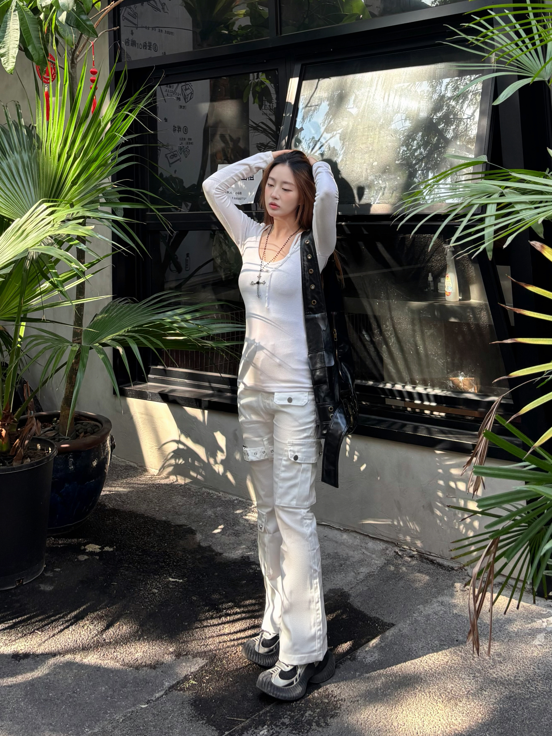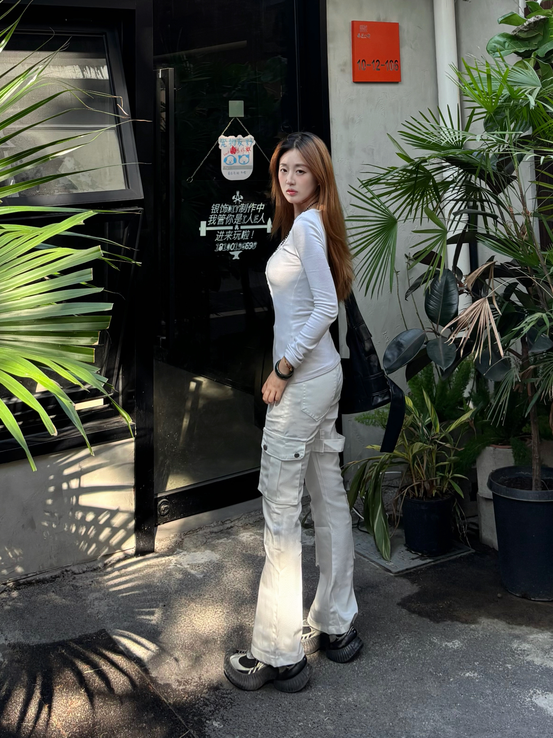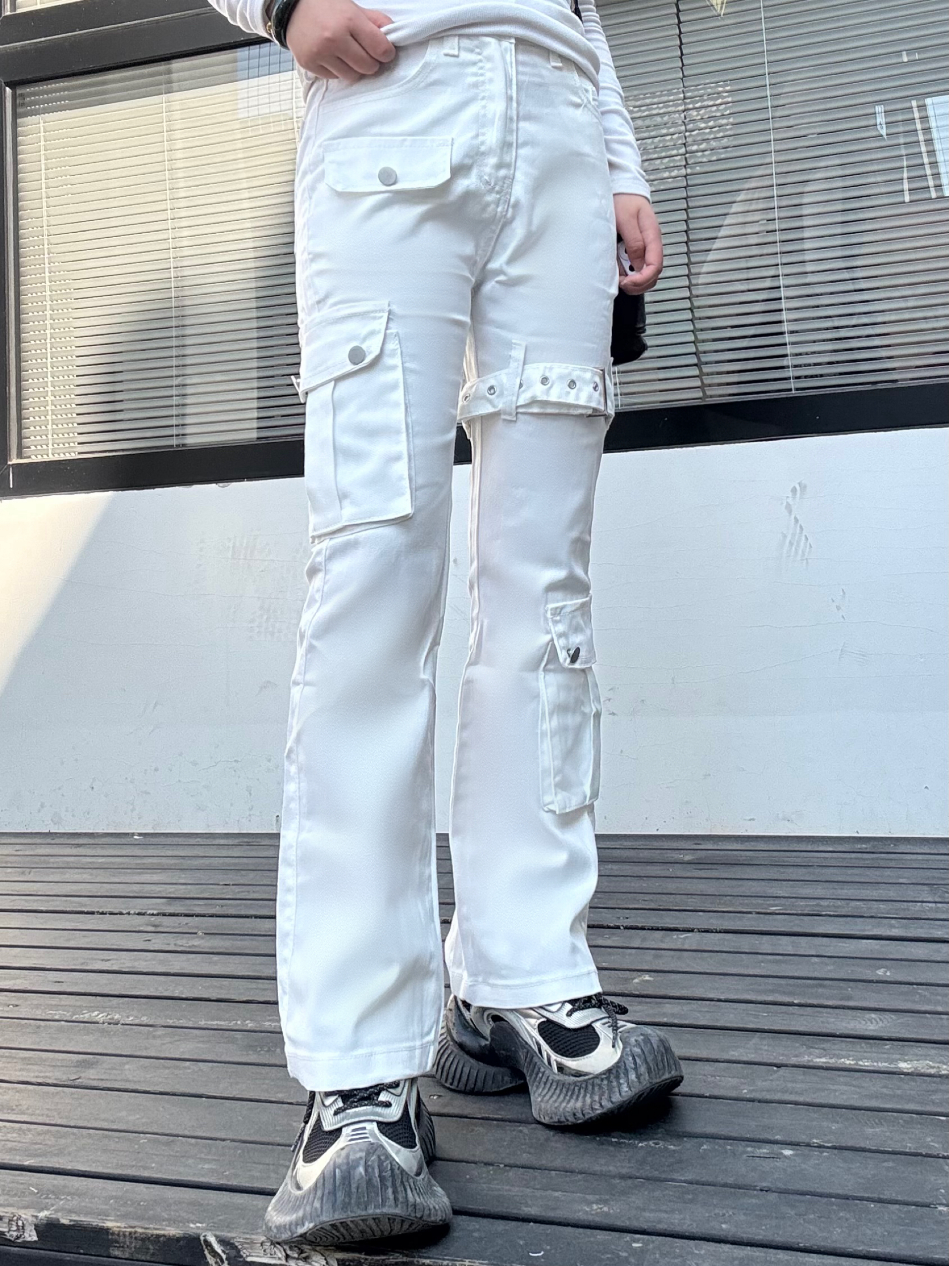 白色裤子初尝试 意外惊喜不止黑色才可以酷酷哦 工装版型绑带设计很潮流! 小微喇设计更显腿直