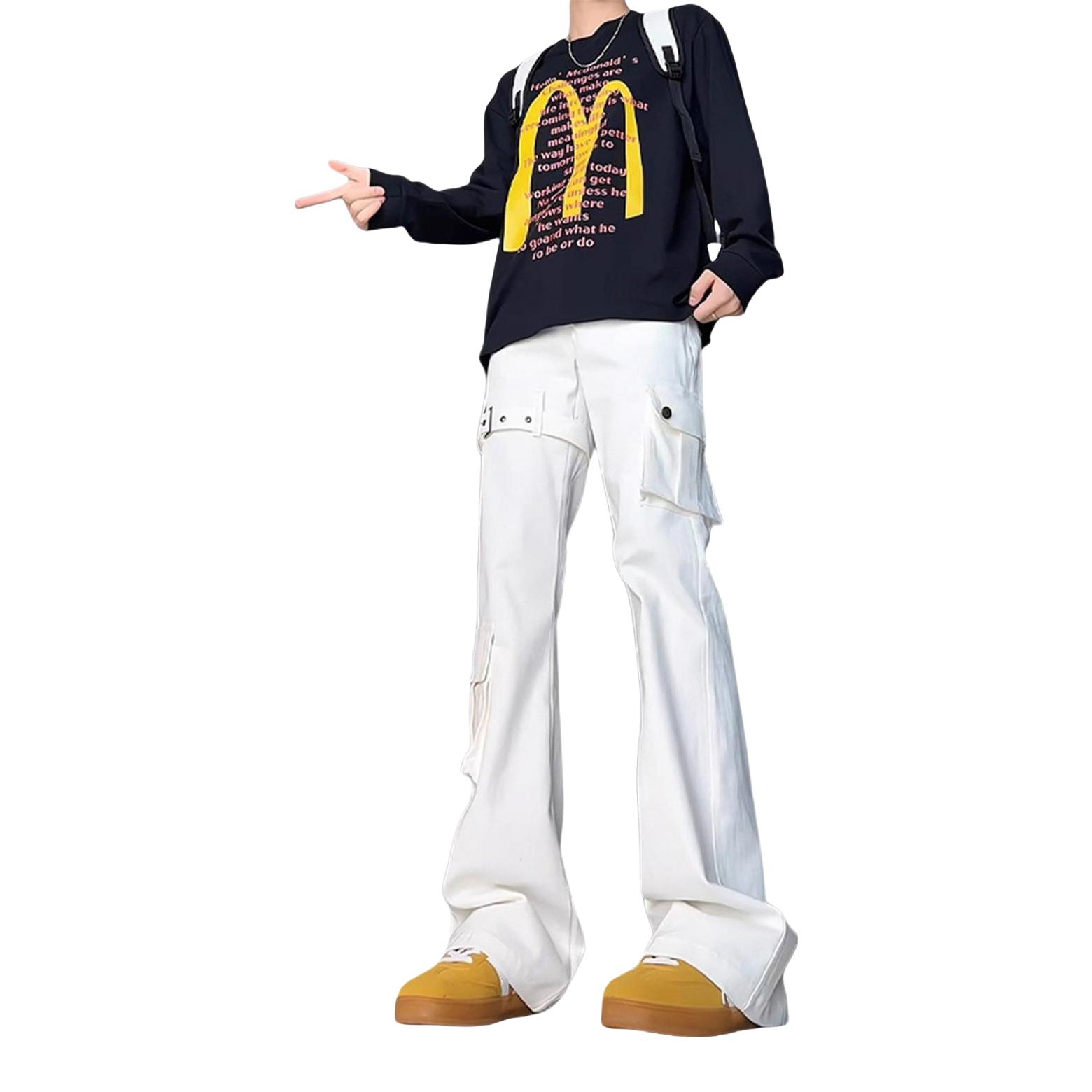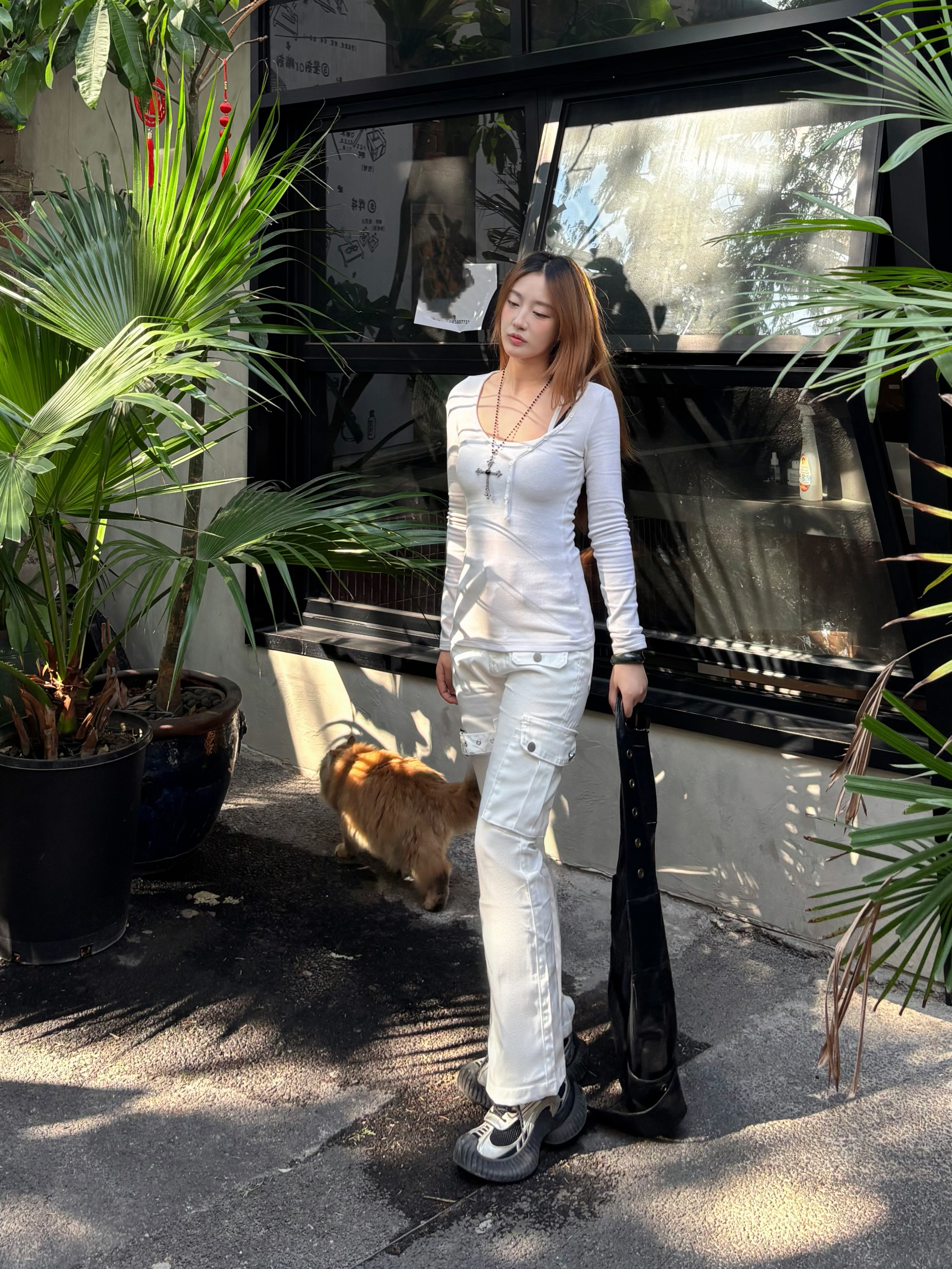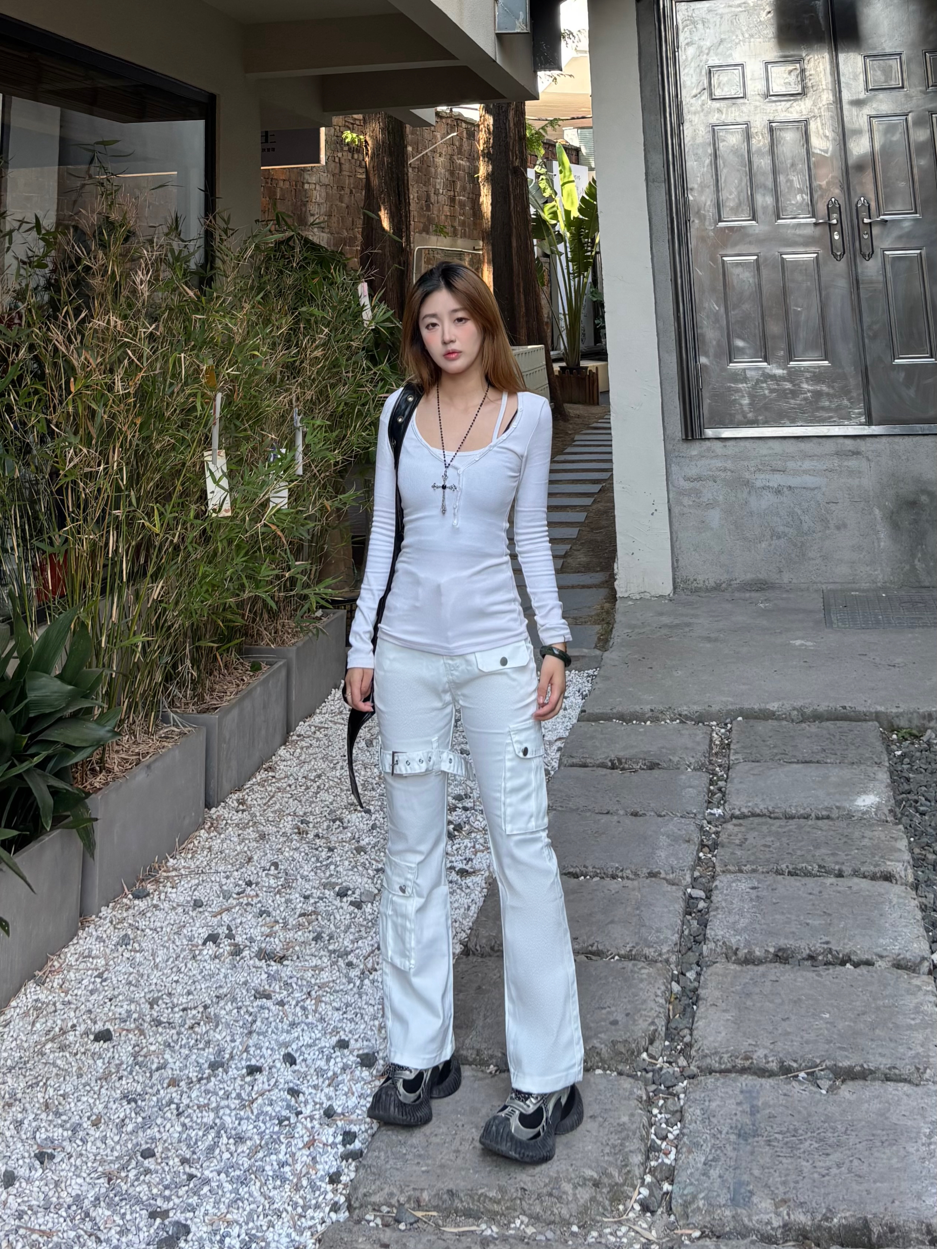 白色裤子初尝试 意外惊喜不止黑色才可以酷酷哦 工装版型绑带设计很潮流! 小微喇设计更显腿直
