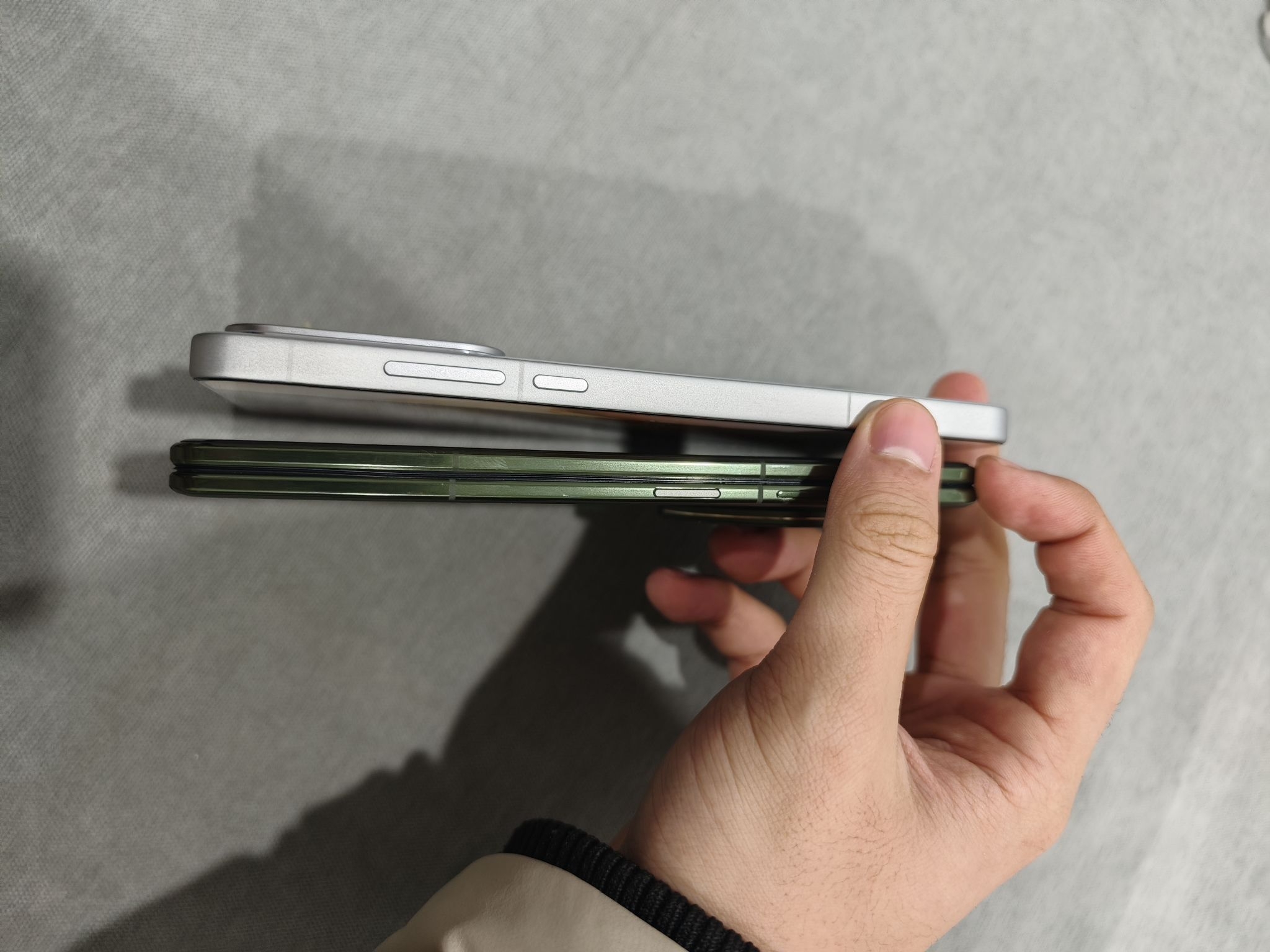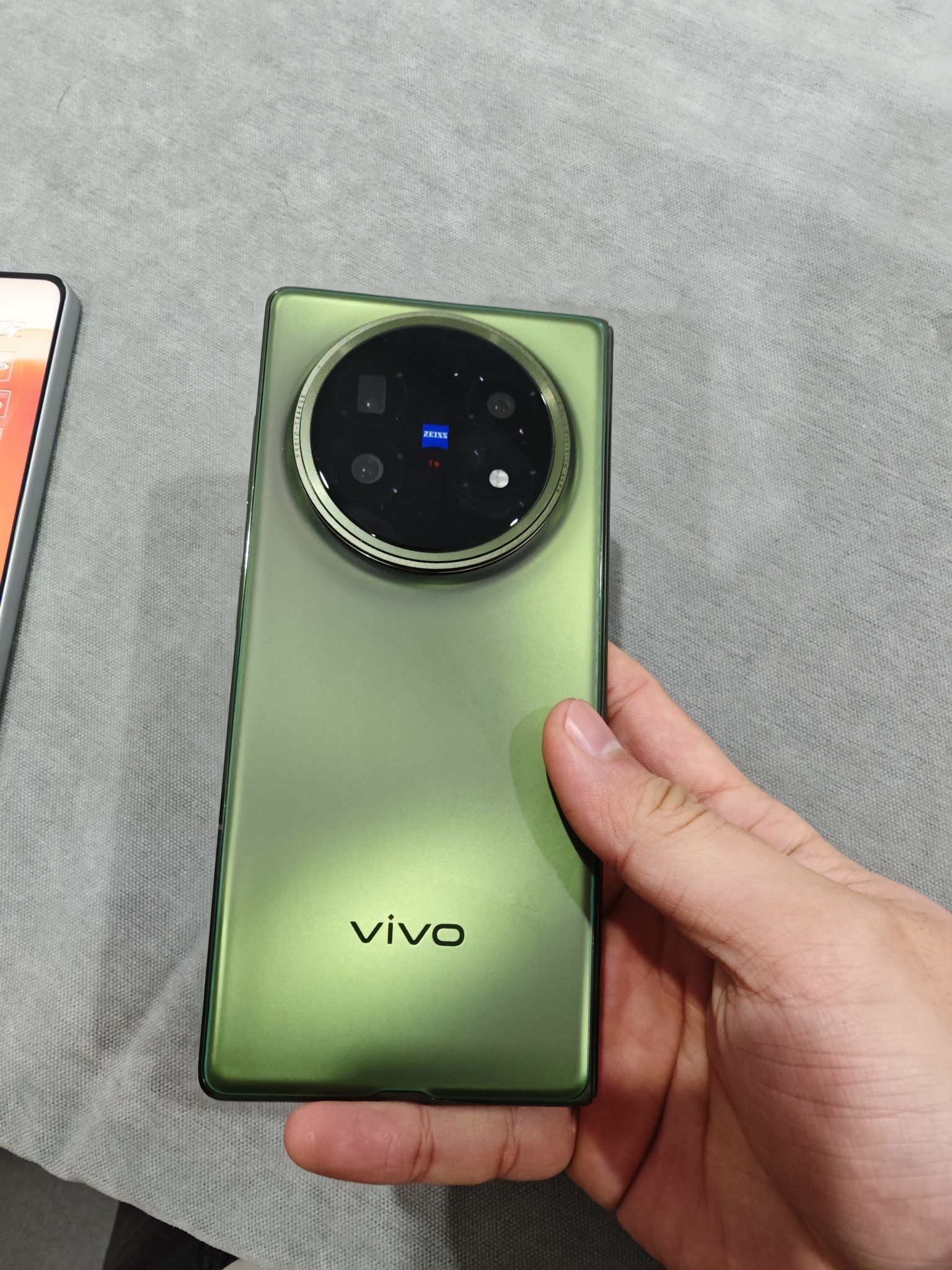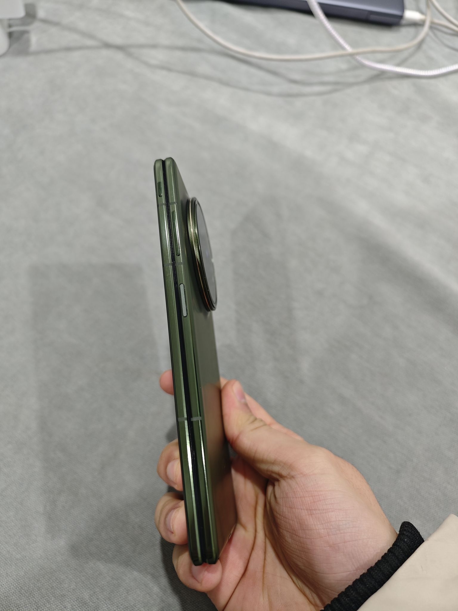 拿在手里完全没有“板砖感”,单手握持居然也不费劲。 背板的绿调很有质感,不是那种艳俗的绿,暗光下偏墨绿,光线足的时候又透出点清透的翠色,蔡司镜头圈的金属边点缀得刚好,商务又不沉闷。 折痕这块也得夸,展开屏幕几乎看不出折痕,刷视频、划页面的时候视觉上很连贯,日常用完全不会在意。而且铰链处的阻尼感做得特别好,开合的时候很稳,不会松松垮垮的。
